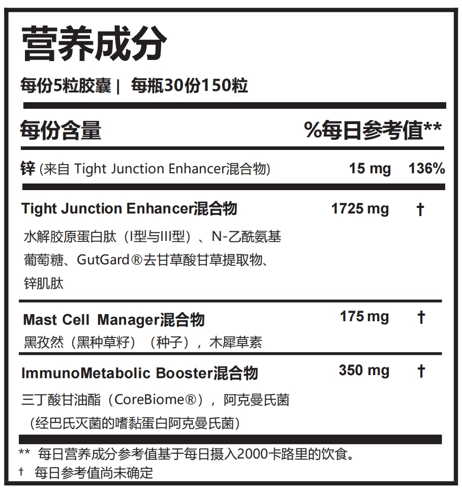 功能良好的肠道屏障对整体健康至关重要。健康的肠道屏障可以吸收关键的营养物质,同时阻止不需要的物质的吸收。不含芦荟和谷氨酰胺(可能会引起不良副作用),这款配方反而提供了富含甘氨酸、脯氨酸和羟脯氨酸的胶原蛋白肽(I型和III型),以及其他关键营养素以支持肠道内壁的完整性。RenewGut Thrive™ 以 RenewGut™ 配方为基础,还富含后生元,包括三丁酸甘油酯和巴氏杀菌的 Akkermansia。肠道屏障的正常状态与整体健康管理密切相关,其生理功能涉及营养吸收与物质筛选的协调过程。RenewGut Thrive™ 的成分组合与肠道屏障的协调状态、代谢相关生理过程及免疫相关的日常状态存在关联,为日常肠道养护提供选择。将 RenewGut Thrive™ 与您喜爱的益生菌(如 Multi-Biome™ 或 CoreBiotic®)相结合,以进一步滋养胃肠道。