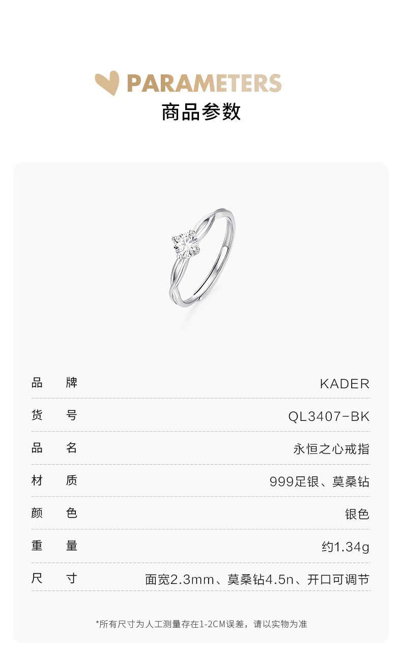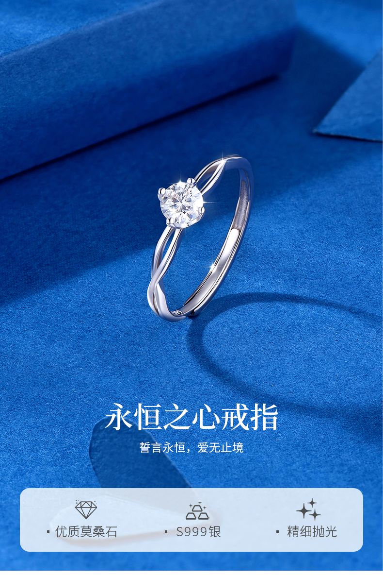 卡蒂罗/KADER 莫桑钻爆闪 莫比乌斯系列 永恒之心戒指 足银999简约线条璀璨闪耀开口可调节单戒一只 轻奢大气高级感