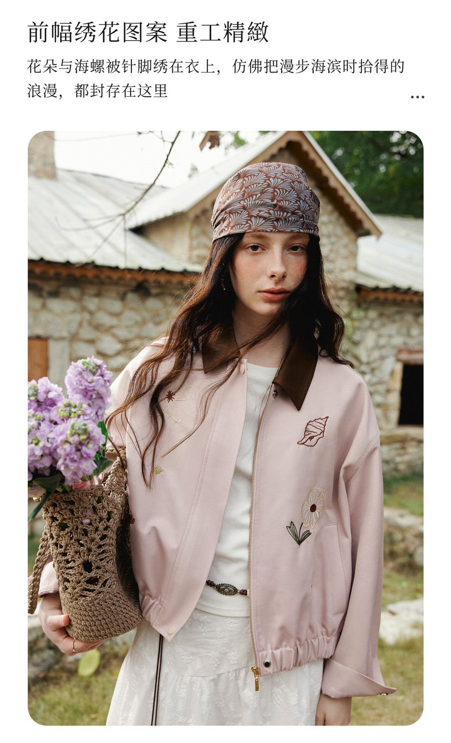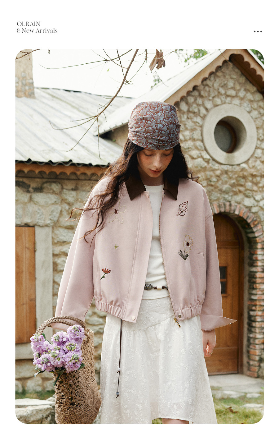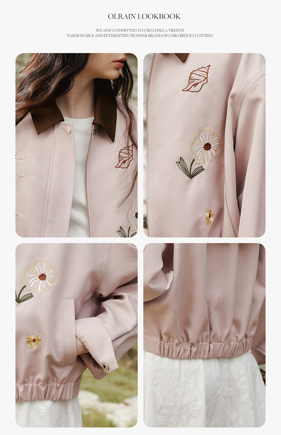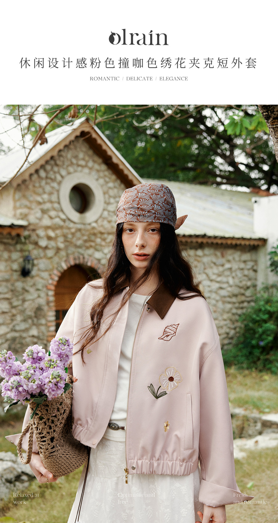 欧芮儿休闲设计感粉色撞咖色绣花短外套女春季2026新款夹克上衣