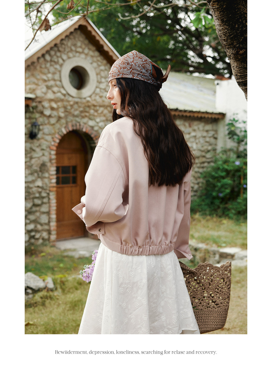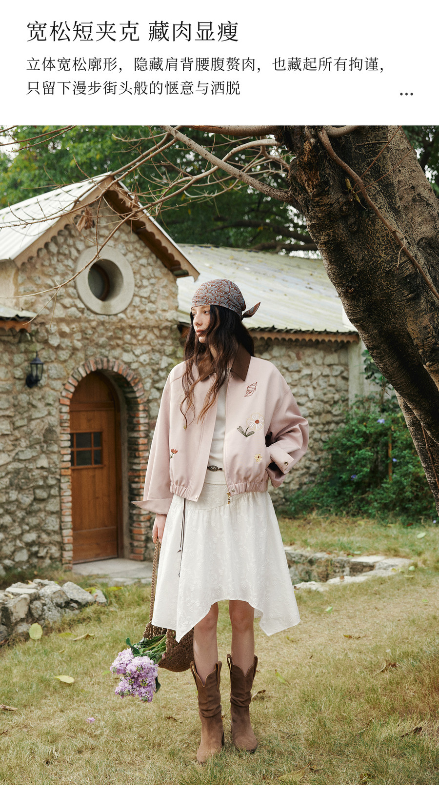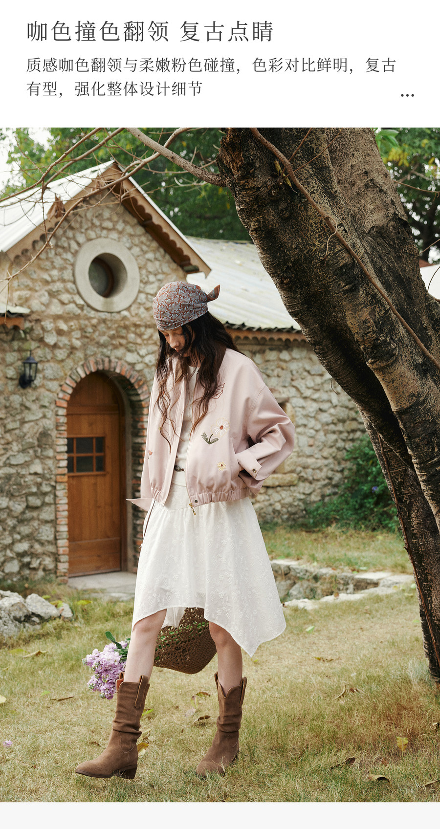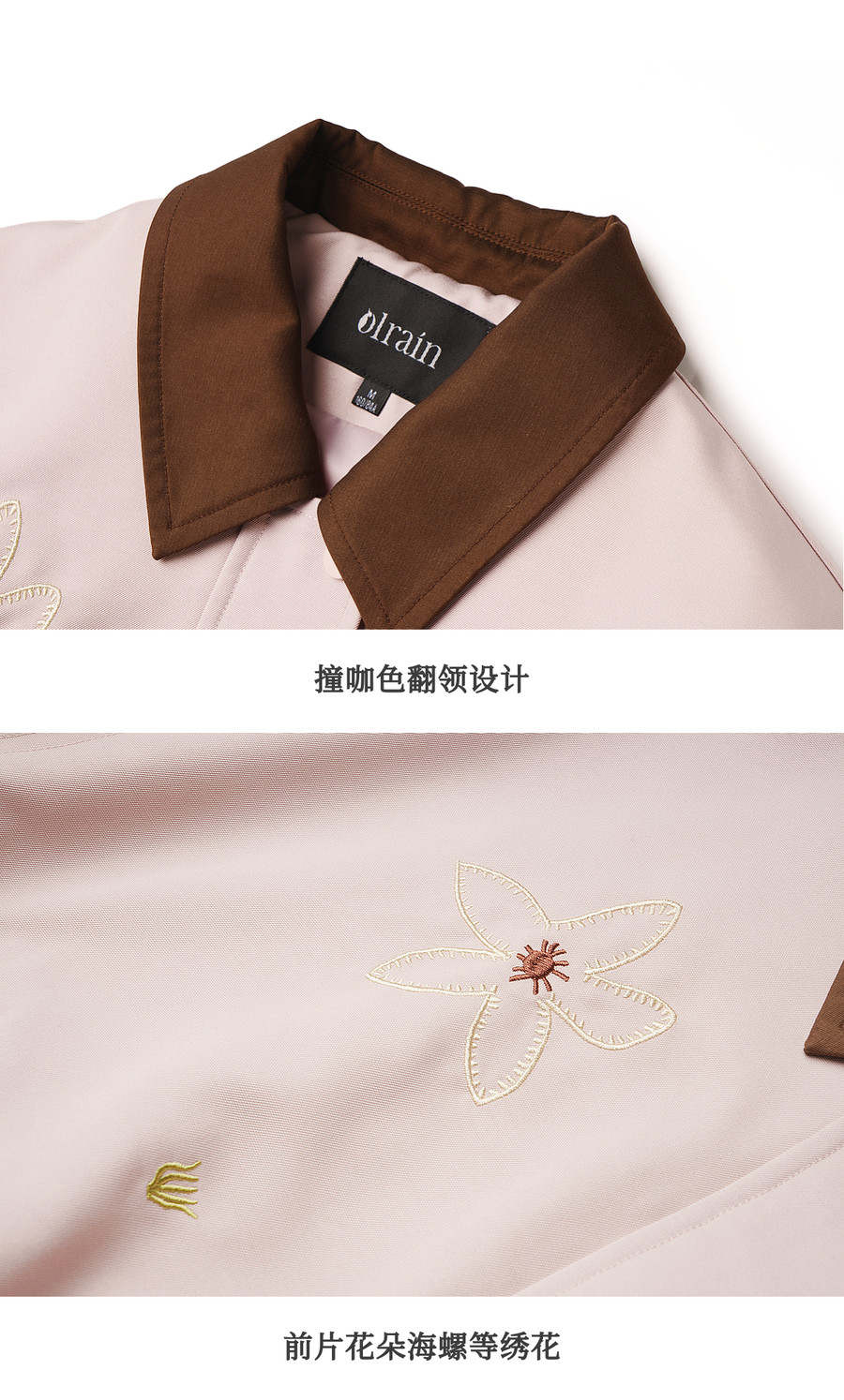 欧芮儿休闲设计感粉色撞咖色绣花短外套女春季2026新款夹克上衣