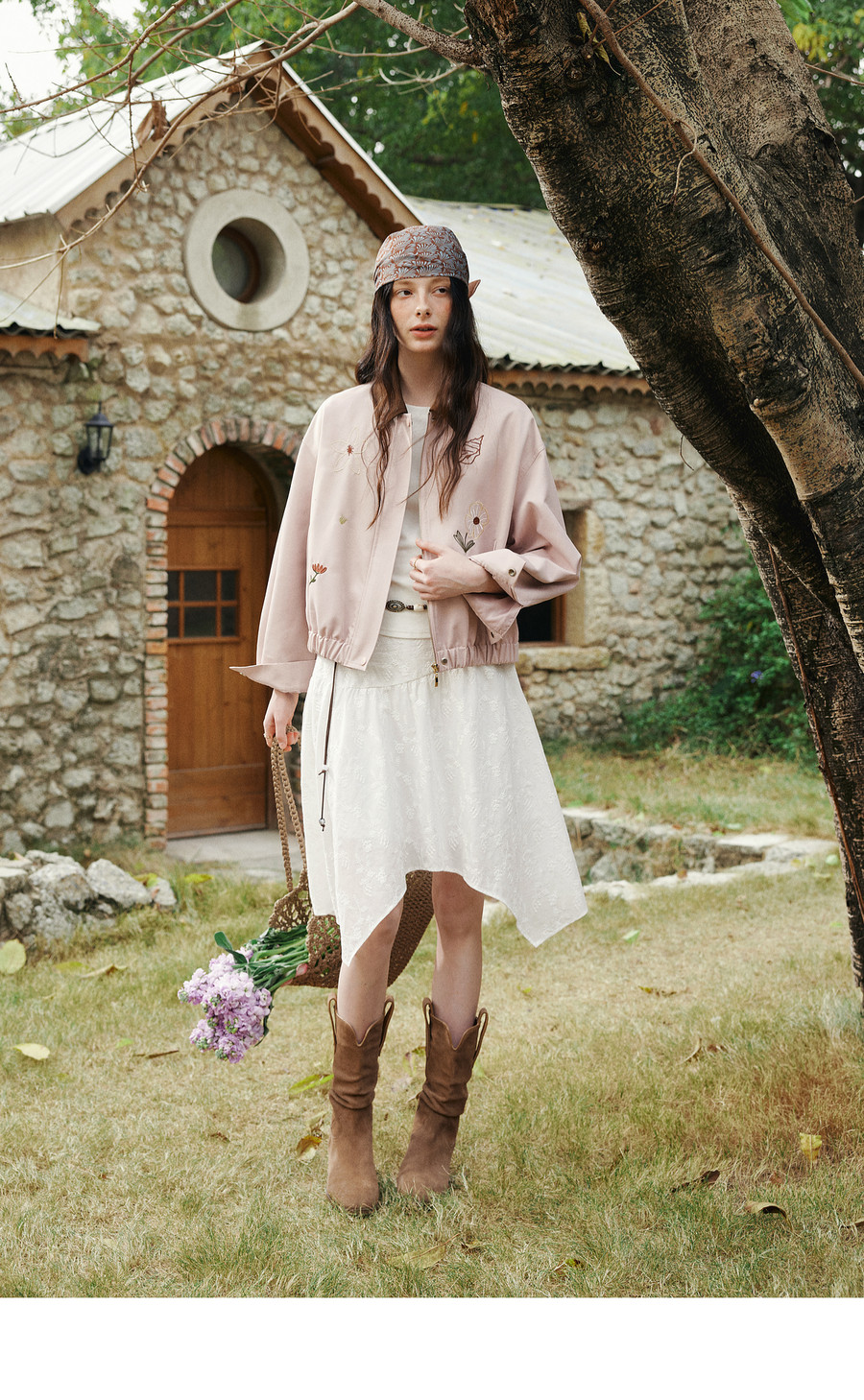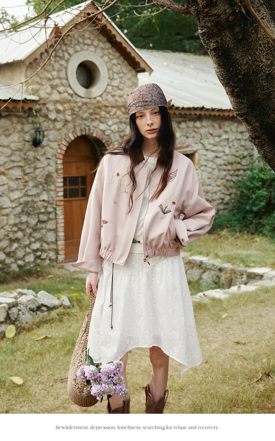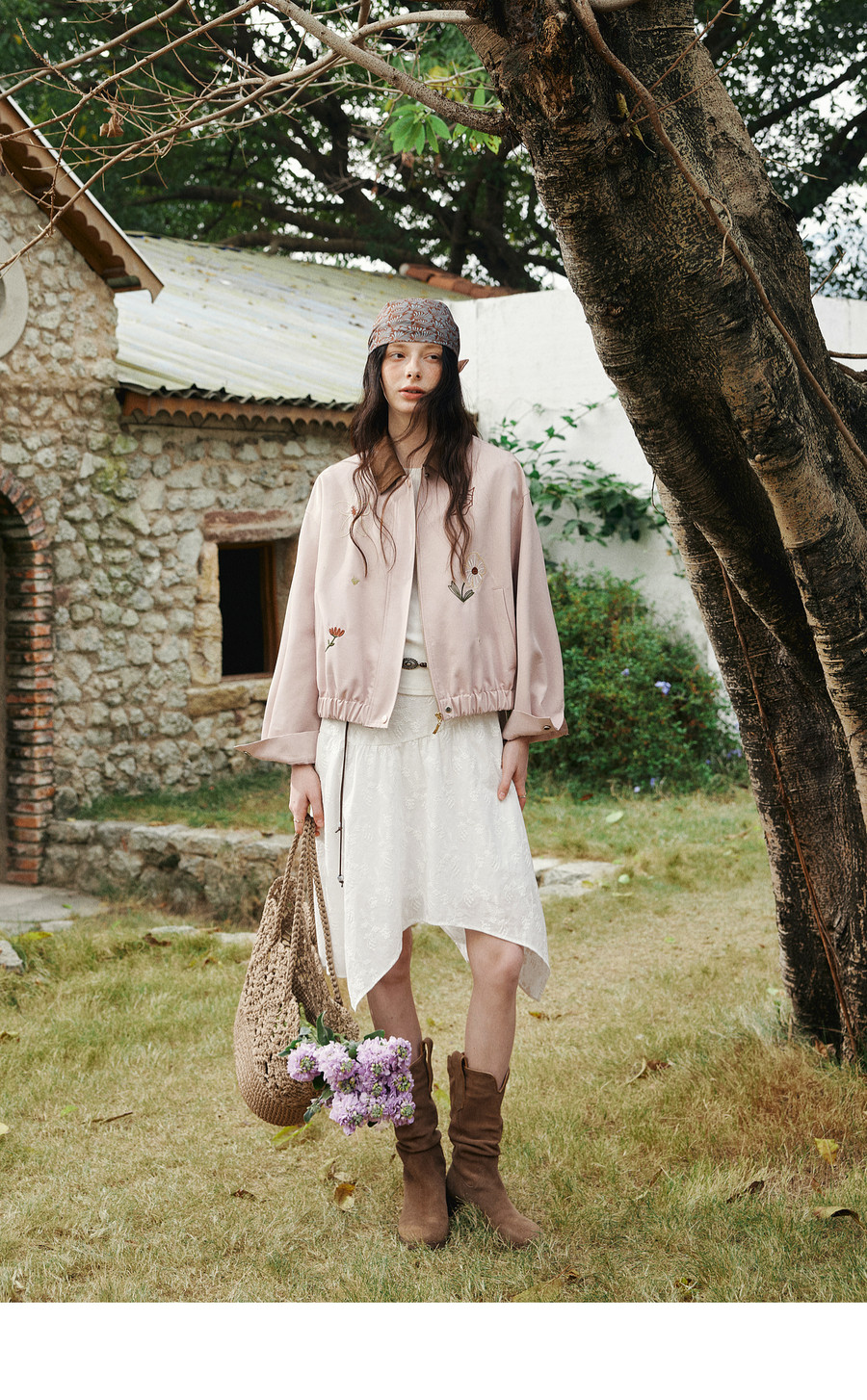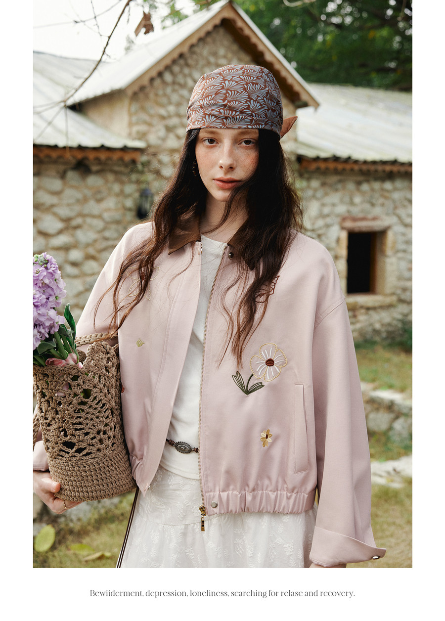 欧芮儿休闲设计感粉色撞咖色绣花短外套女春季2026新款夹克上衣