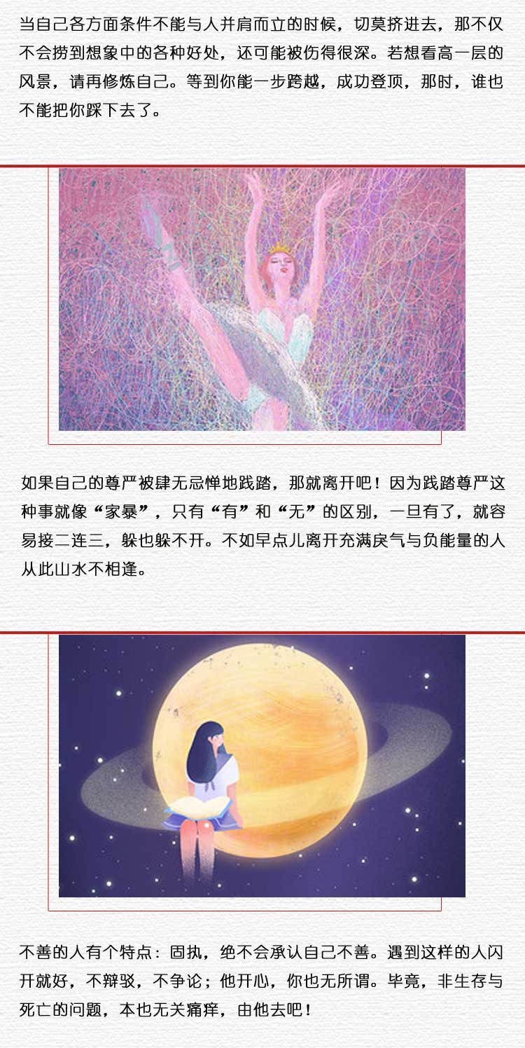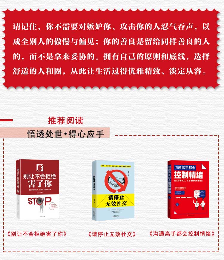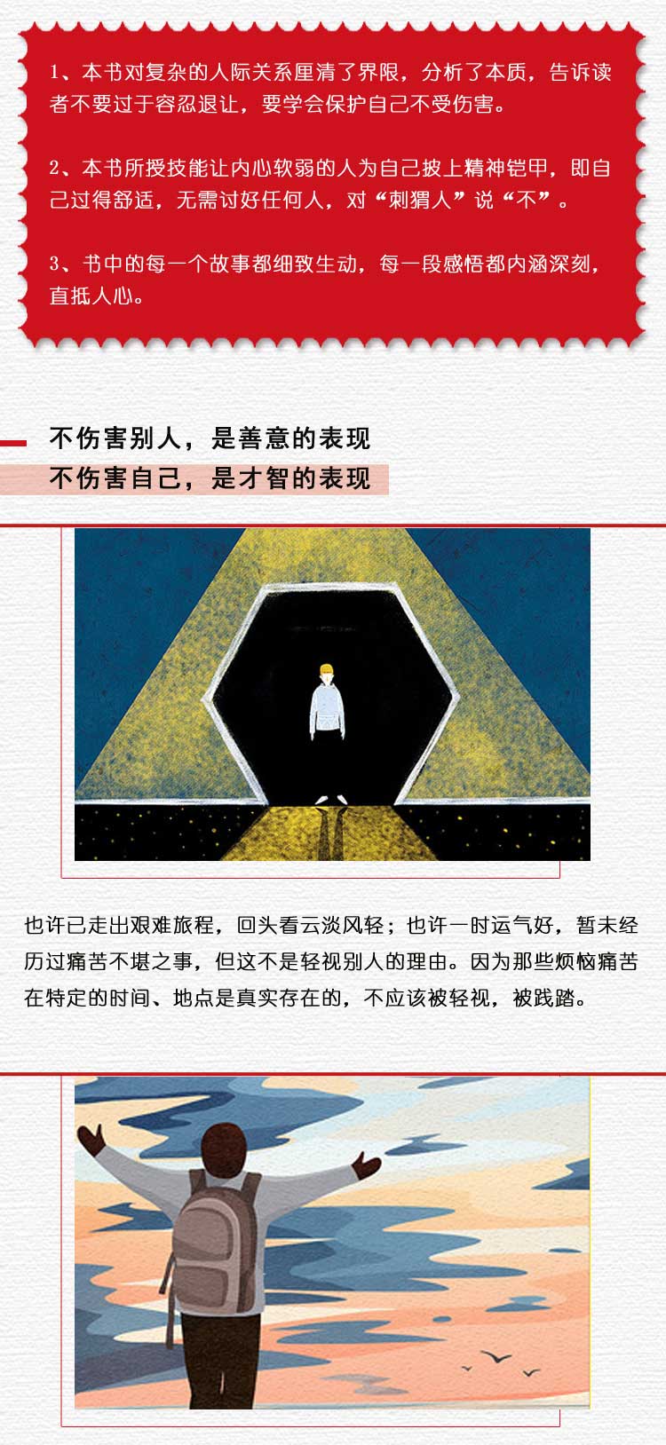 这是一本戳中柔弱内心深处的心灵开悟书,真实的故事,尖锐的话题,似曾相识的情境,写出你经历过却含糊朦胧无法表述出来的痛,获得充沛的情感共鸣;这也是一本直面善良人常处于被伤害困境的诚意之作,提醒善良的人,应有自己的底线和原则,无底线和原则的善良伤了自己,也不会赢得别人高看一眼。