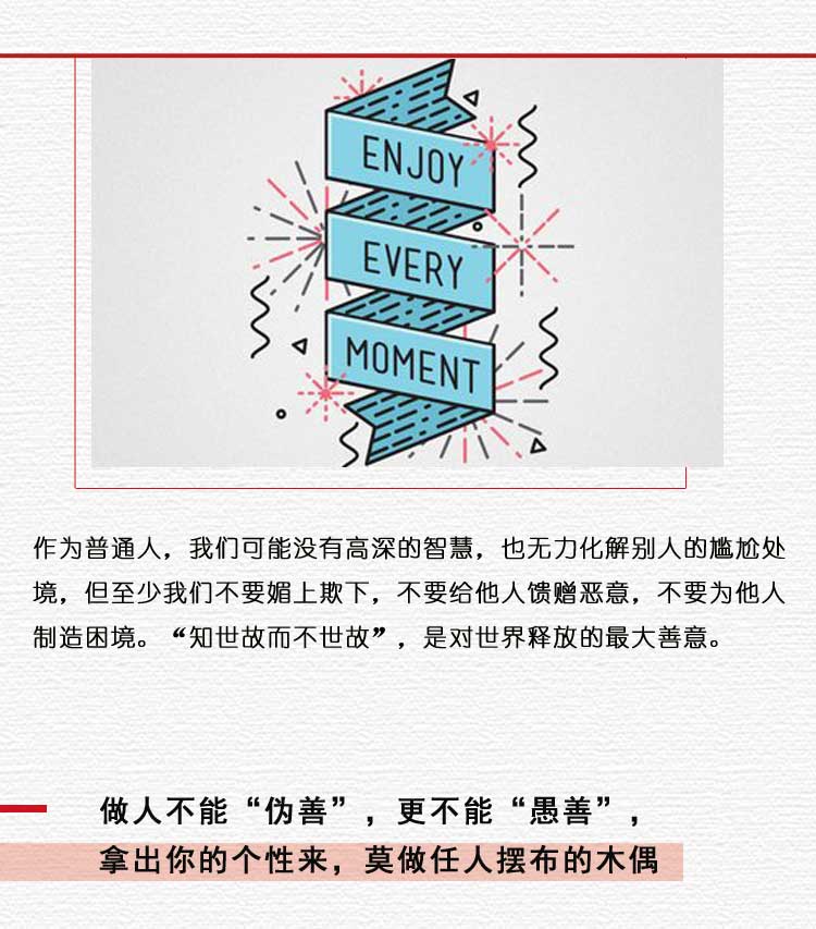 本书条分缕析,娓娓道来,通过若干故事告诉读者,做人不能“伪善”,也不能“愚善”,以“智慧”为前提,拒绝以“好意”为借口强加给自己的伤害,学会选择让自己舒适的人和圈,将生活过得更加淡定从容。