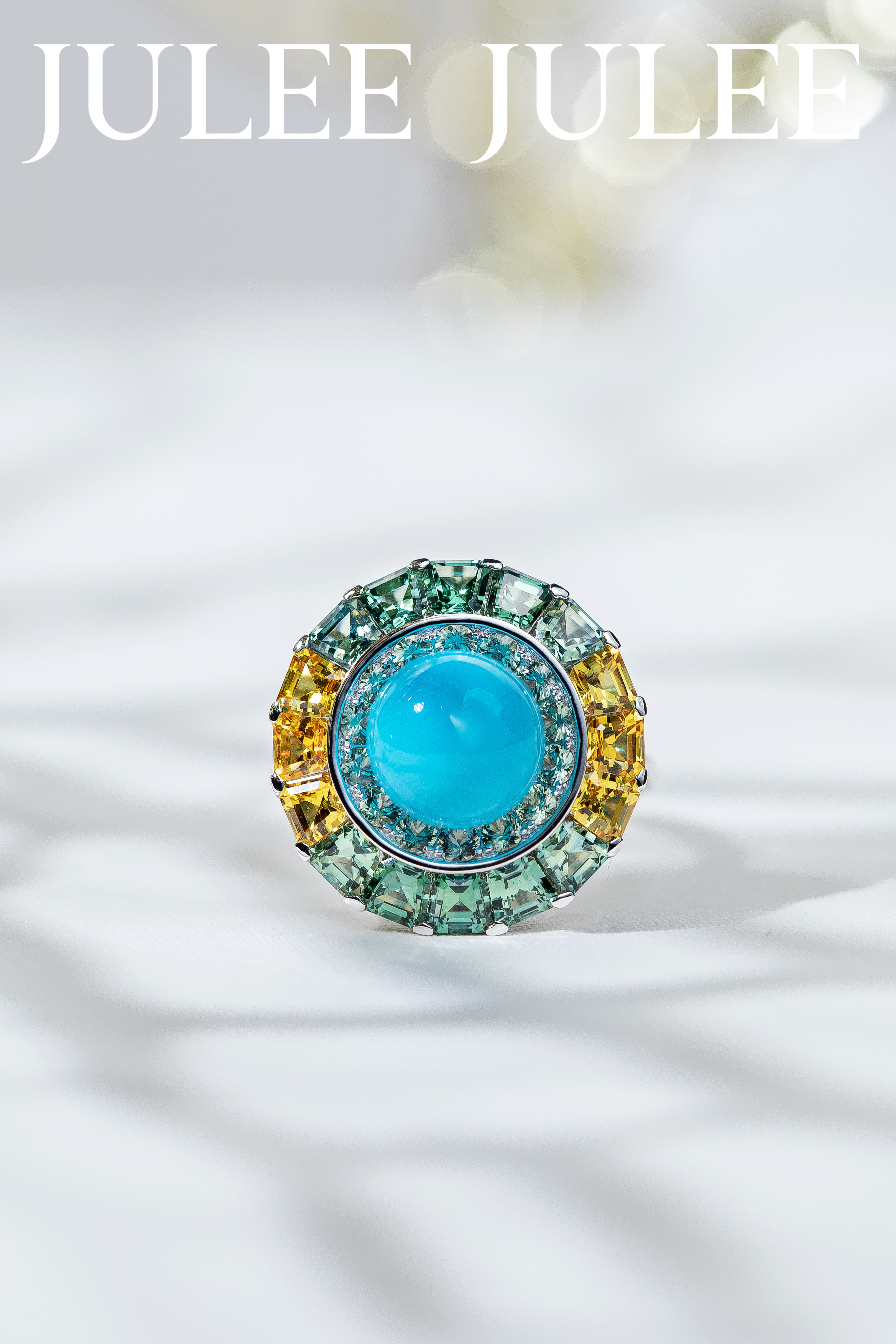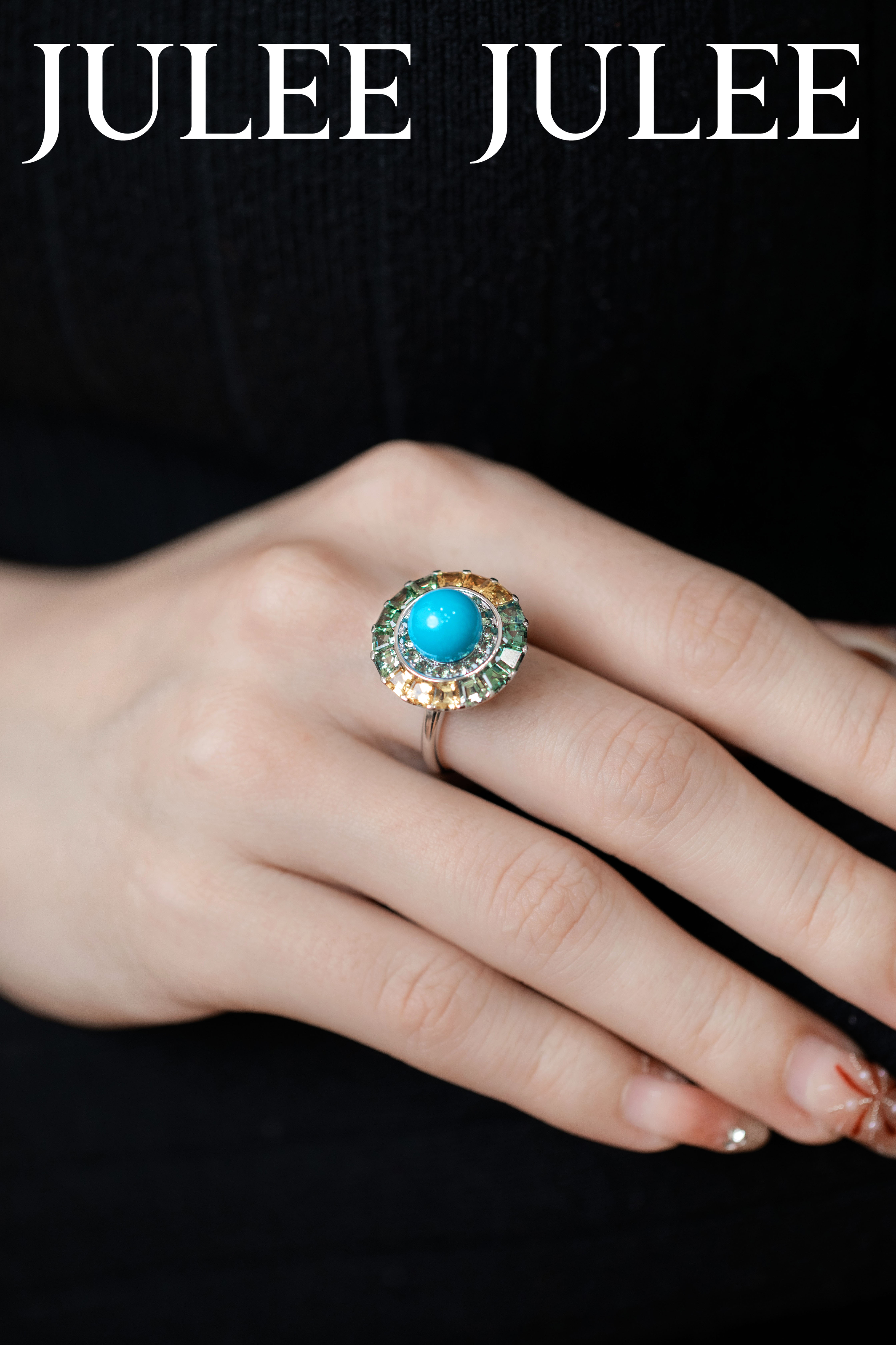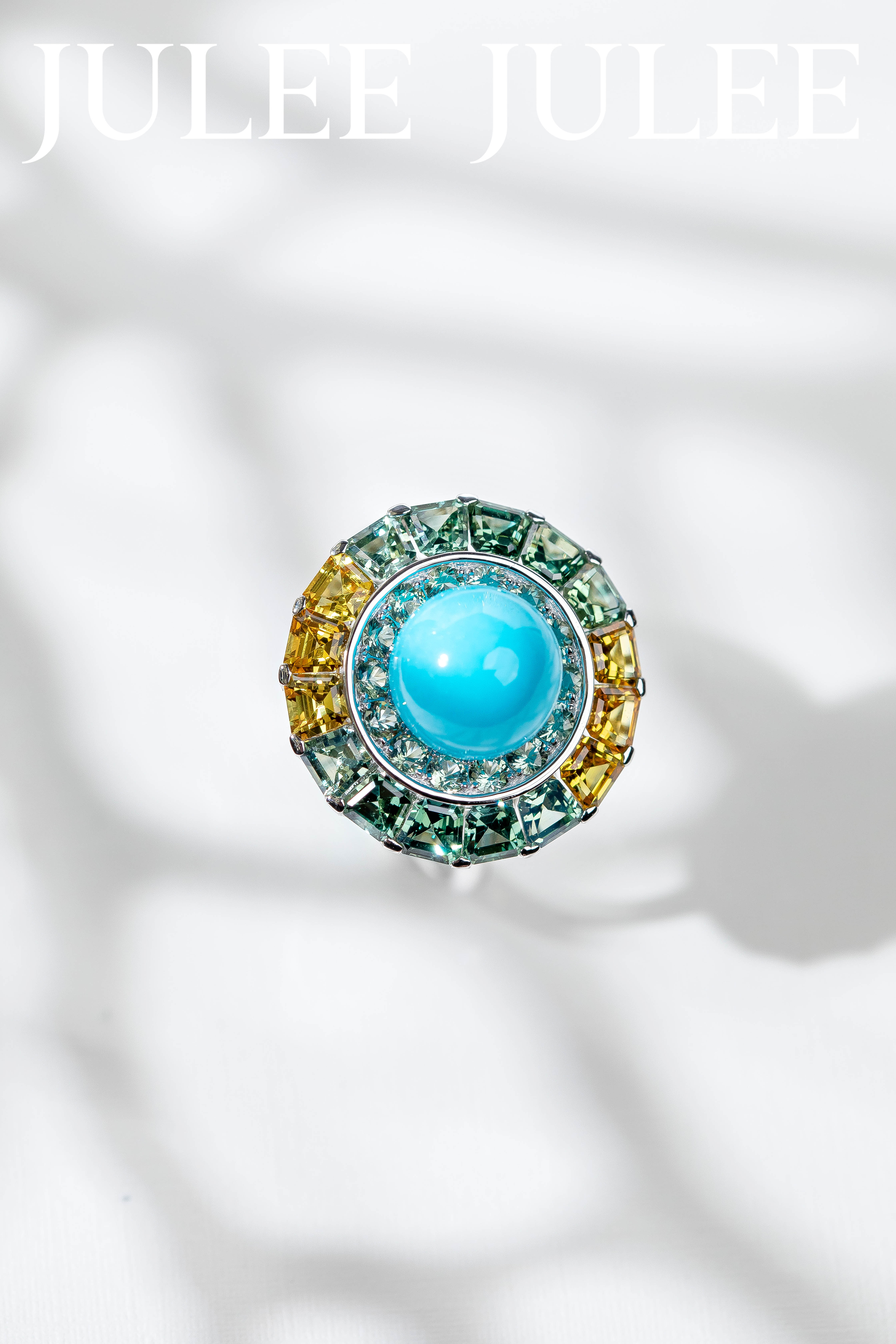 18K白金绿松石彩蓝宝石旋转戒指
