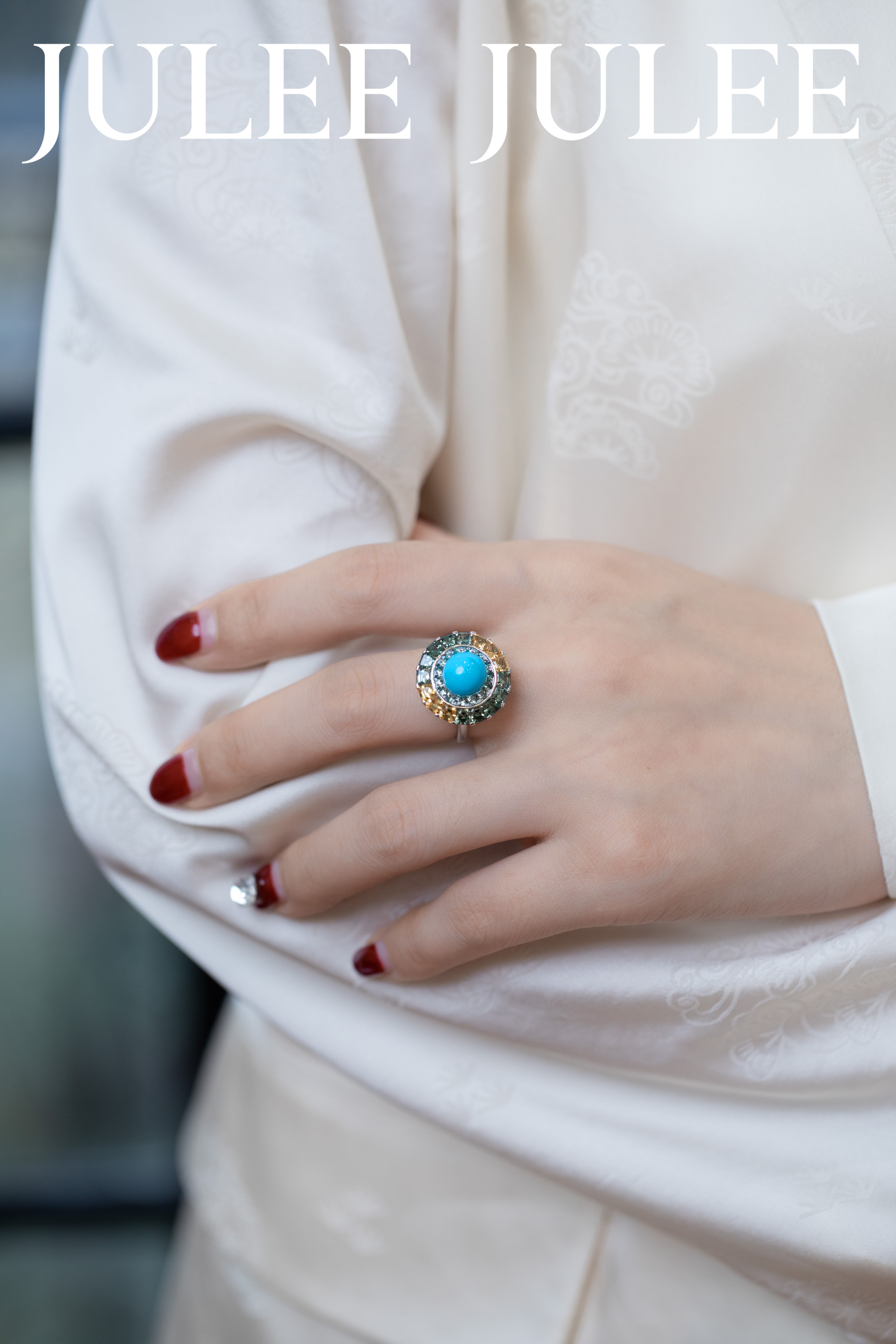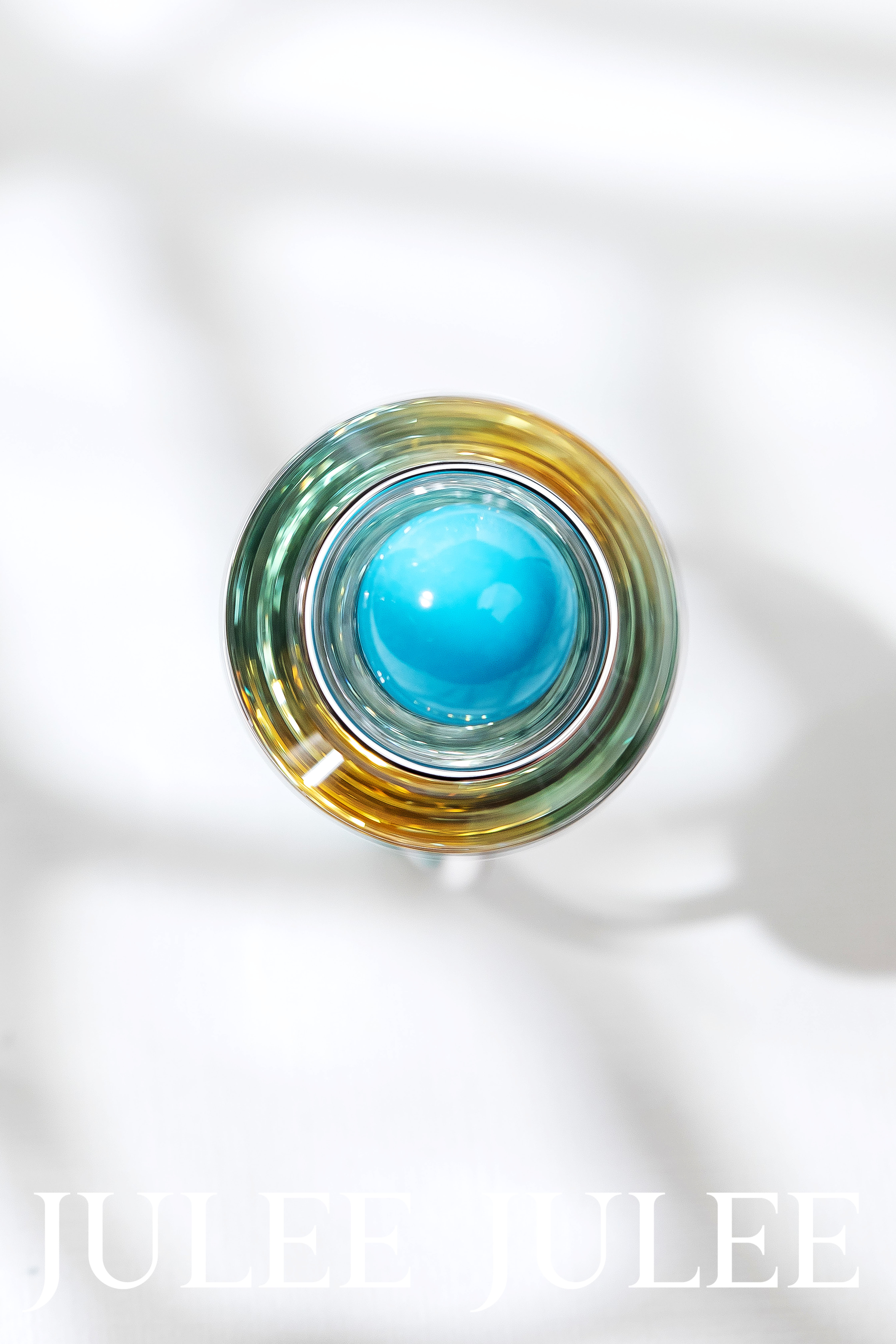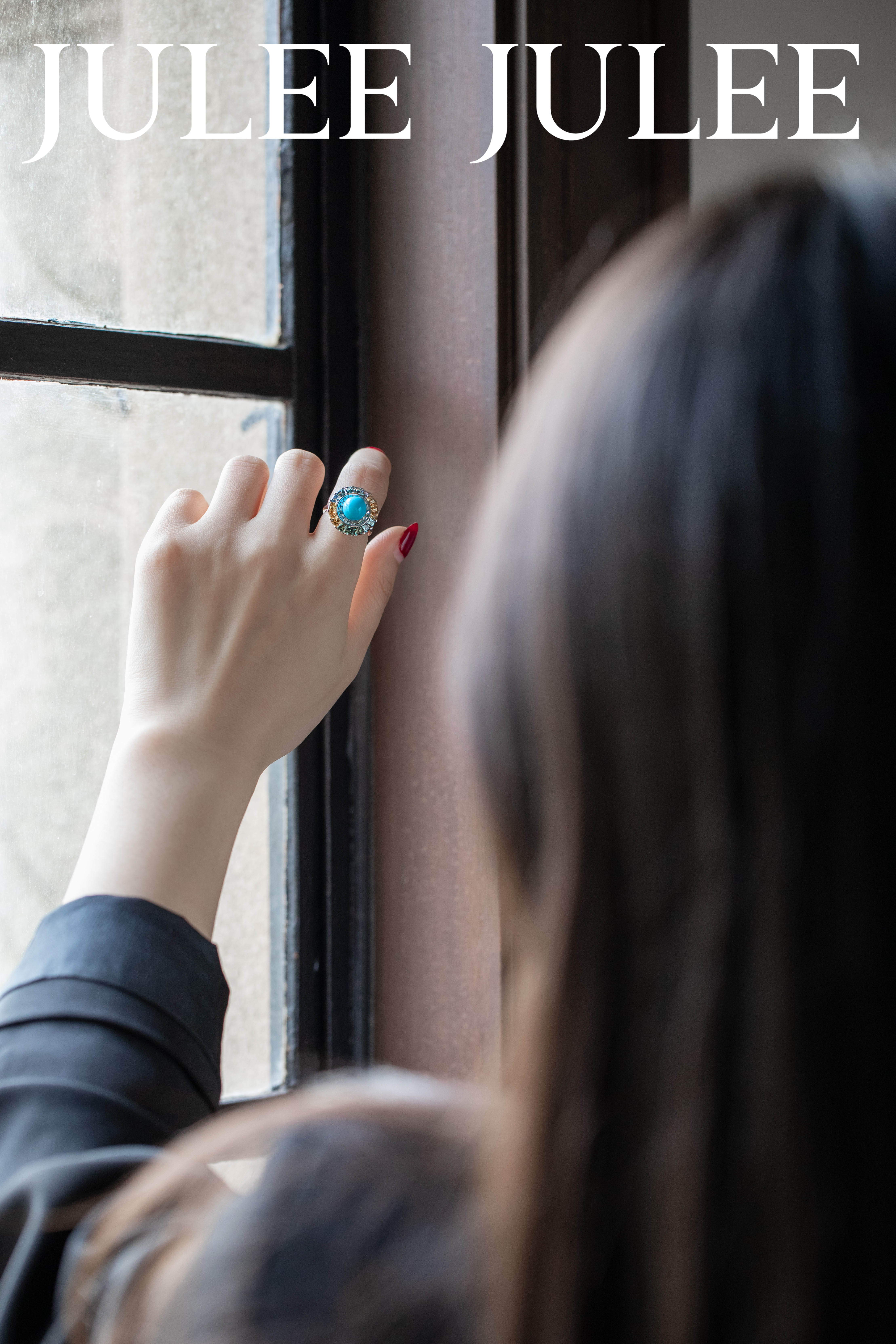 18K白金绿松石彩蓝宝石旋转戒指