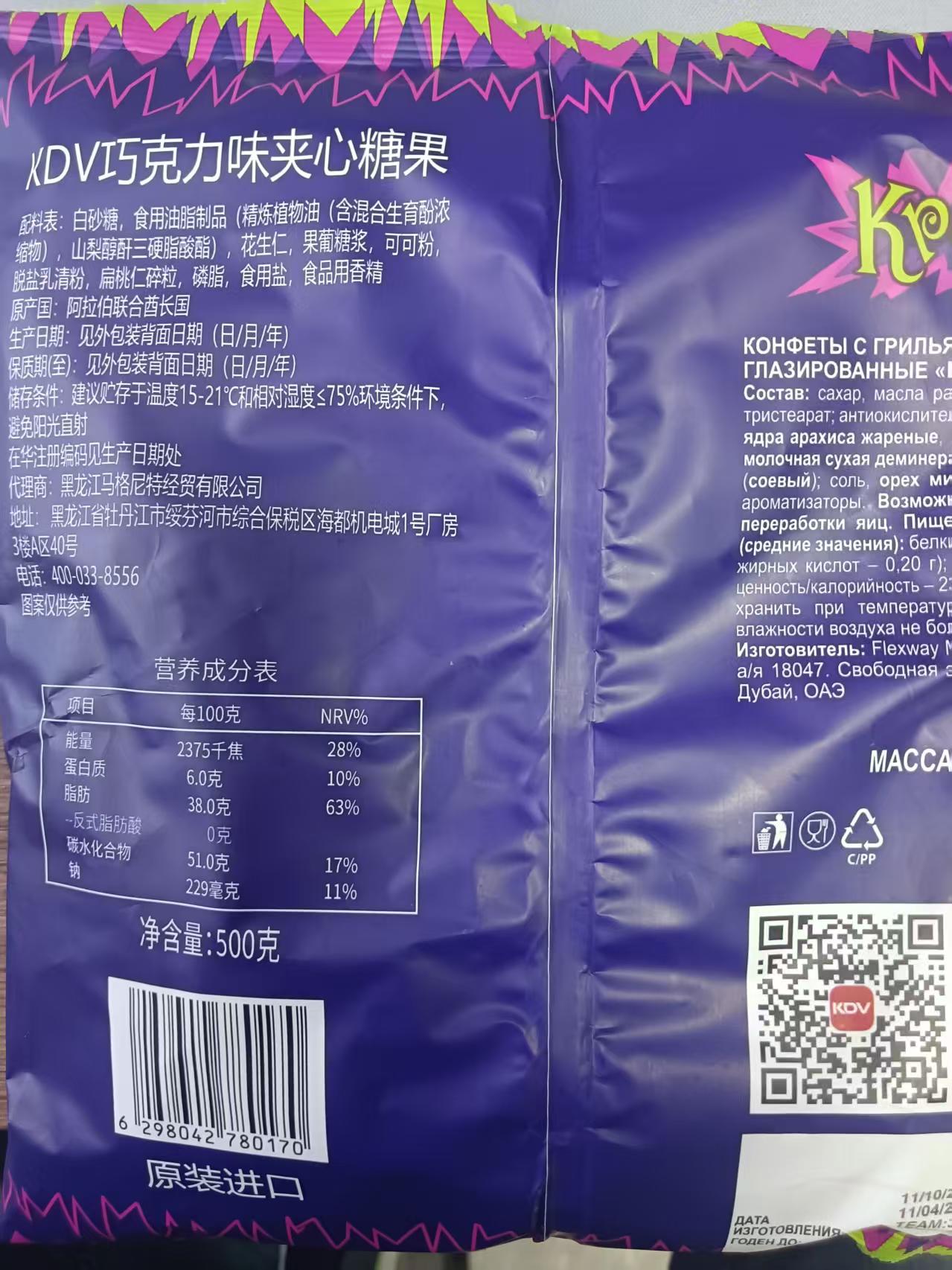 【净含量】KDV巧克力味夹心紫皮糖:500g/袋