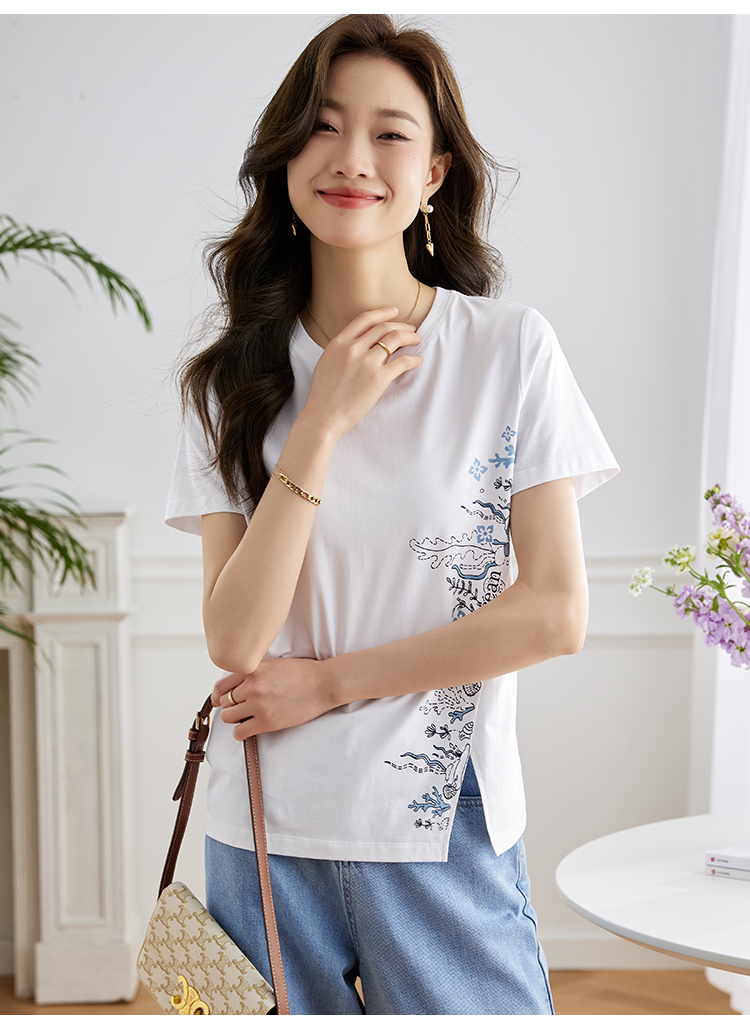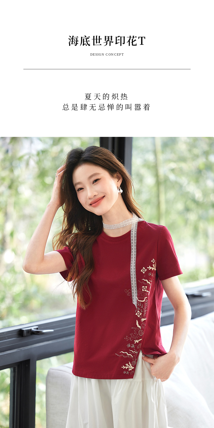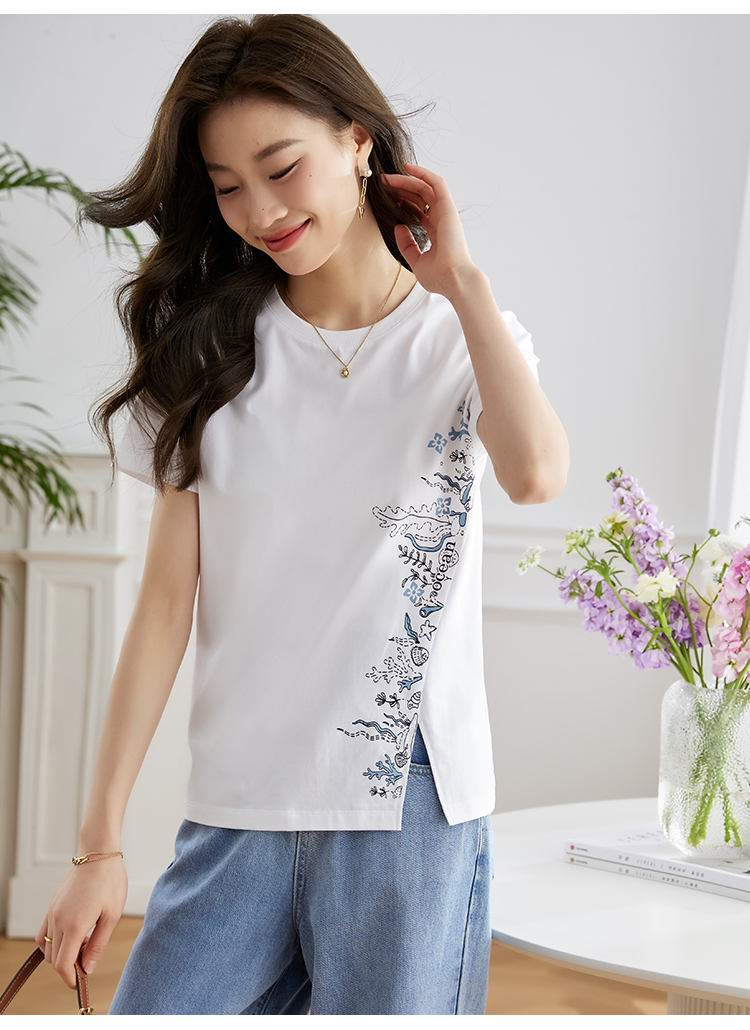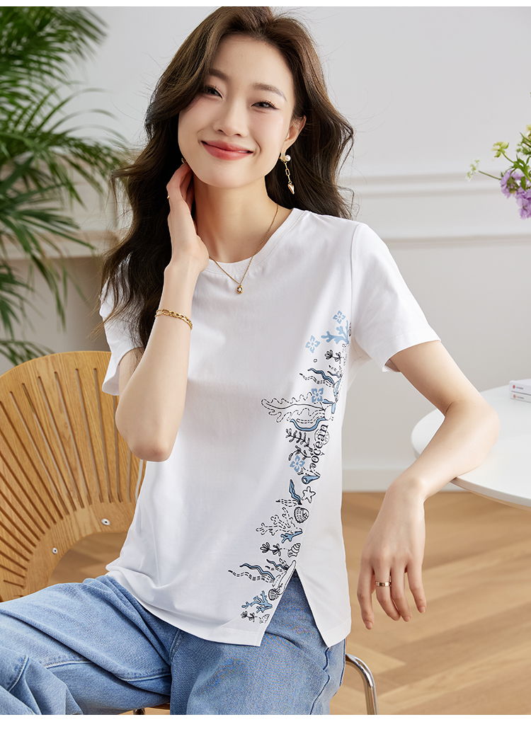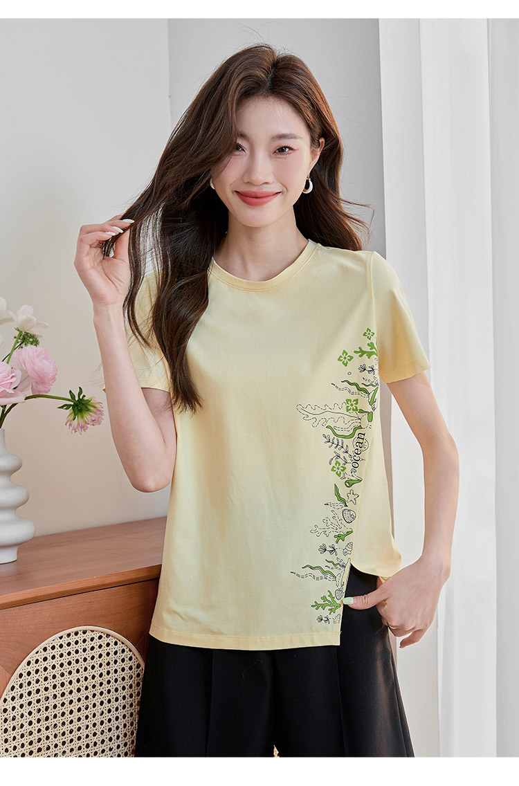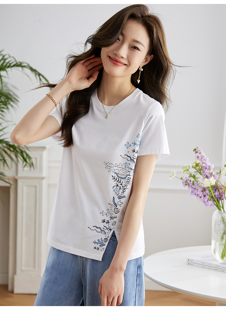 【专属特价】熙世界休闲开叉T恤女短袖2025夏装新品时尚印花百搭圆领体恤上衣