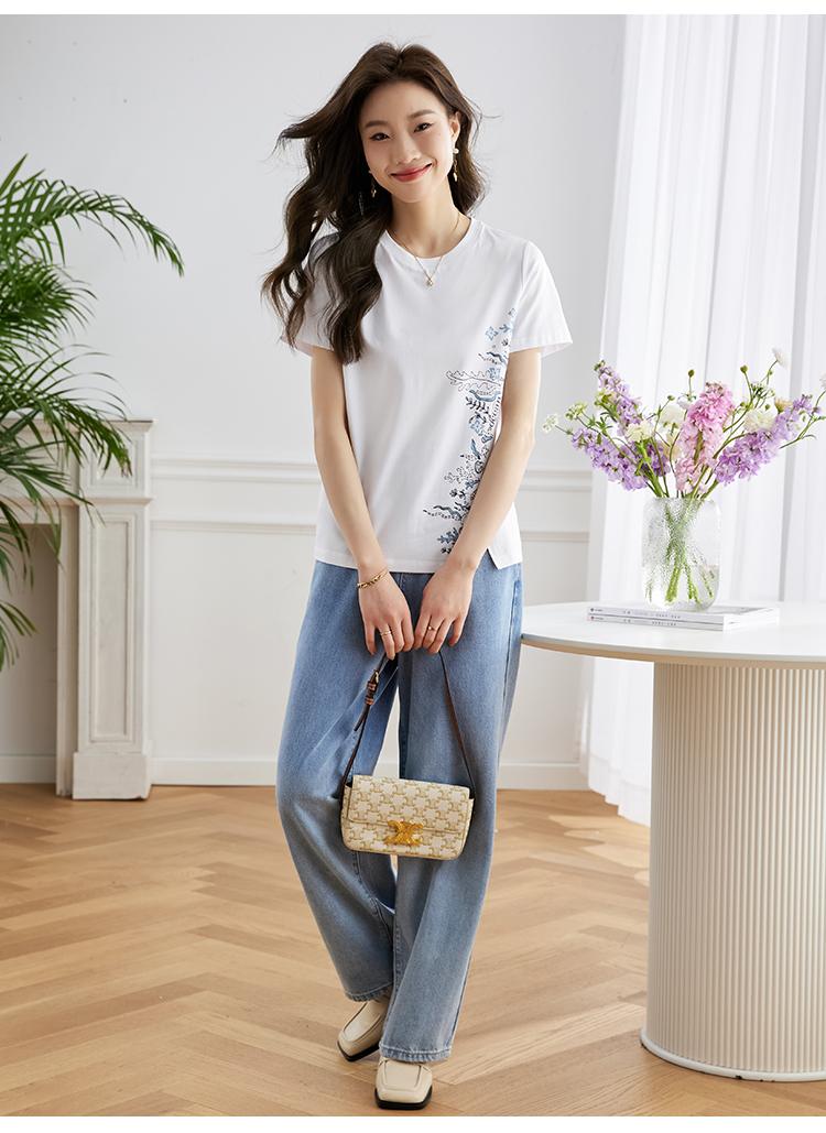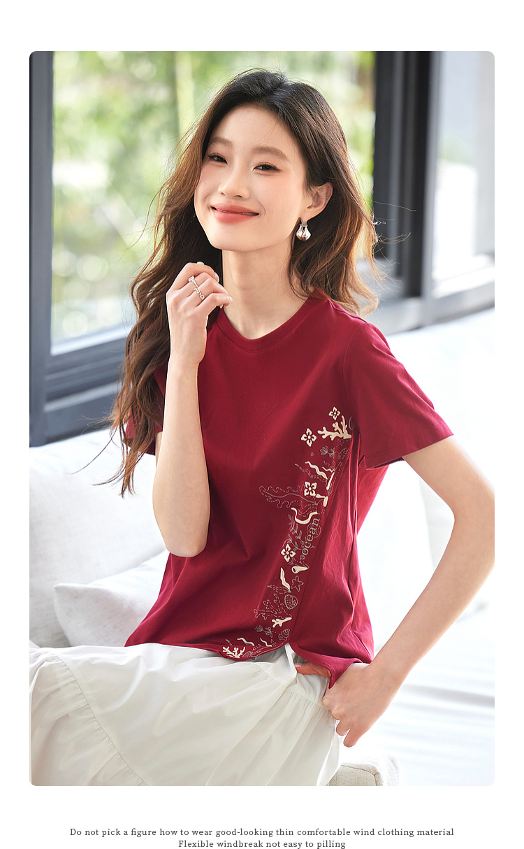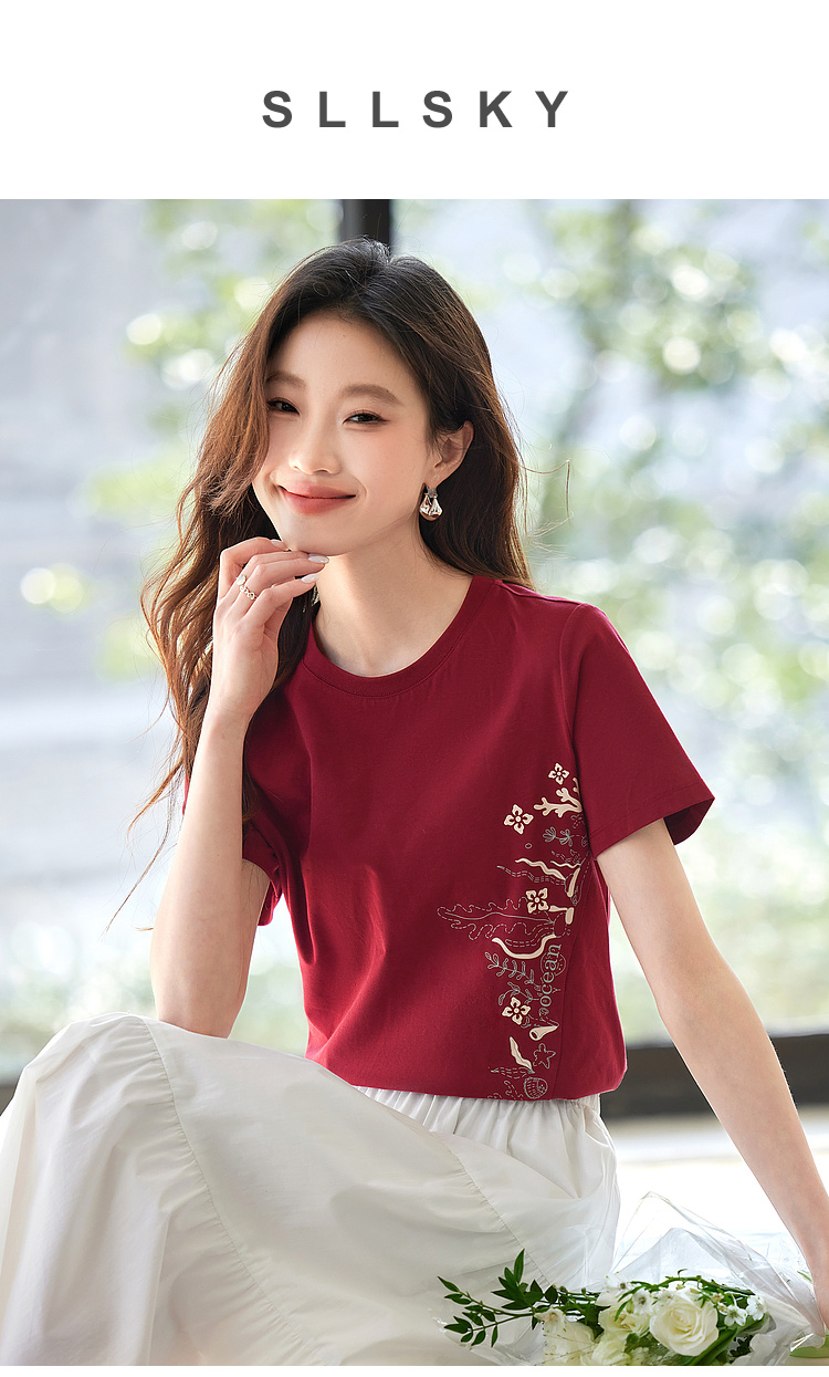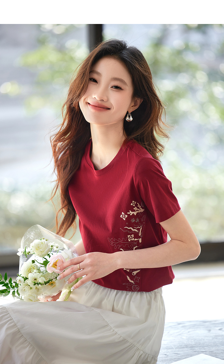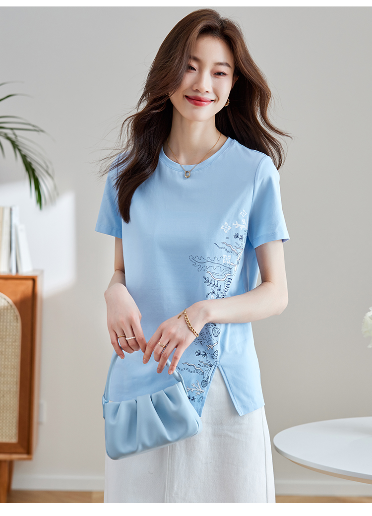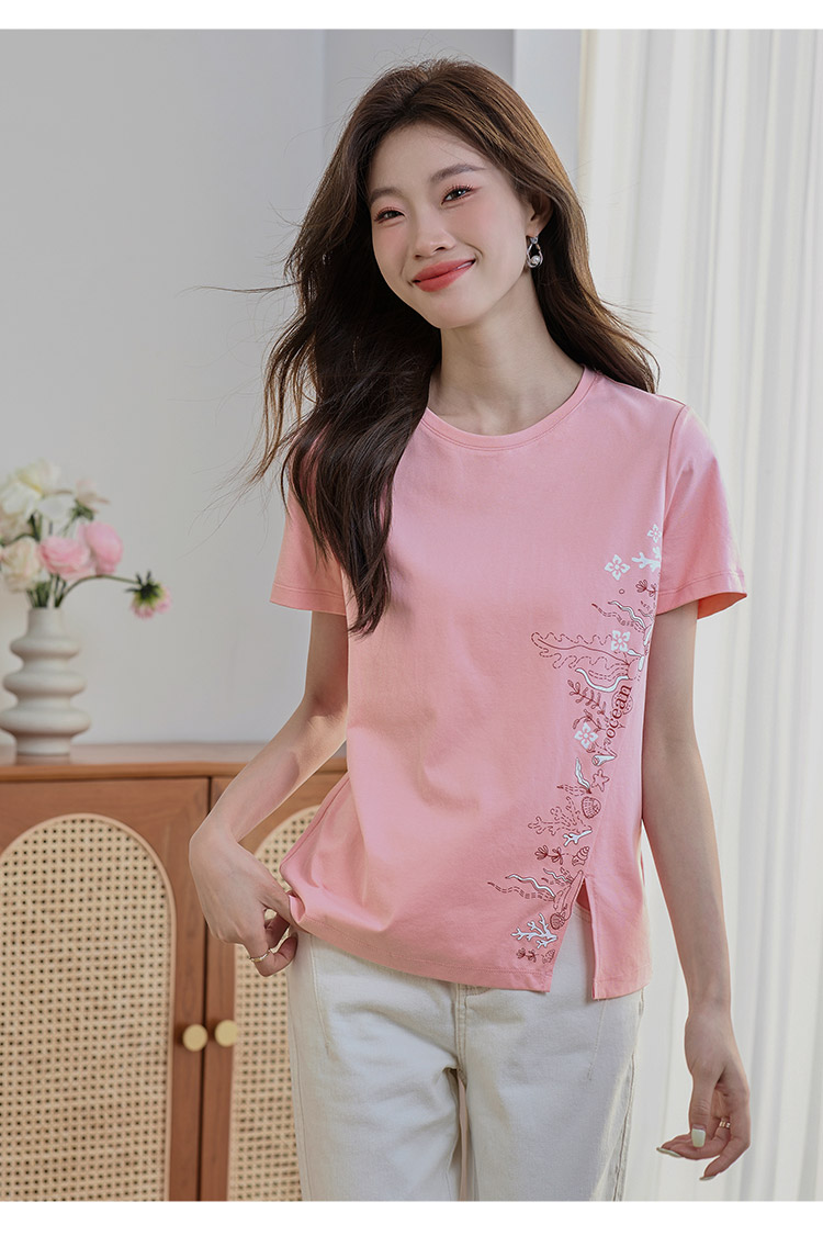【专属特价】熙世界休闲开叉T恤女短袖2025夏装新品时尚印花百搭圆领体恤上衣
