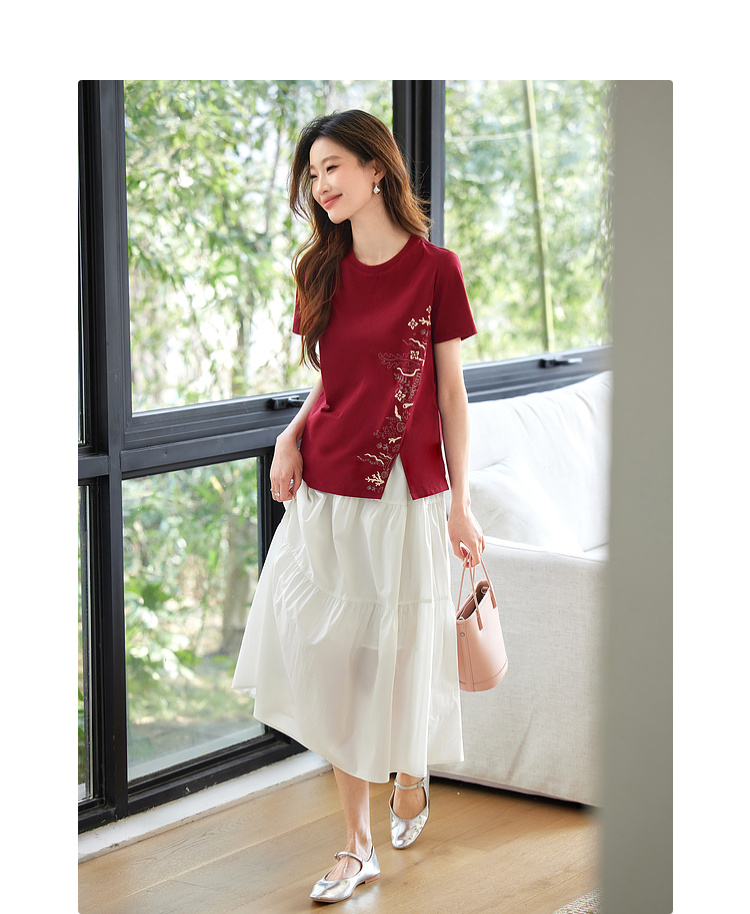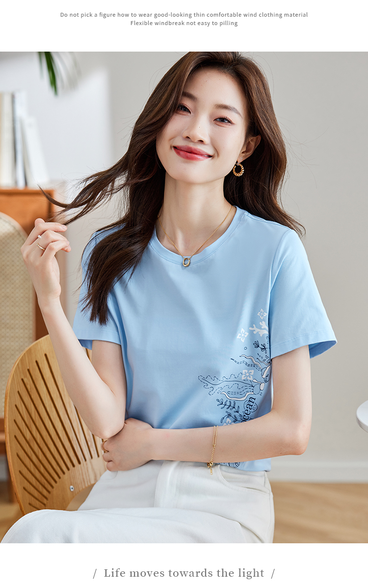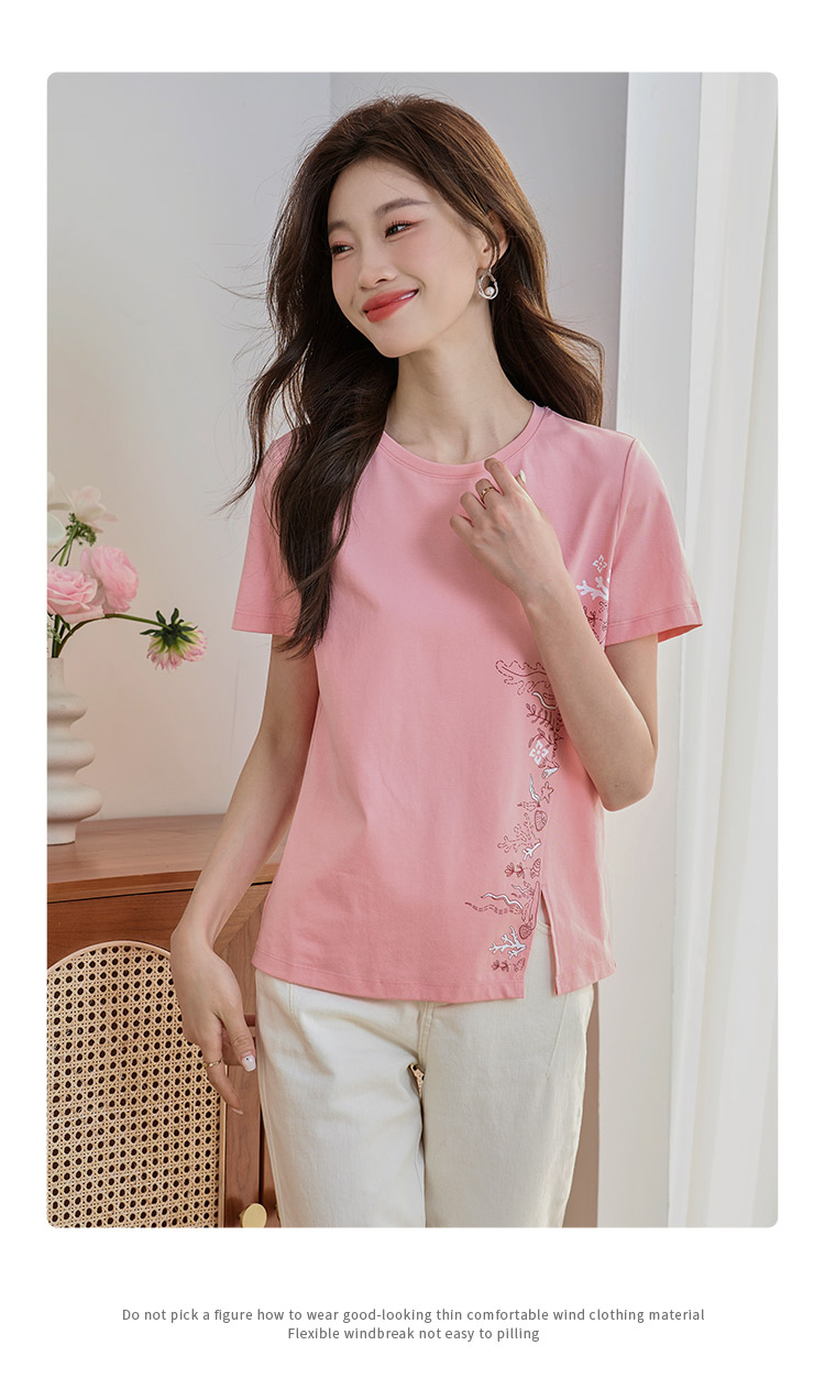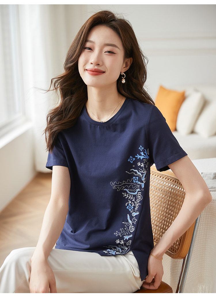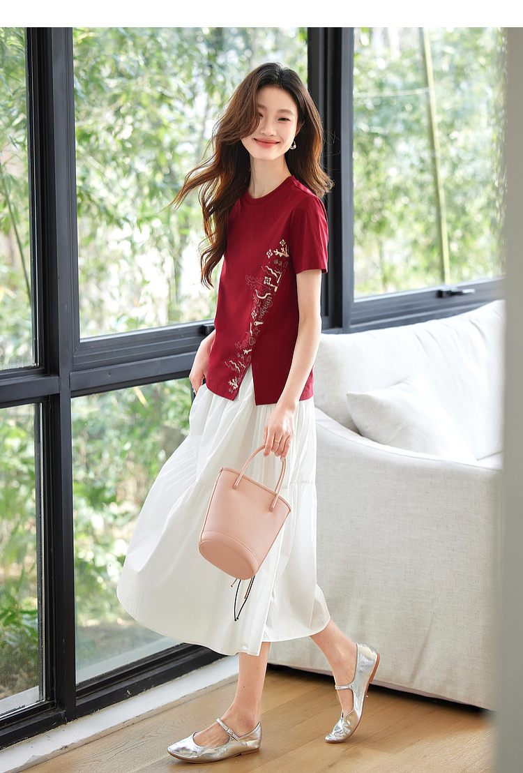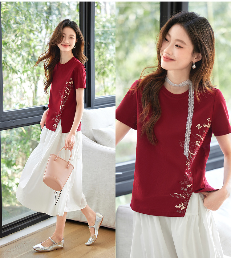 【专属特价】熙世界休闲开叉T恤女短袖2025夏装新品时尚印花百搭圆领体恤上衣