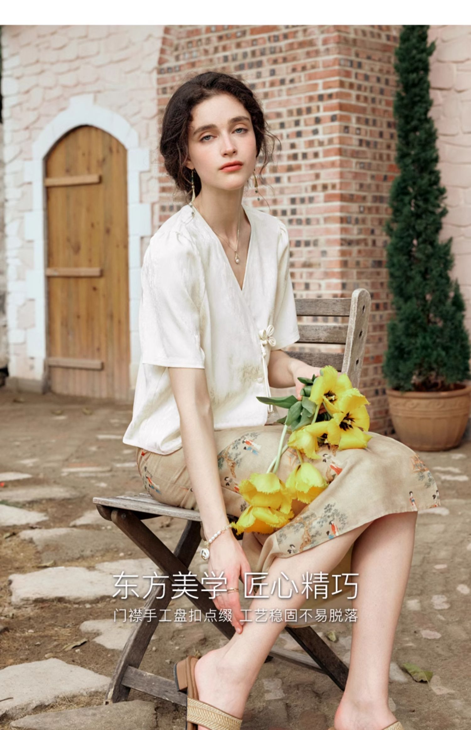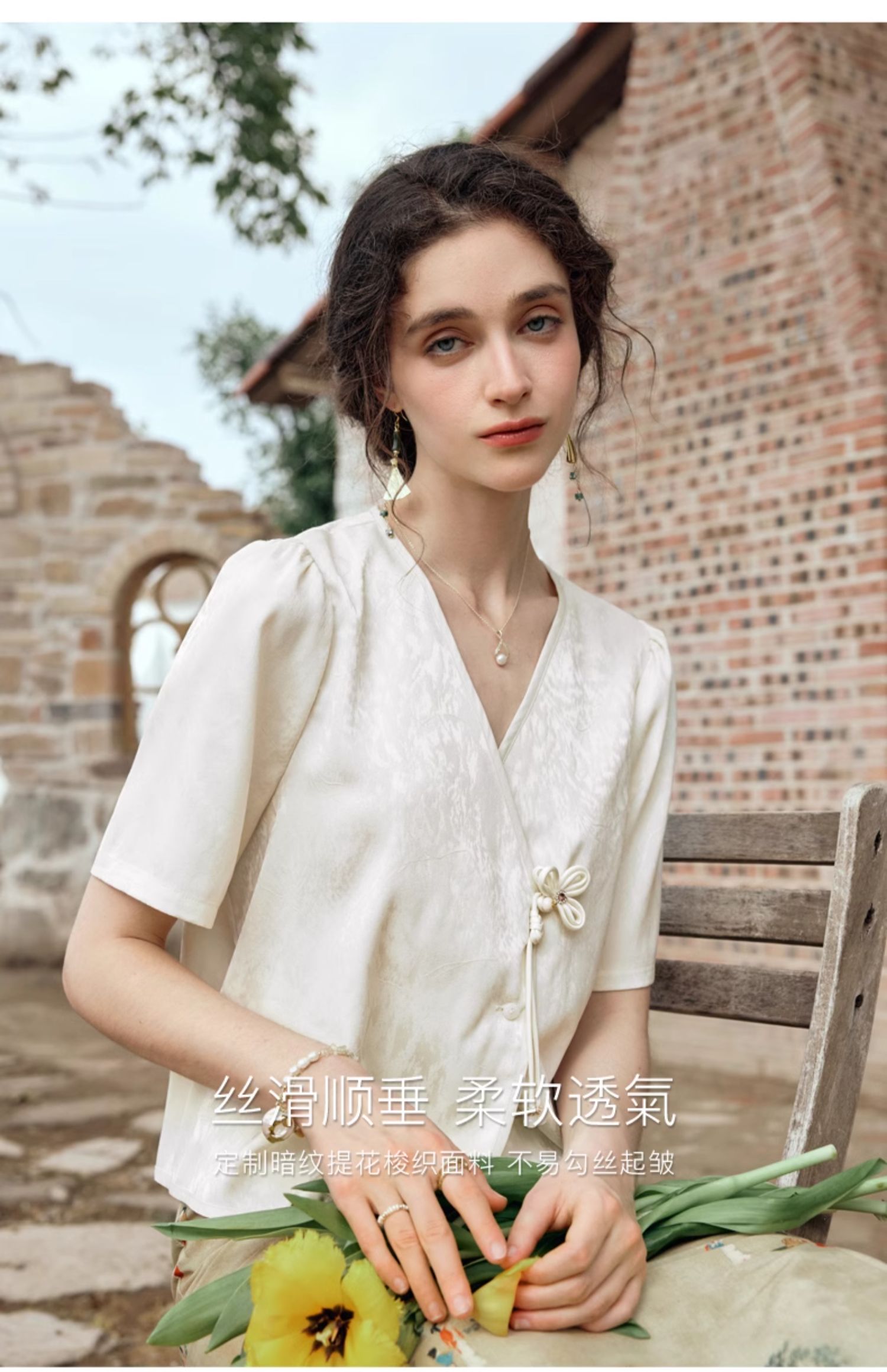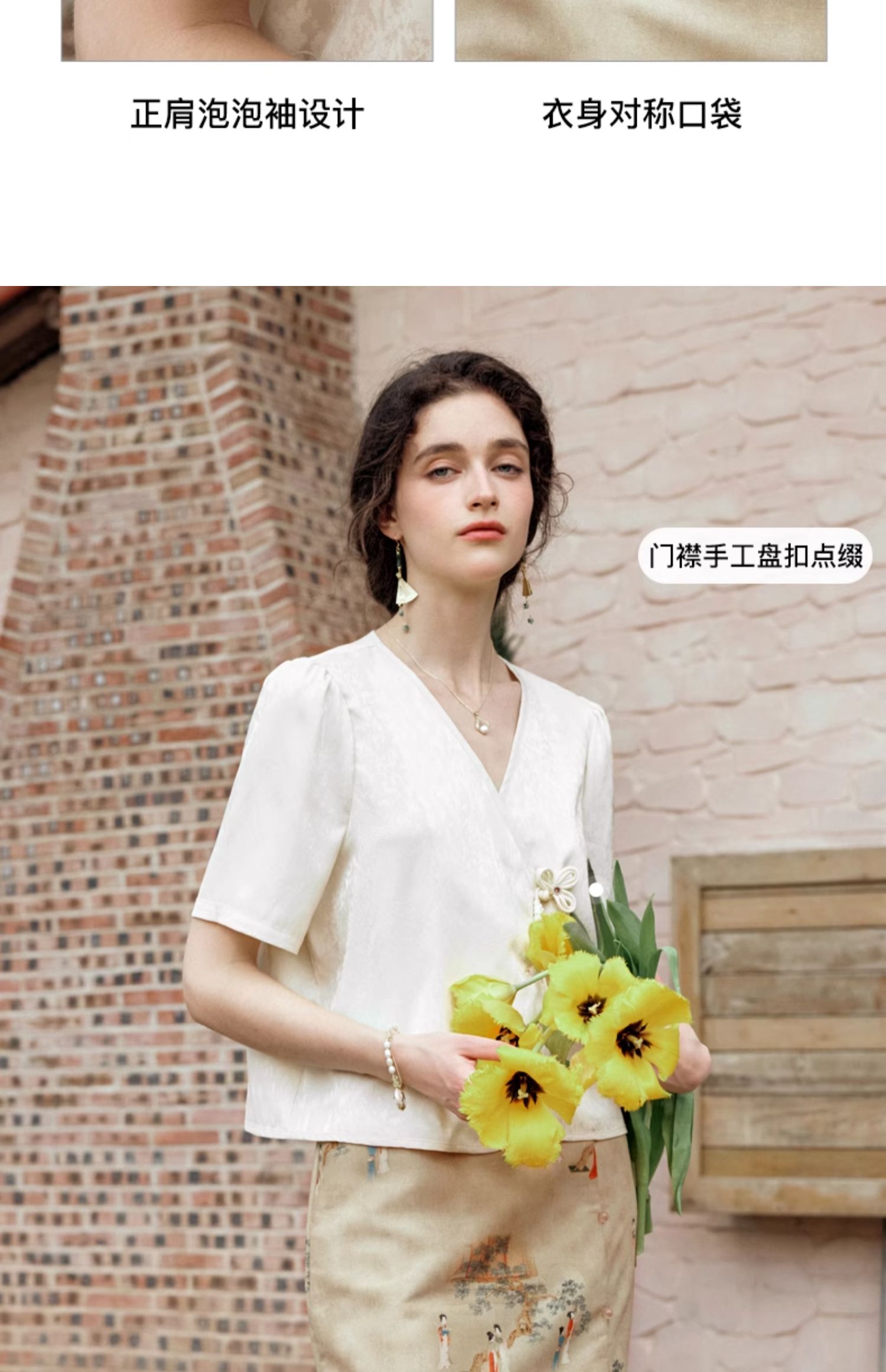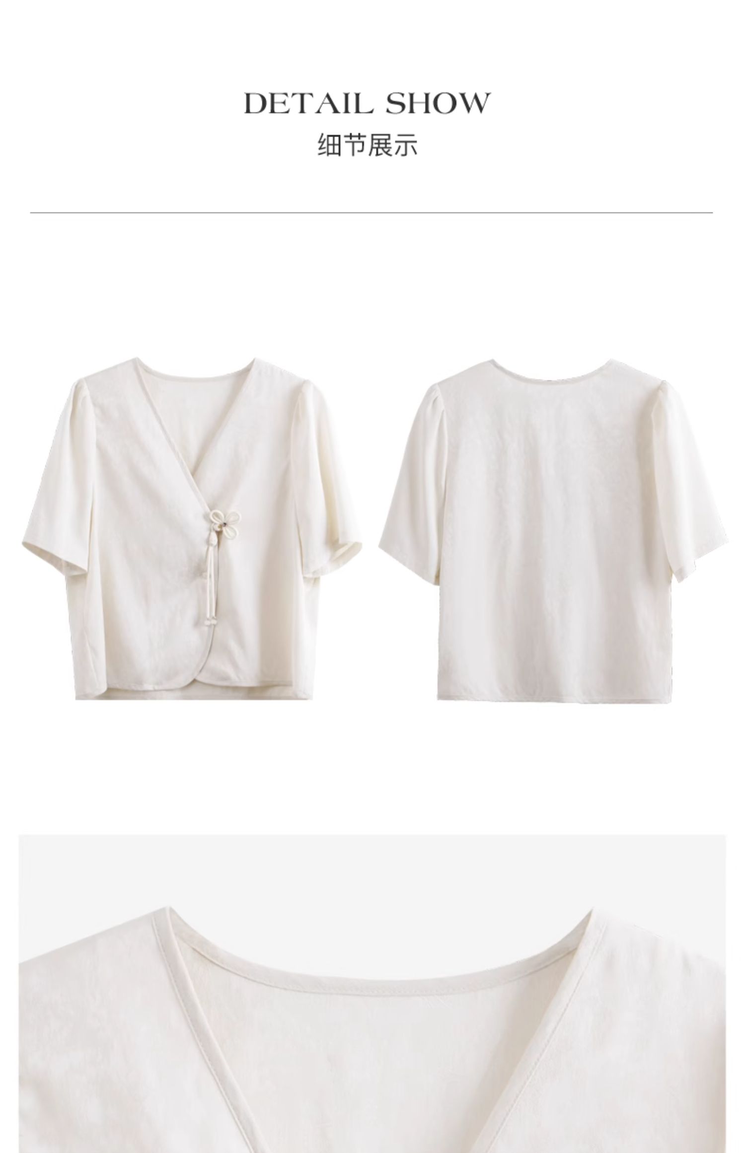 OLrain欧芮儿杏色V领雪纺衫女夏季2024新款气质高级感新中式上衣