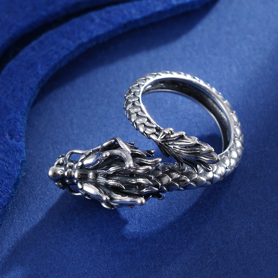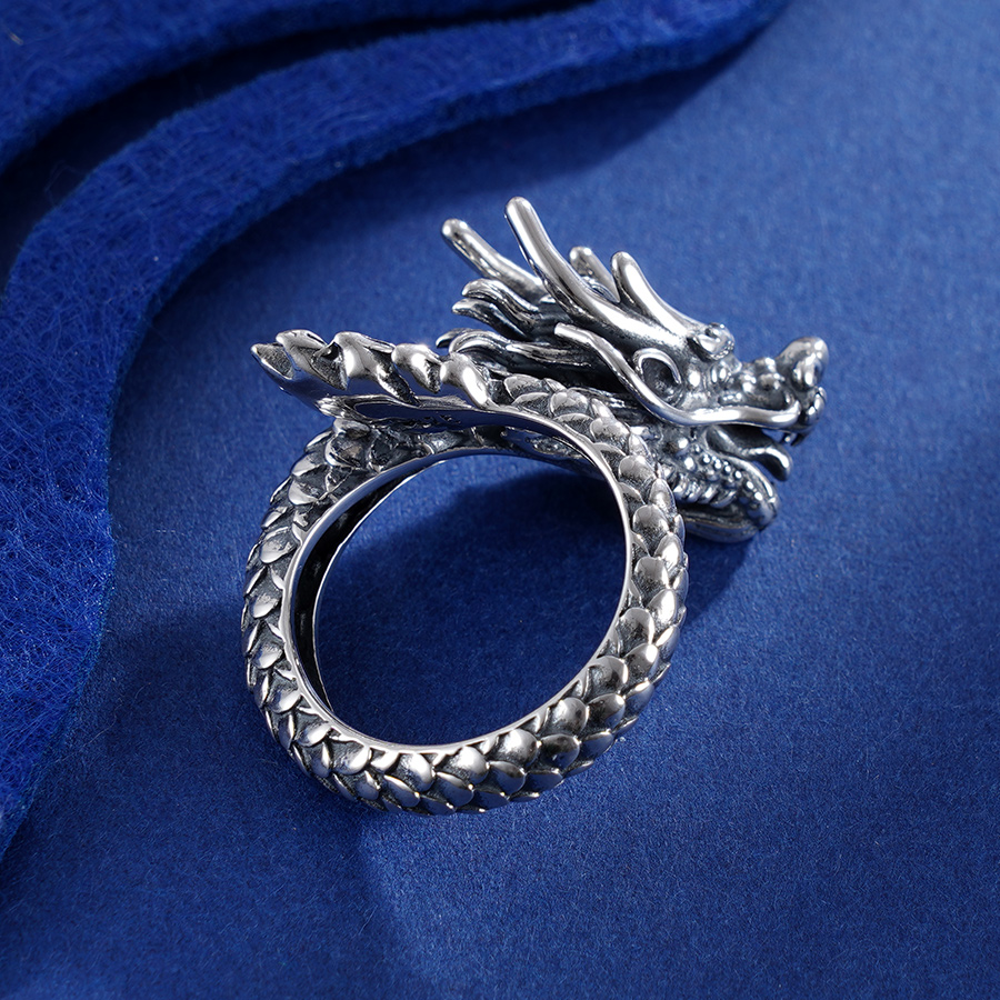 【寓意】:龙象征着权势和尊贵。戒指设计灵感取源于此,应用足银材质精制。既寓意龙腾祥瑞、叱咤风云,亦彰显男士刚健自强的精神内核。