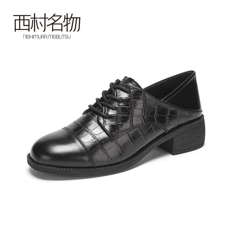 西村名物2020秋季新品小皮鞋女牛皮革中跟复古英伦风单鞋X20CM32171