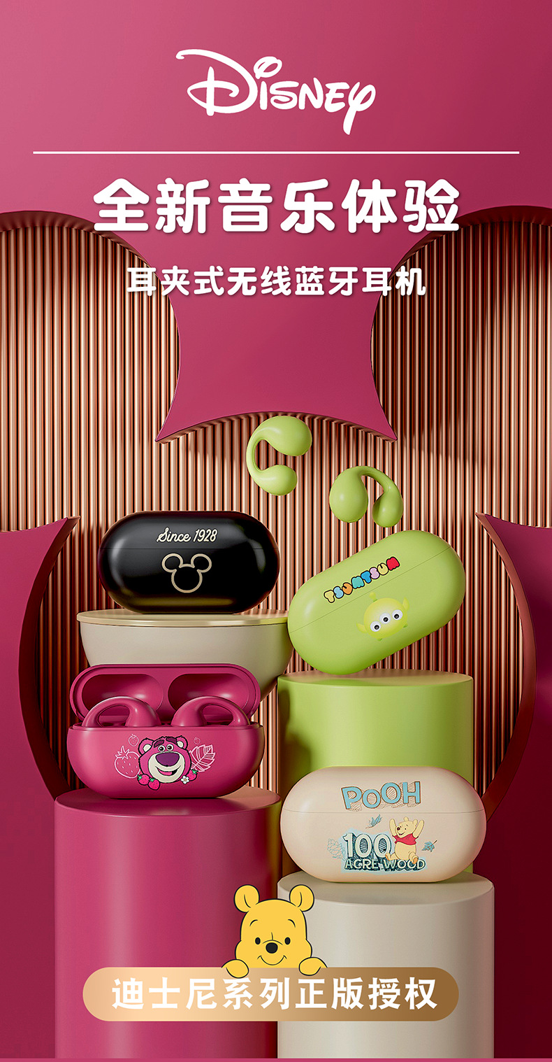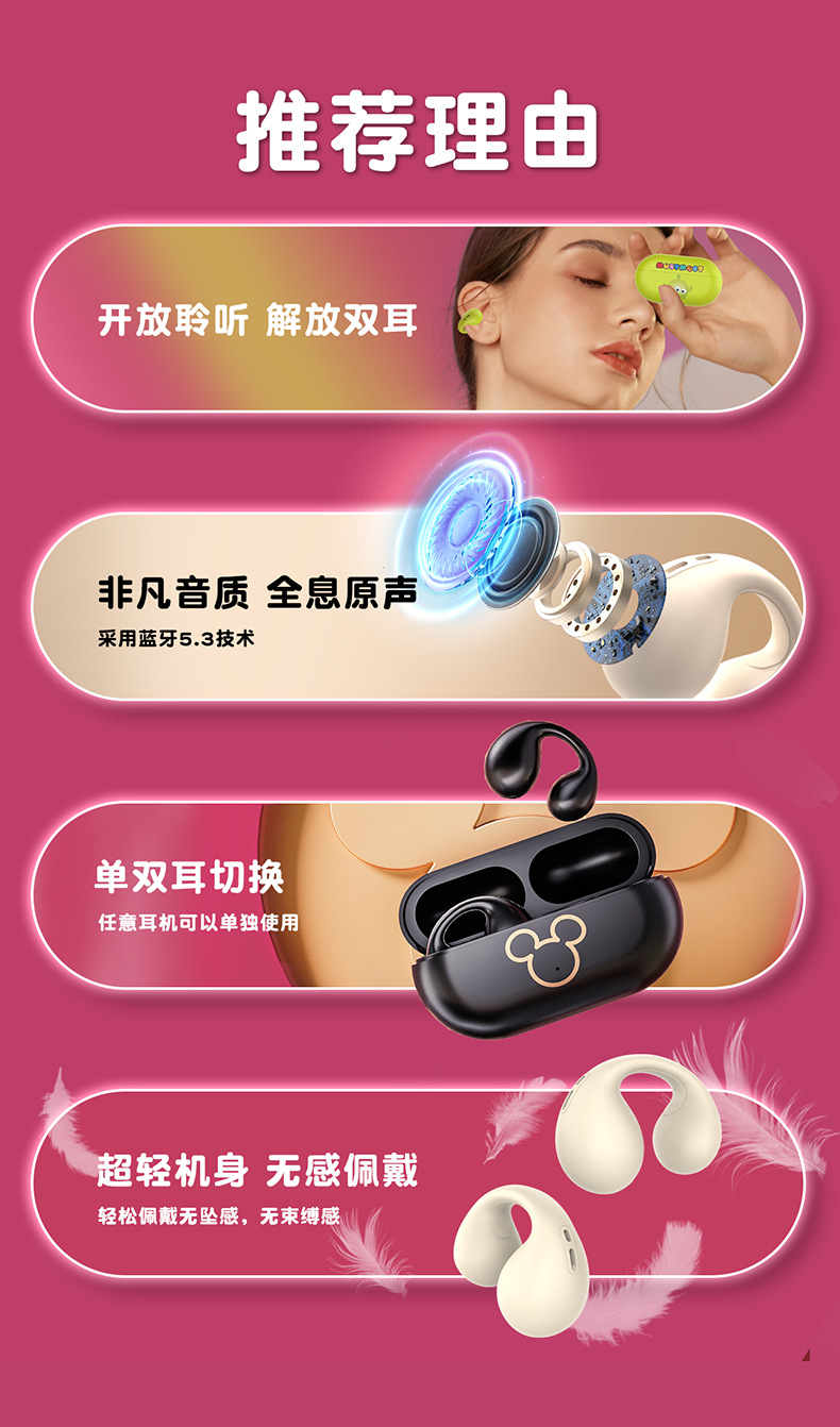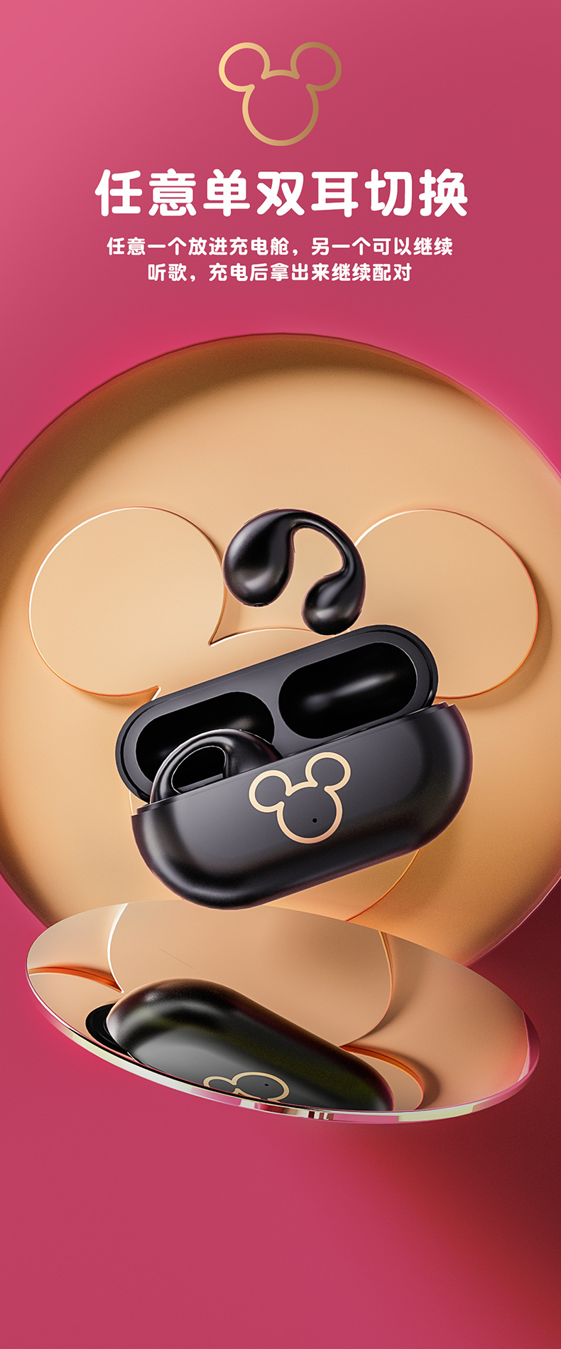 迪士尼新款真骨传导蓝牙耳机无线运动不入耳夹挂耳式超长续航耳机