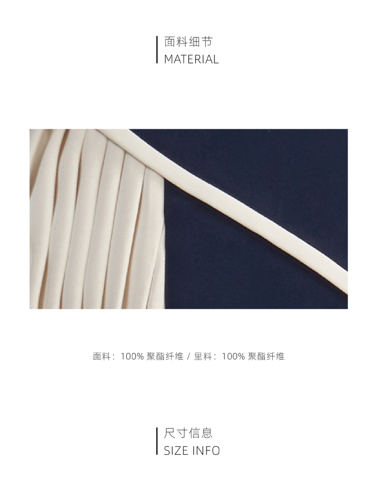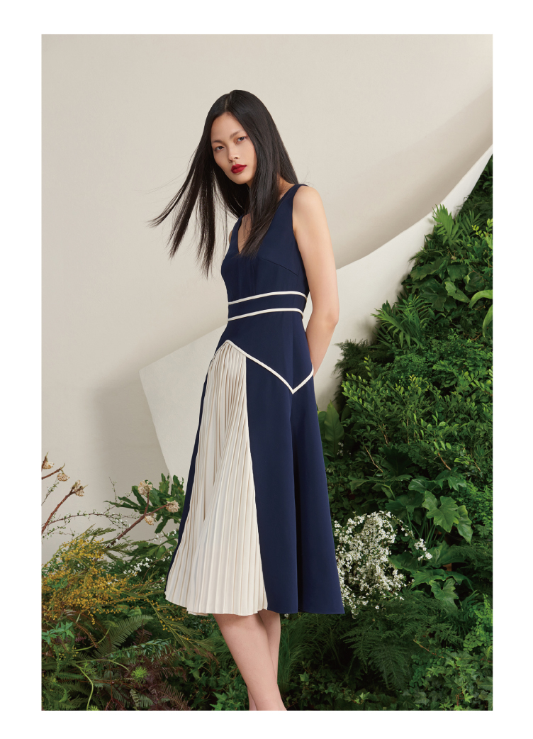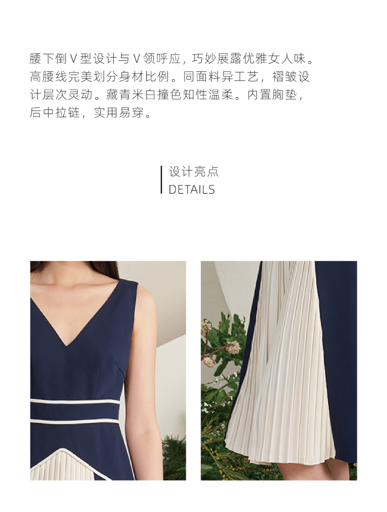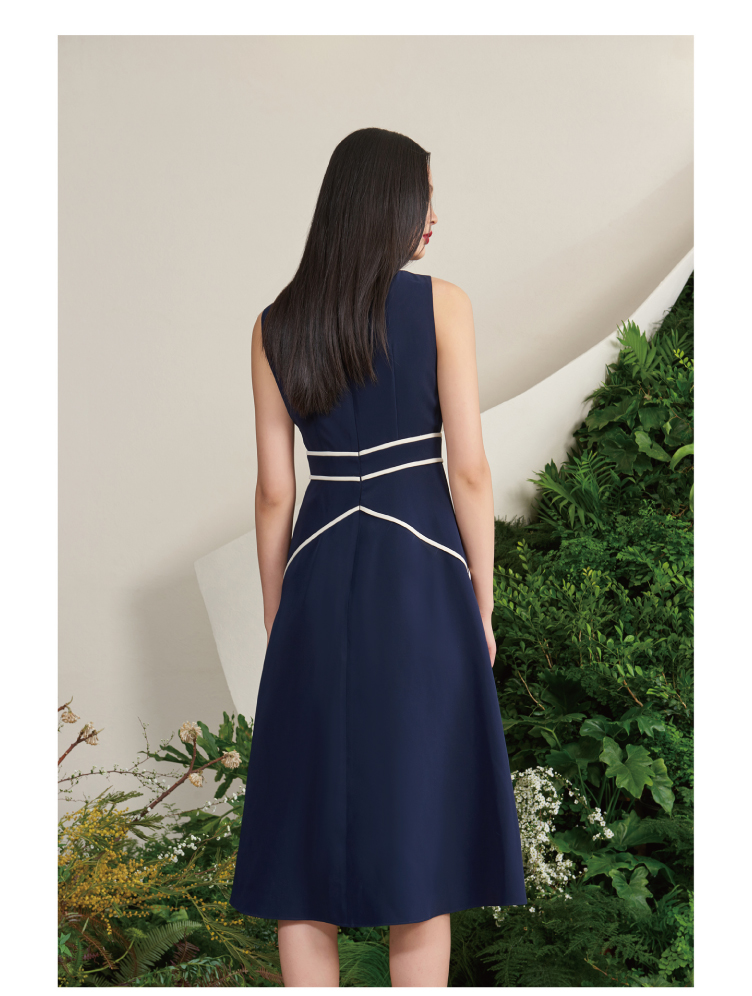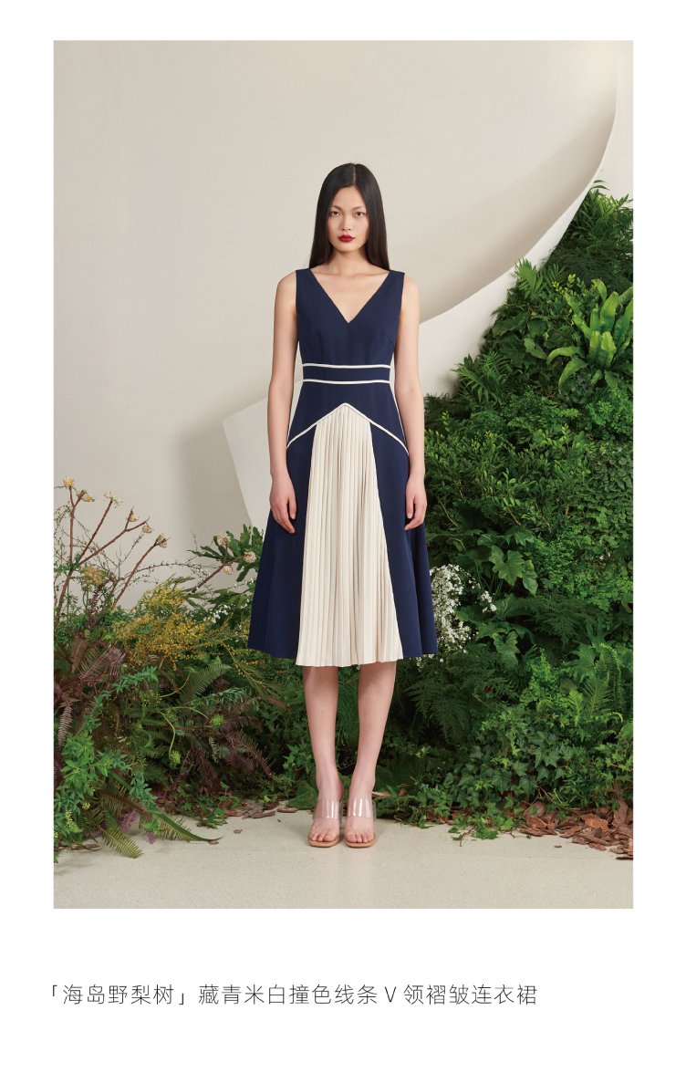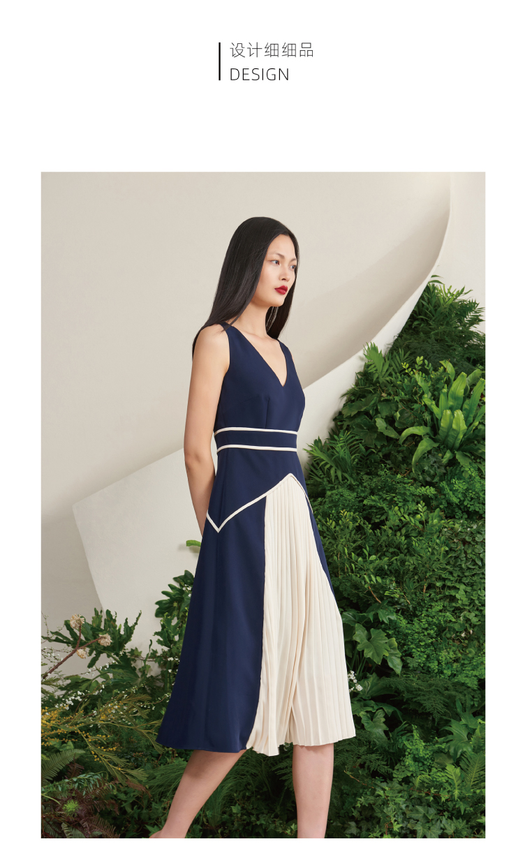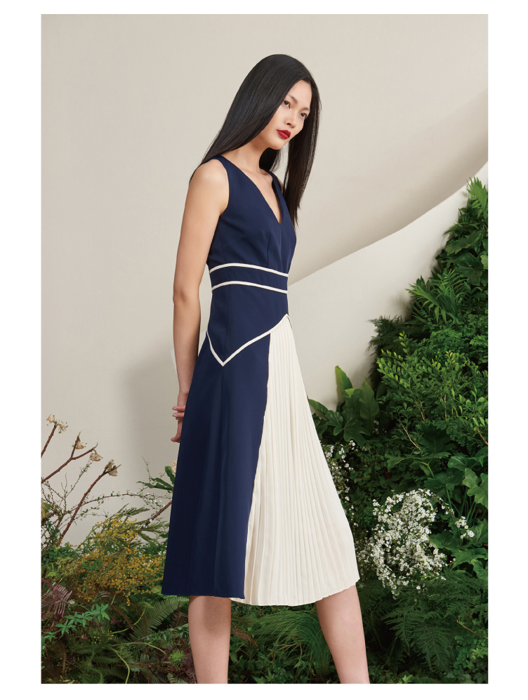 【海岛野梨树】藏青米白撞色线条V领褶皱连衣裙/0000679A