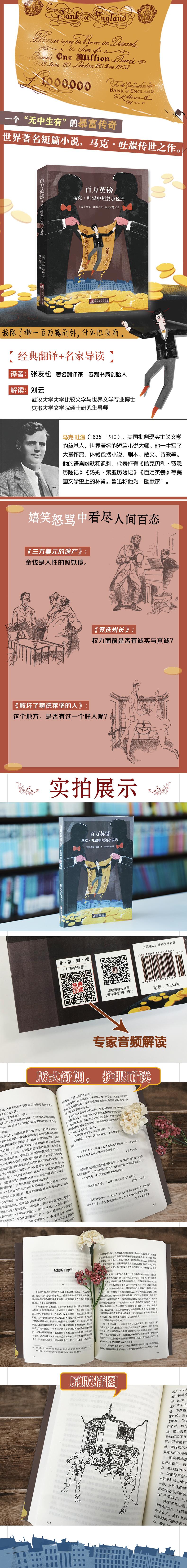 本书共收录了马克·吐温19篇中短篇小说,其中以《百万英镑》、《竞选州长》、《加利福尼亚人的故事》等非常出名,《百万英镑》目前收录于我国语文教材中,是马克.吐温众多中短篇中的一颗明珠。《百万英镑》中的主人公亨利是一位流浪到英国的穷困美国青年。偶然被两个富翁选中,成为了赌约中得到百万英镑的人。其中一个富翁赌定亨利会在30天内饿死街头,另一个则赌他不会饿死。在当时的浮夸的金钱至上的社会,亨利的人生也因为这突如其来的百万支票而发生了翻天覆地的变化。