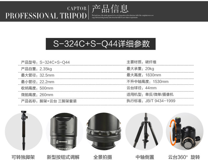 狼族优选 | 捕捉者CAPTOR S-324C+S-Q44纯碳纤维三脚架