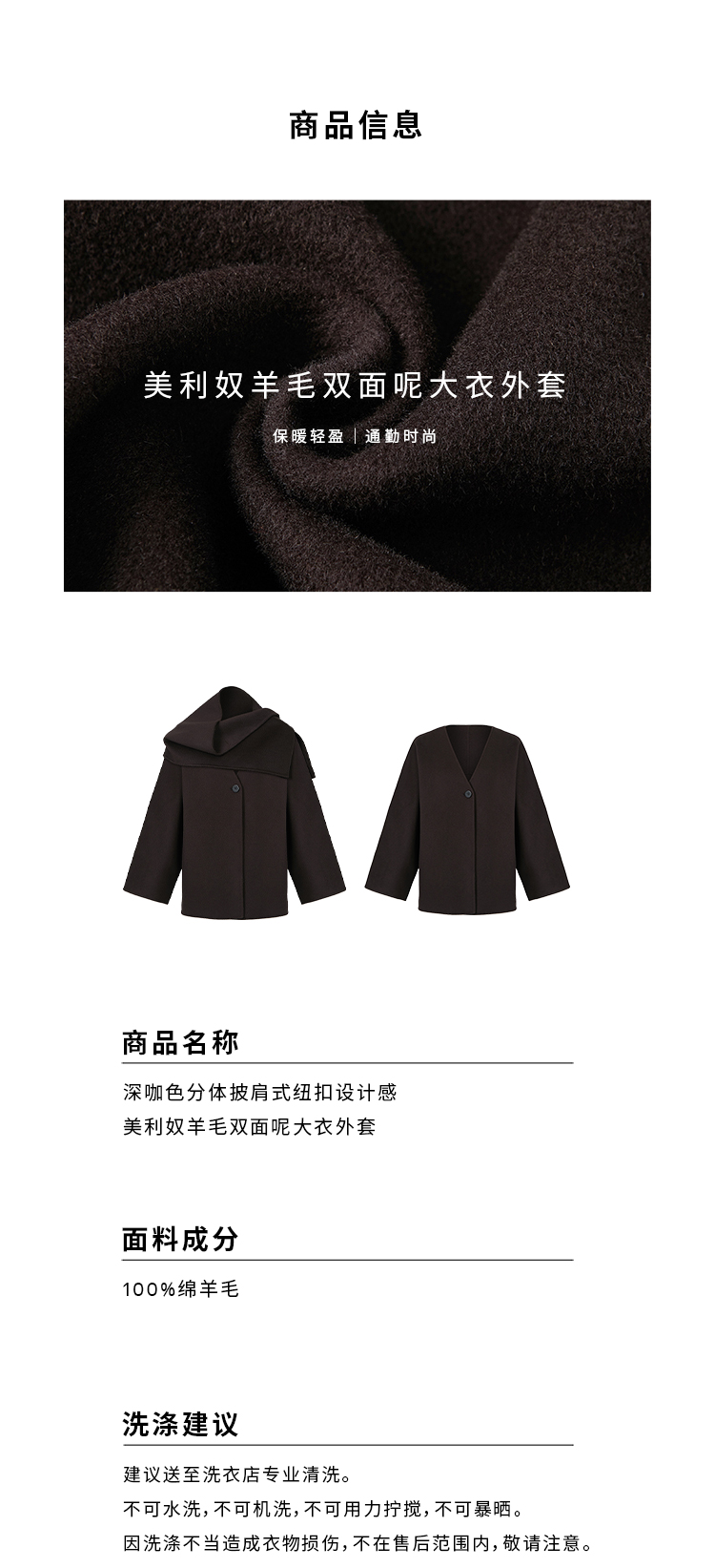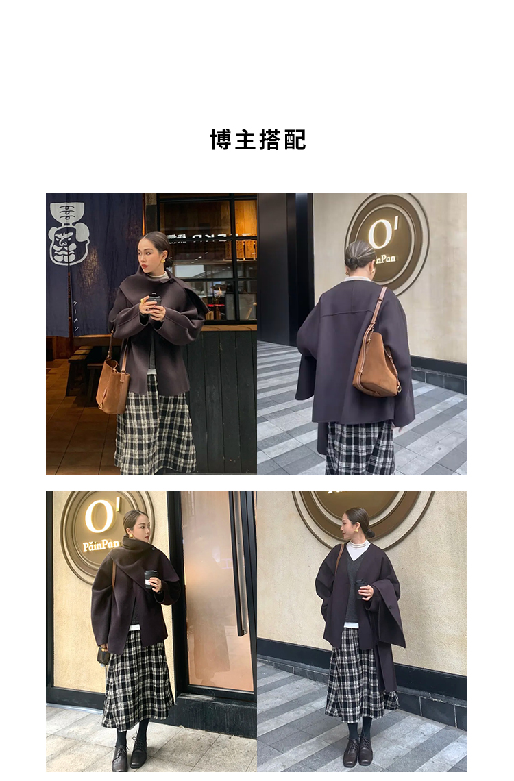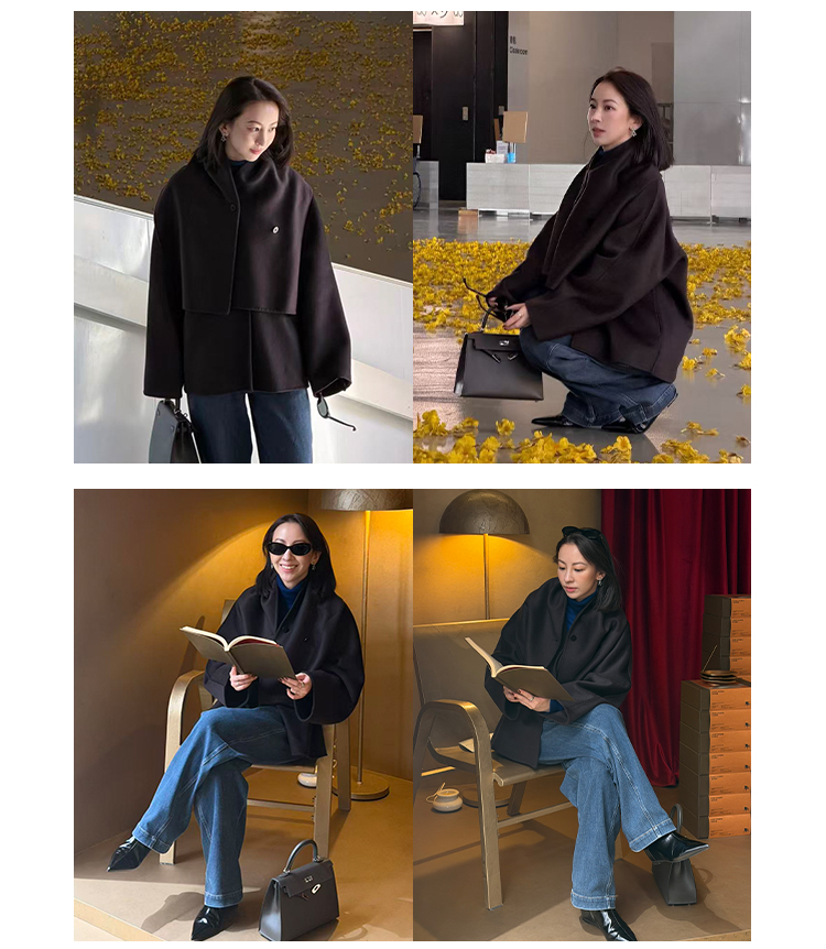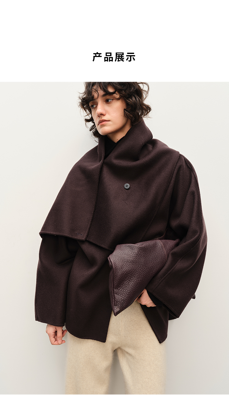 HIDEMI 深咖色分体披肩式纽扣设计感美利奴羊毛双面呢大衣外套女