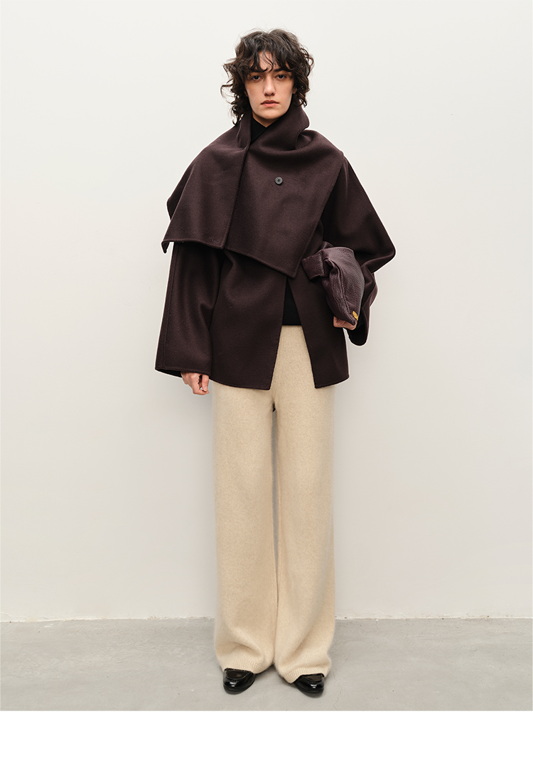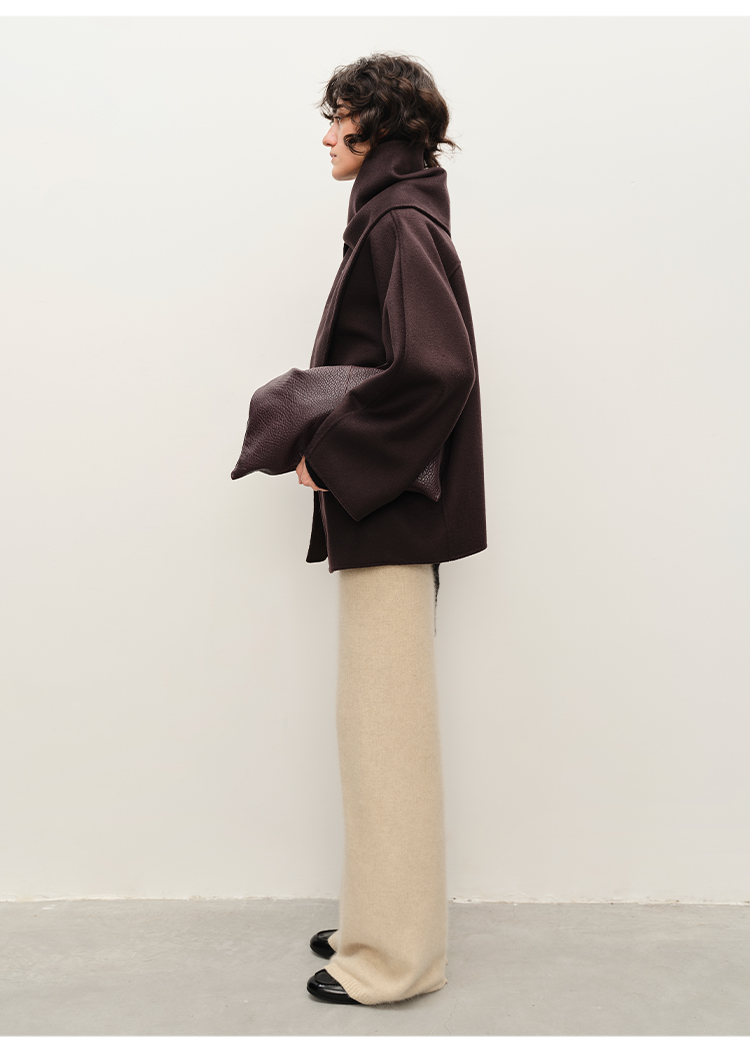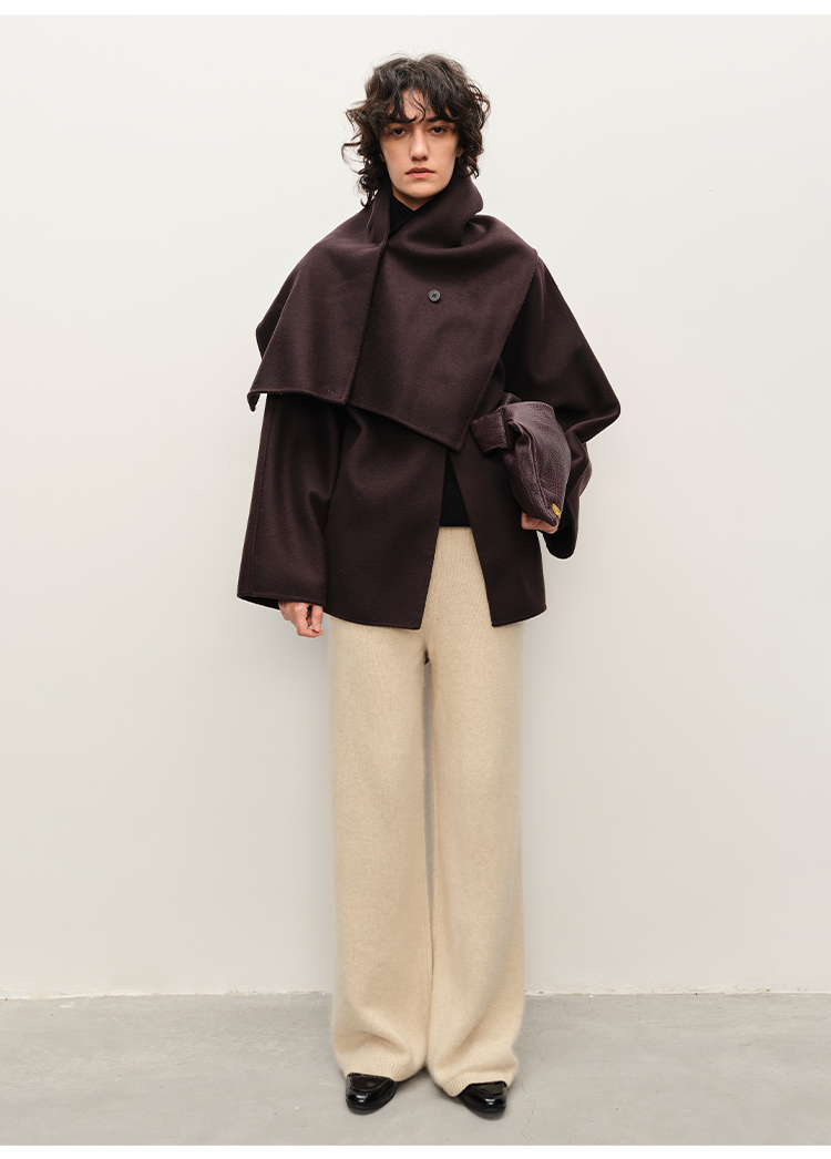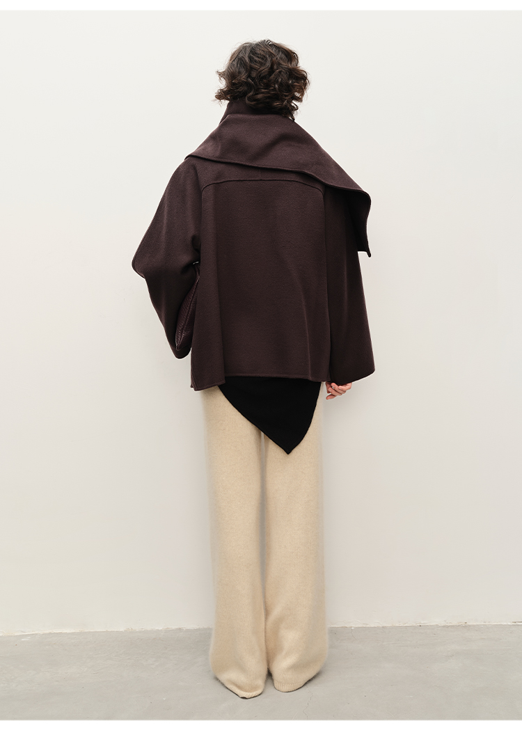 HIDEMI 深咖色分体披肩式纽扣设计感美利奴羊毛双面呢大衣外套女