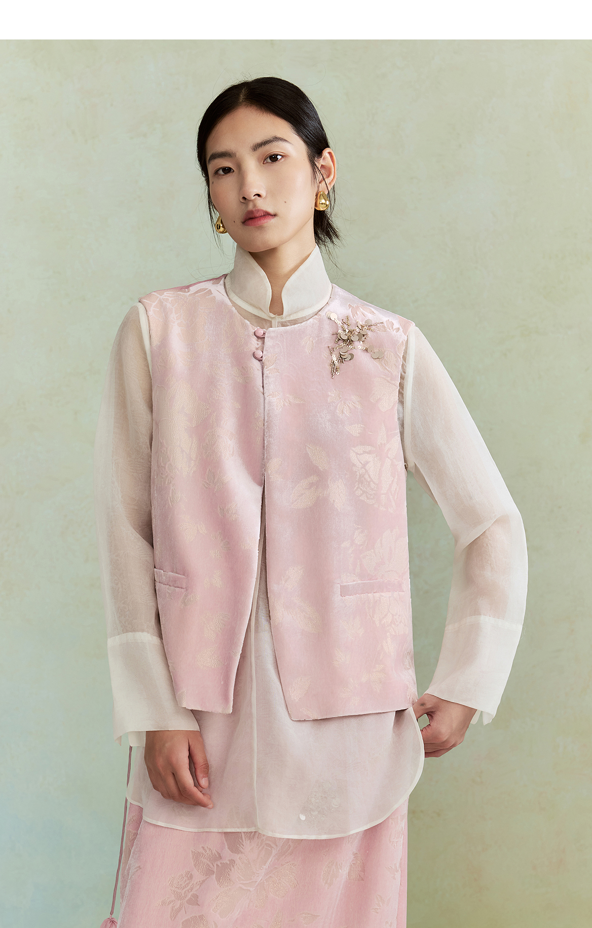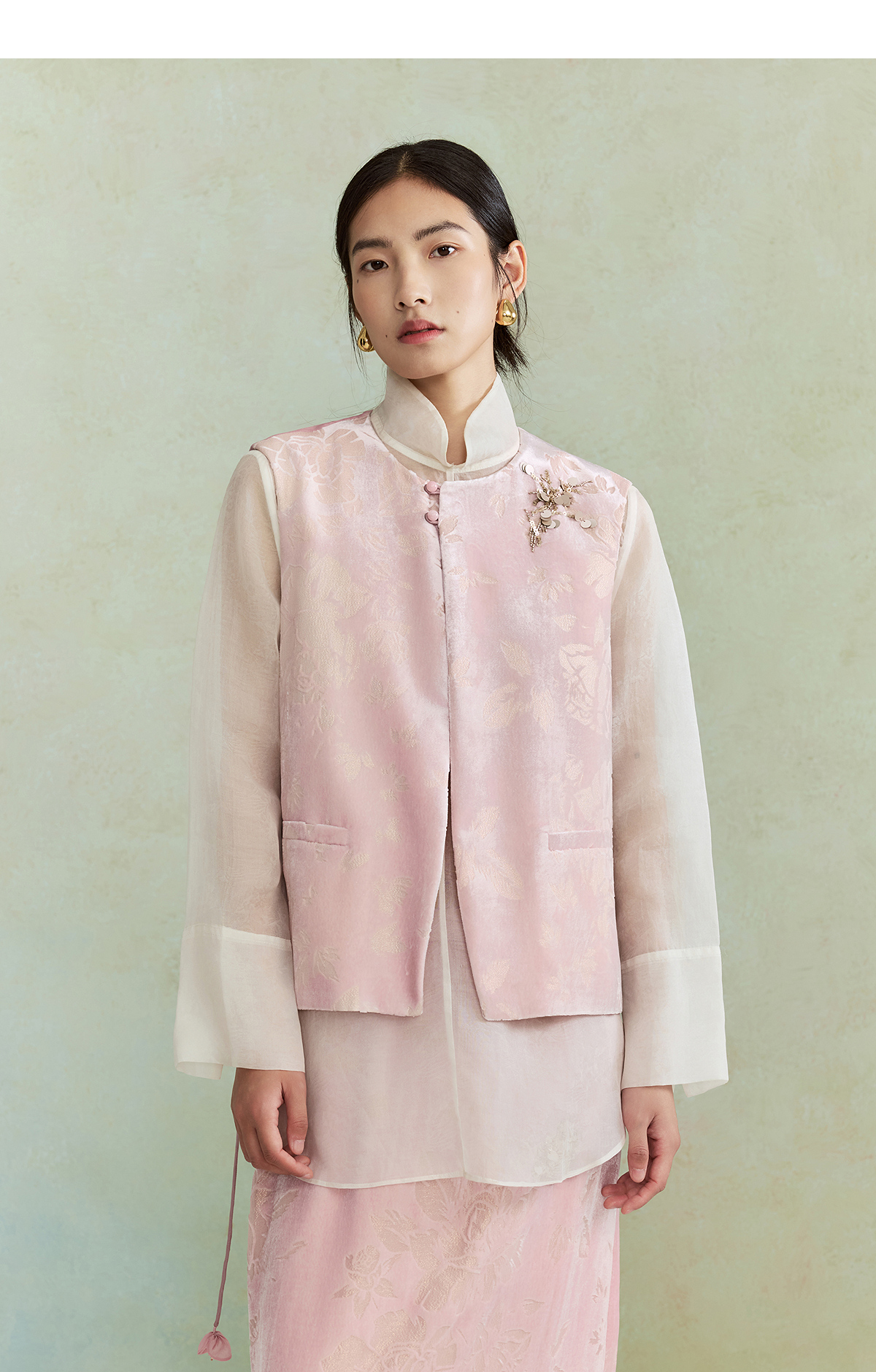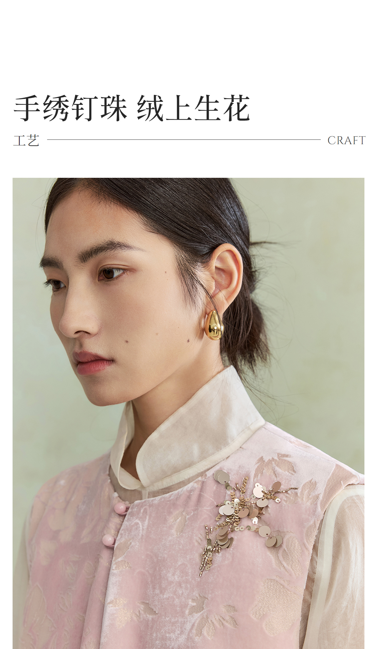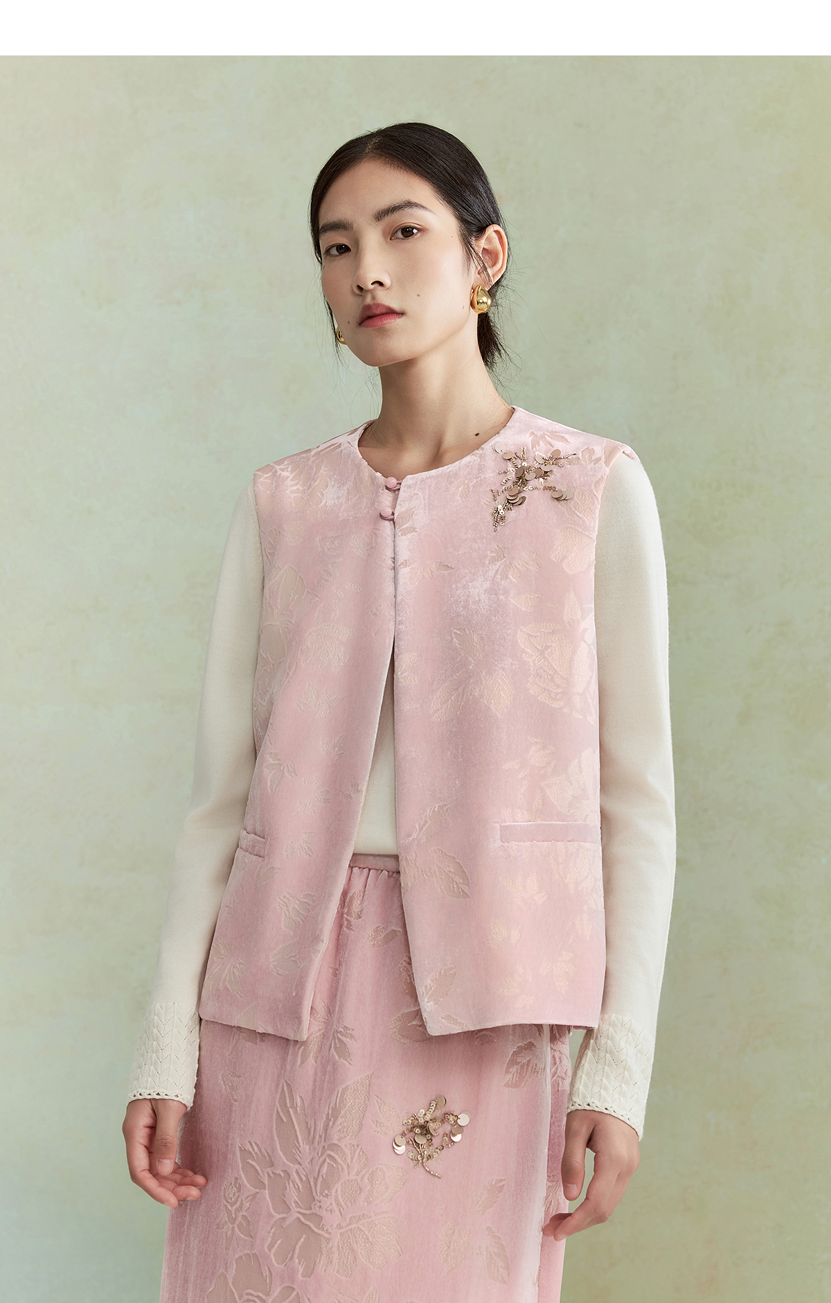【林栖设计小店】(现货)粉色马甲新中式丝绒烧花钉珠绣花优雅2026早春新款外套女1961039