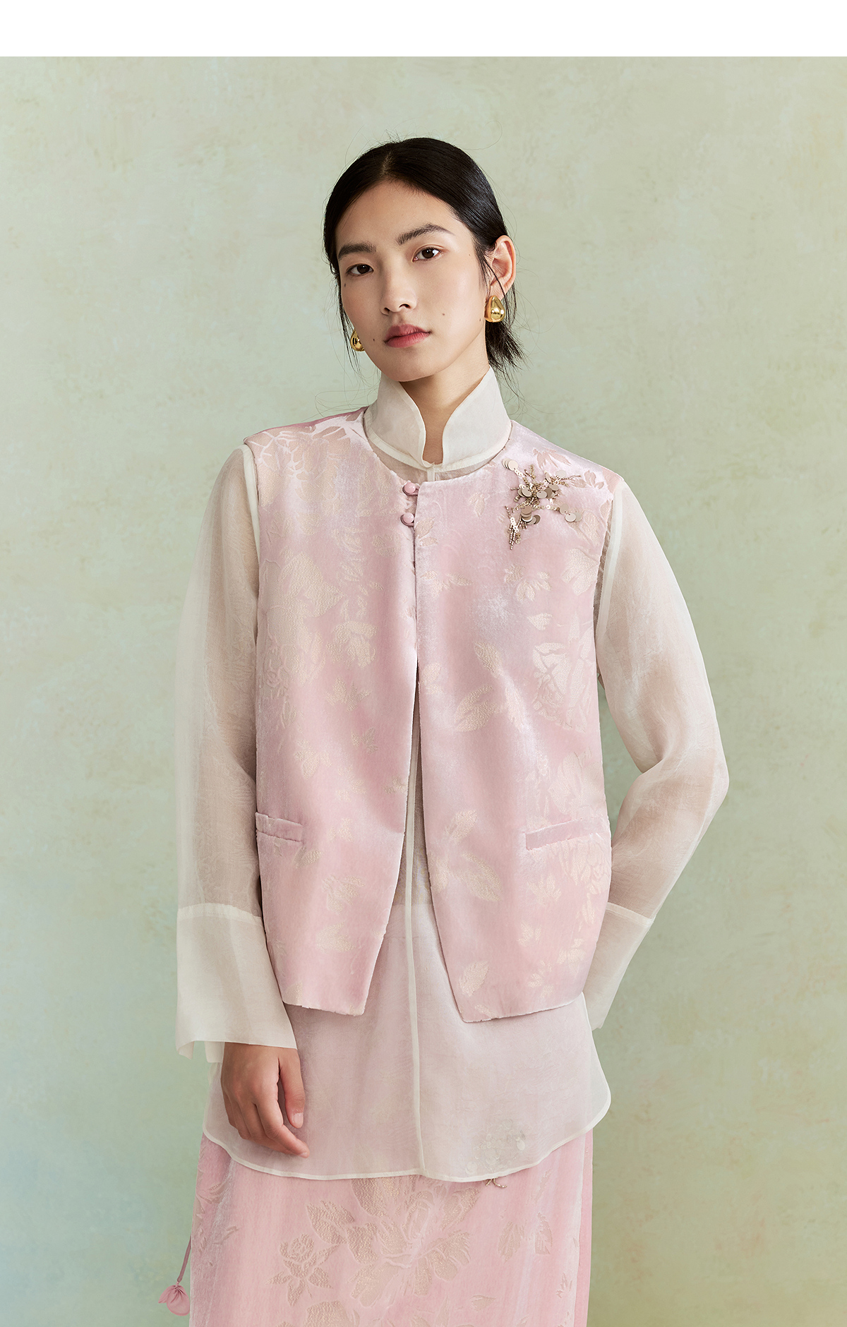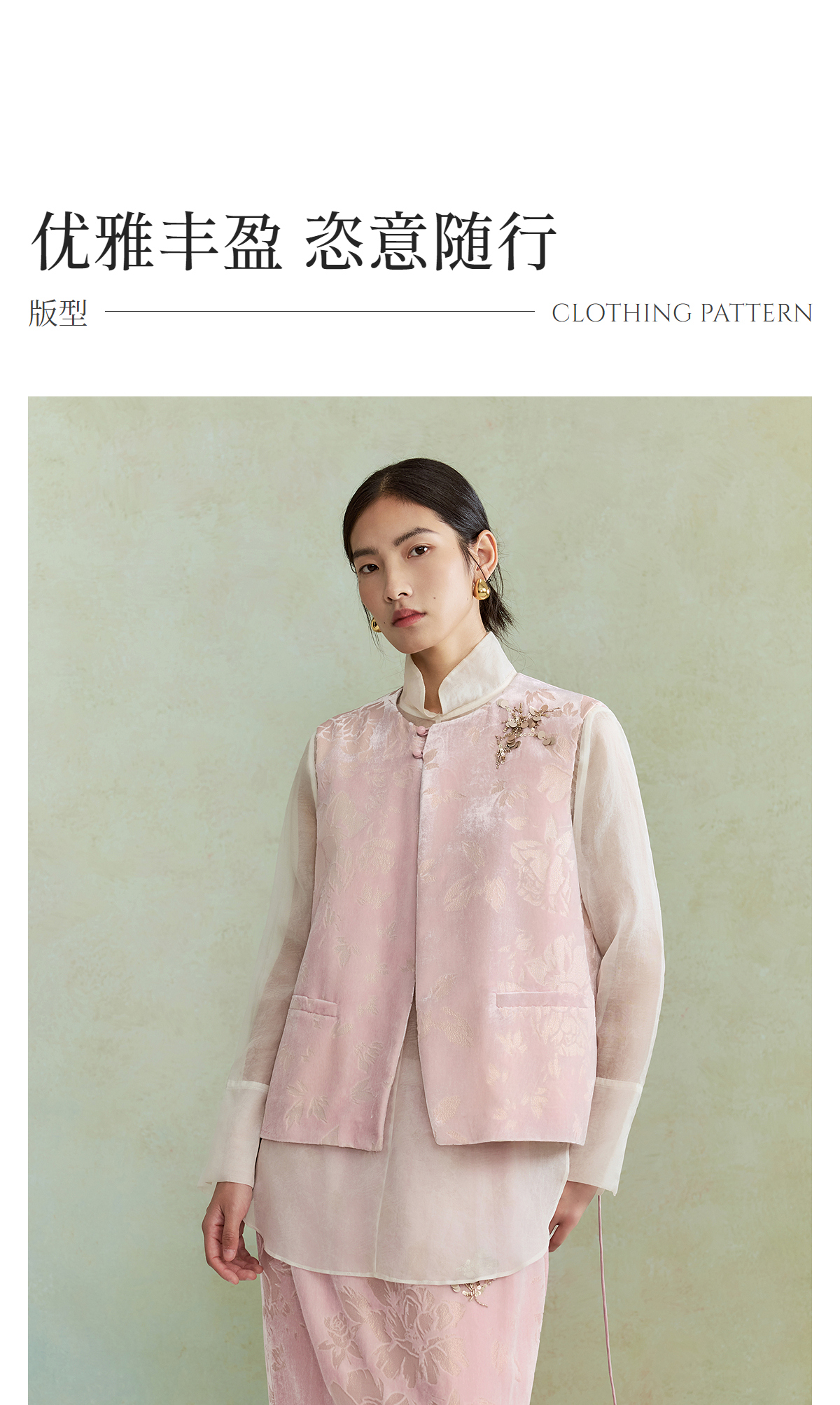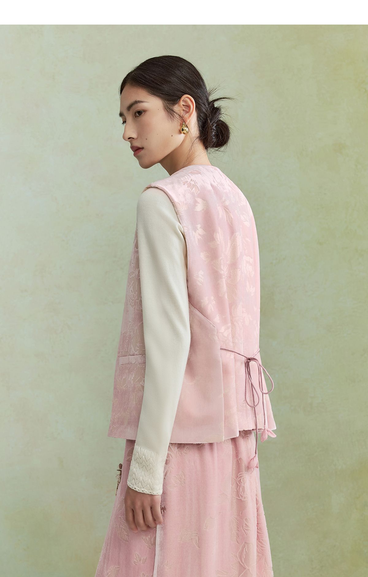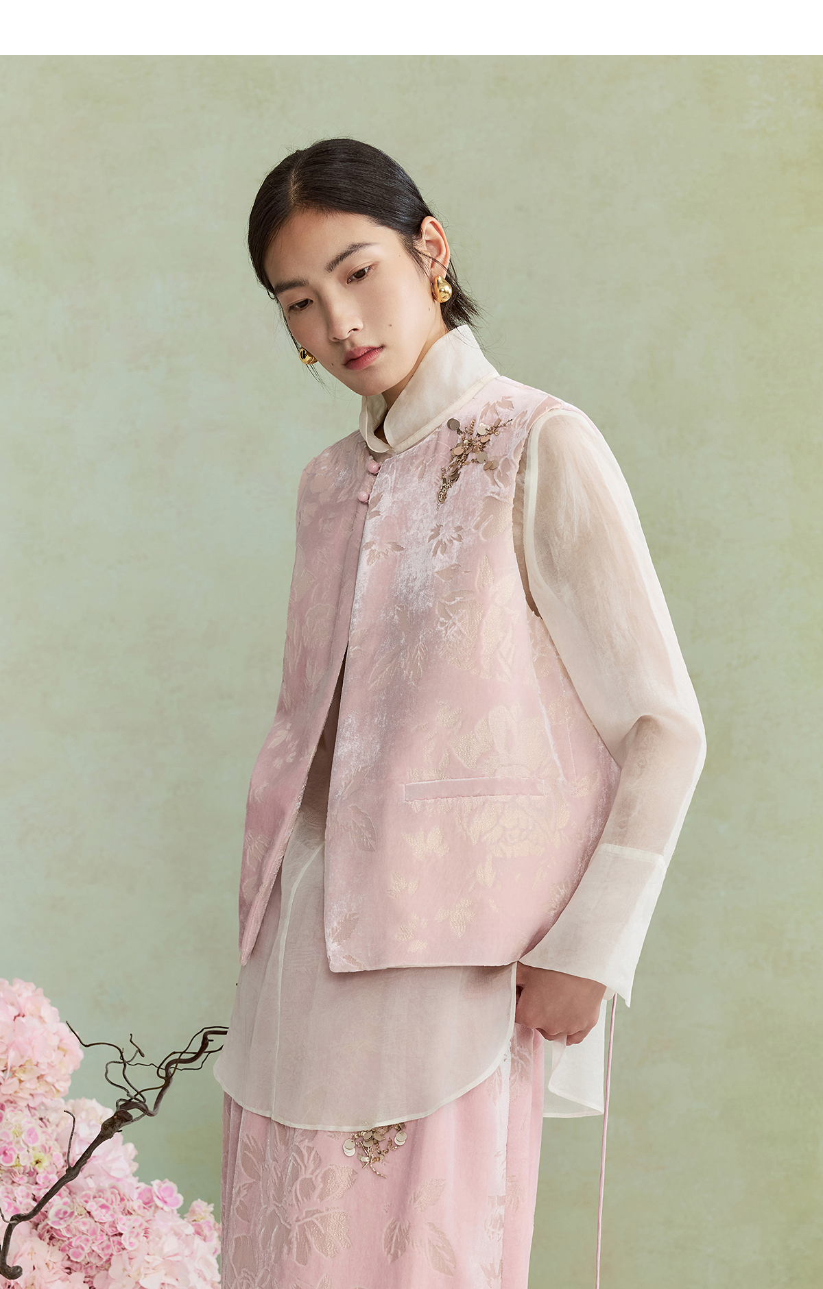 【林栖设计小店】(现货)粉色马甲新中式丝绒烧花钉珠绣花优雅2026早春新款外套女1961039