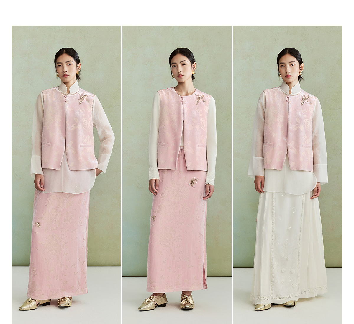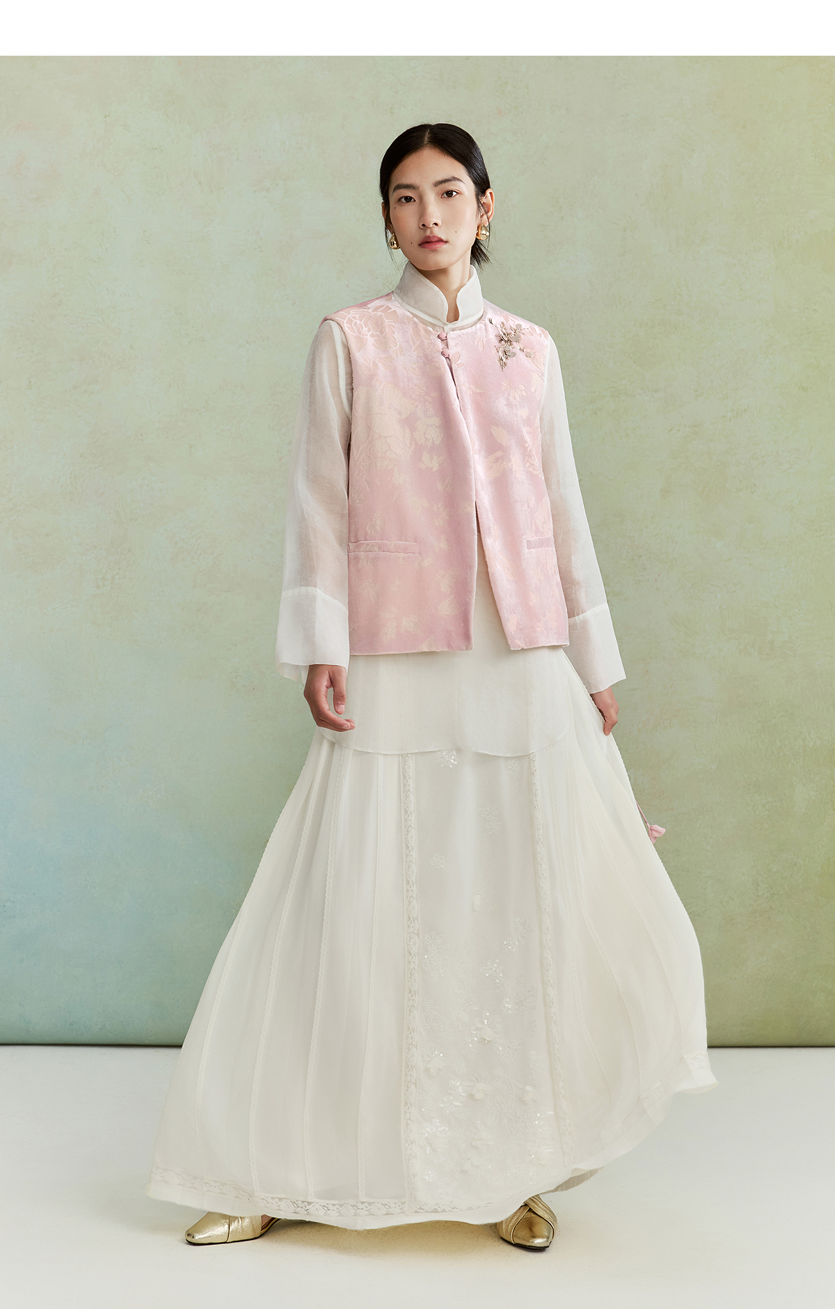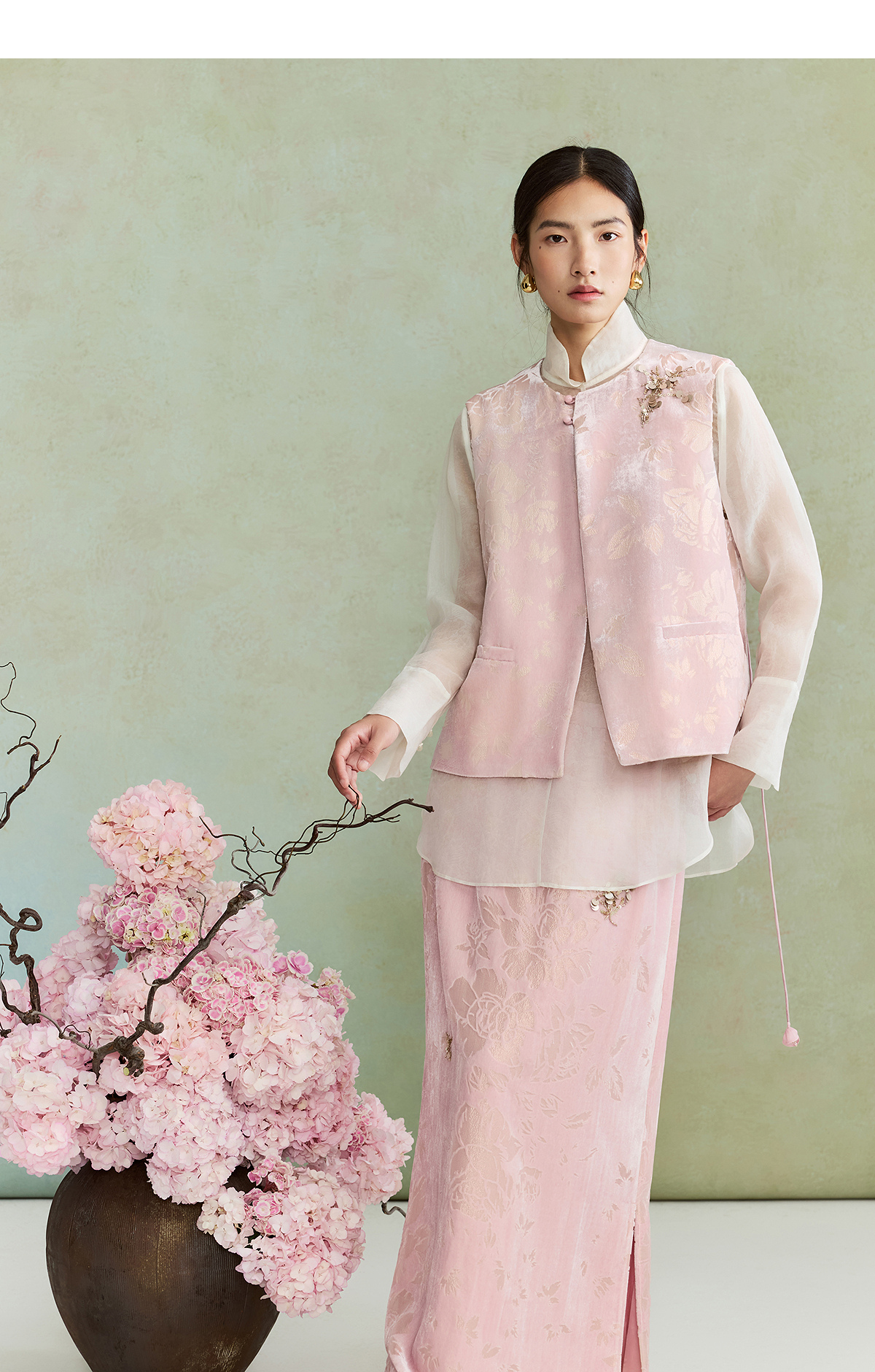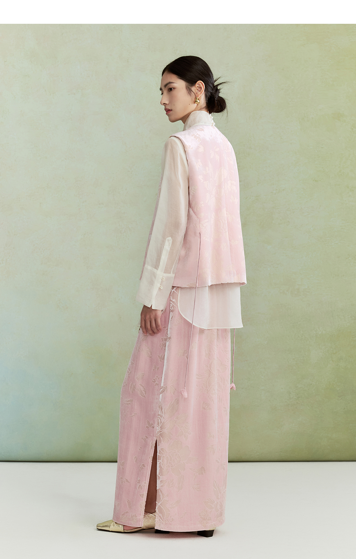 【林栖设计小店】(现货)粉色马甲新中式丝绒烧花钉珠绣花优雅2026早春新款外套女1961039