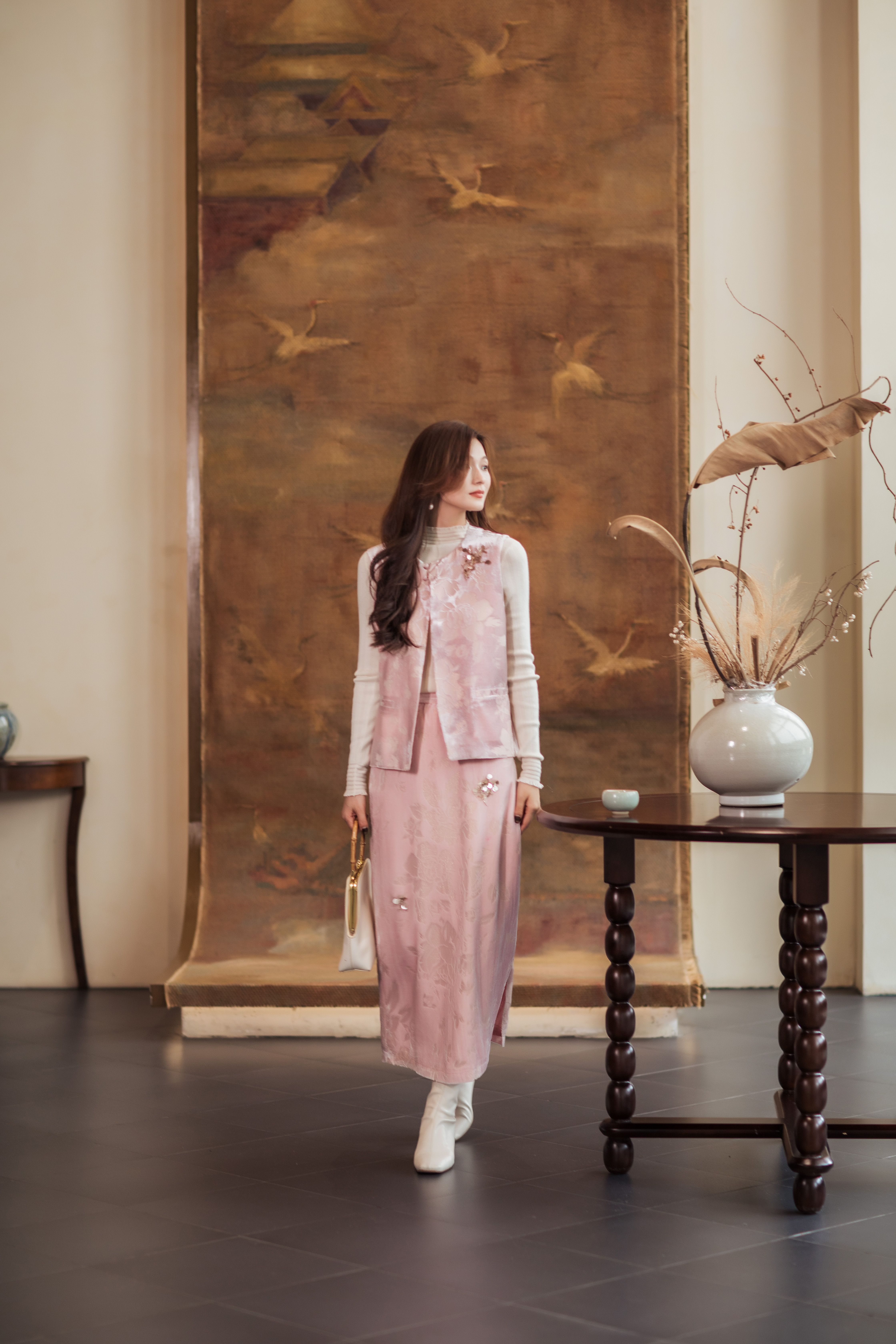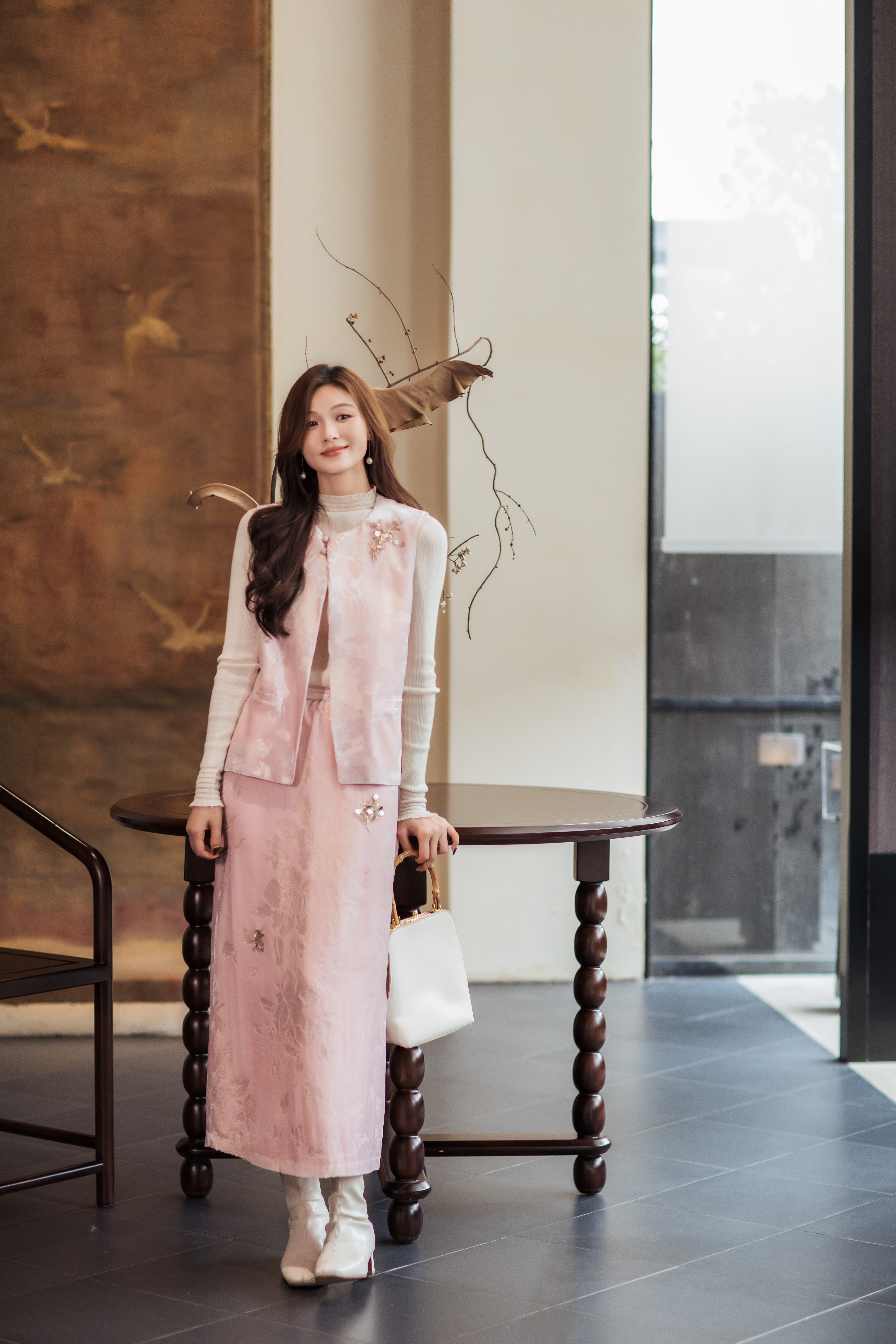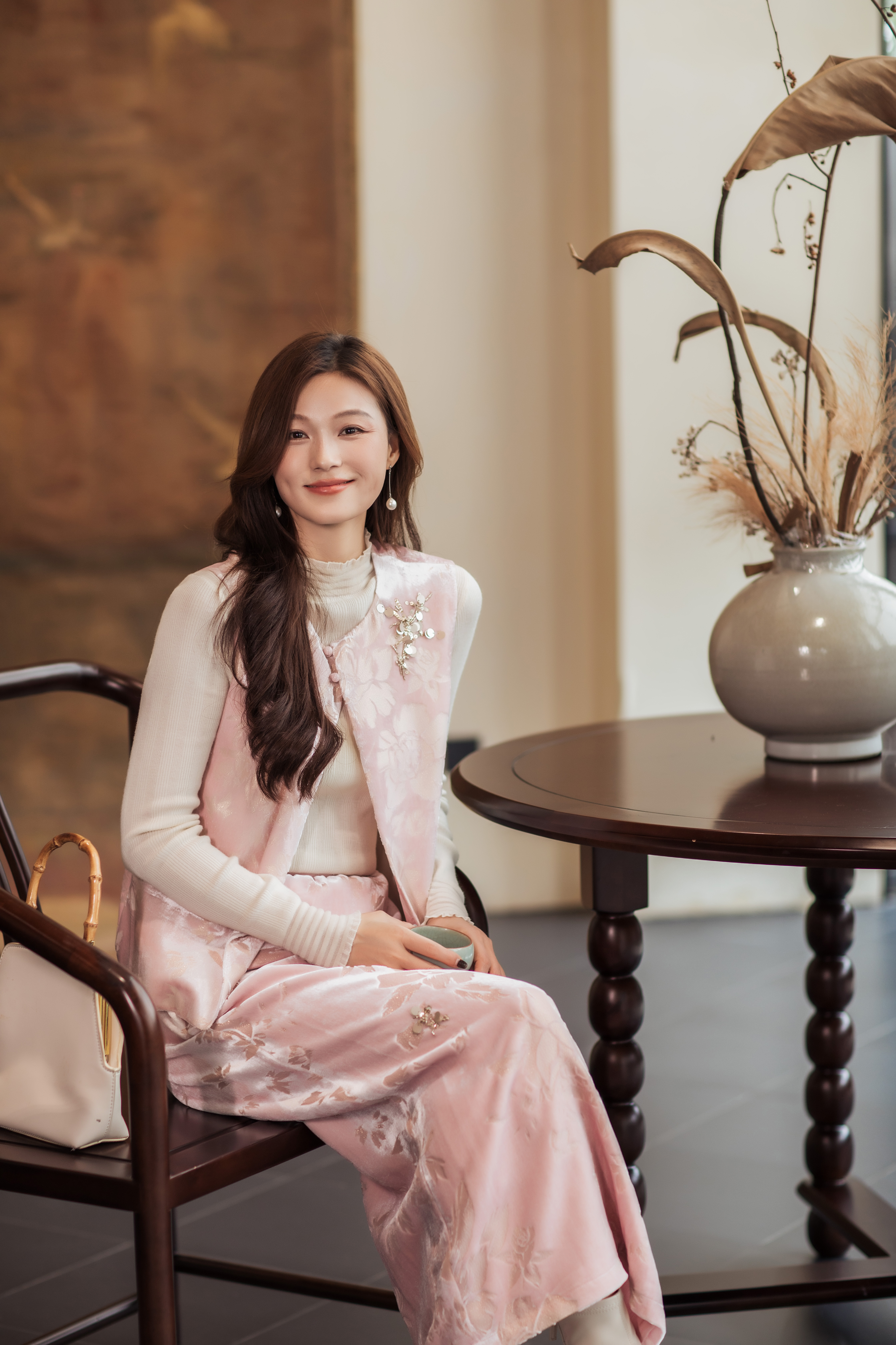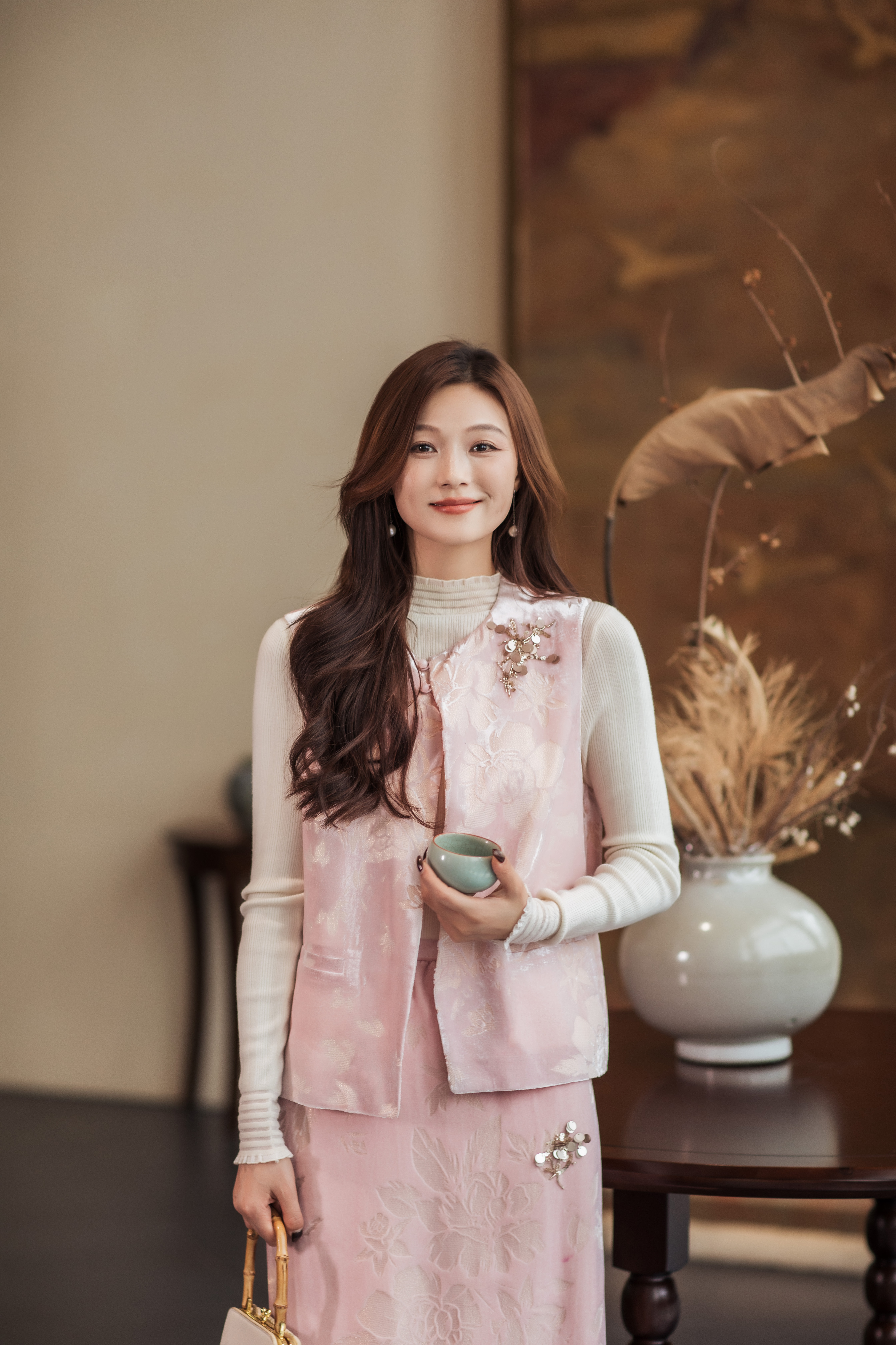 【林栖设计小店】(现货)粉色马甲新中式丝绒烧花钉珠绣花优雅2026早春新款外套女1961039