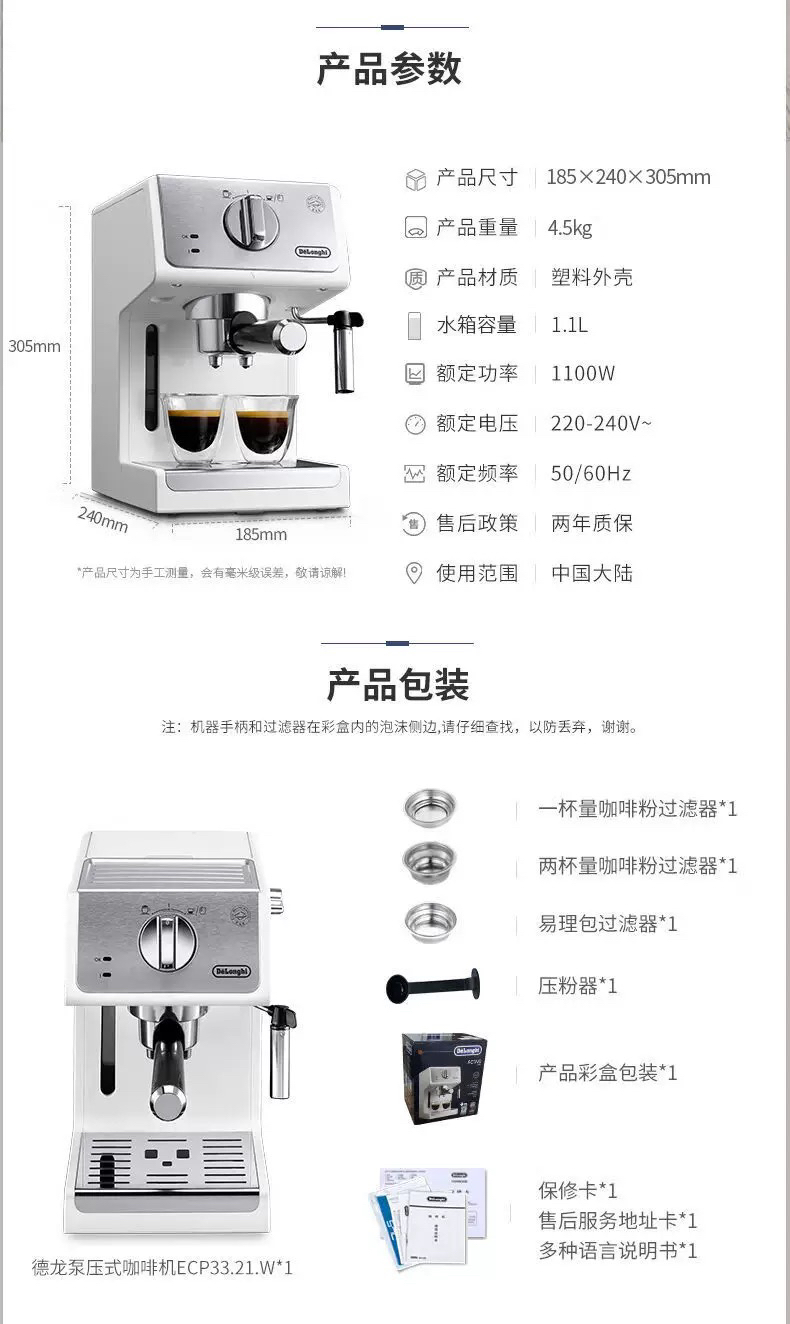 Delonghi/德龙 ECP33.21.W/家用意式泵压式浓缩半自动咖啡机 特价折扣机 购买日期开始全国联保两年