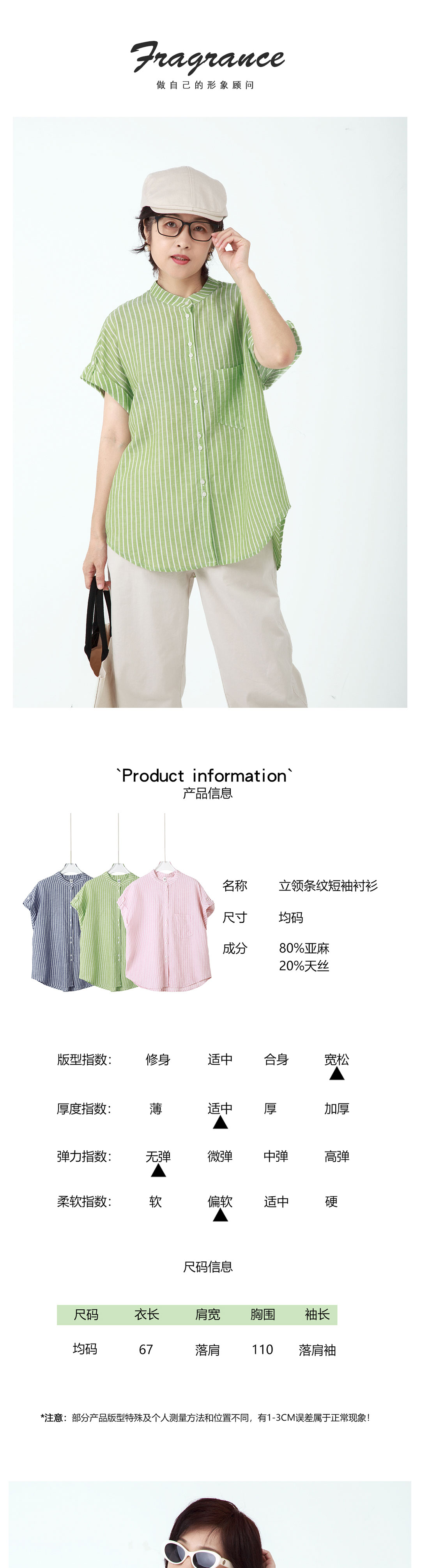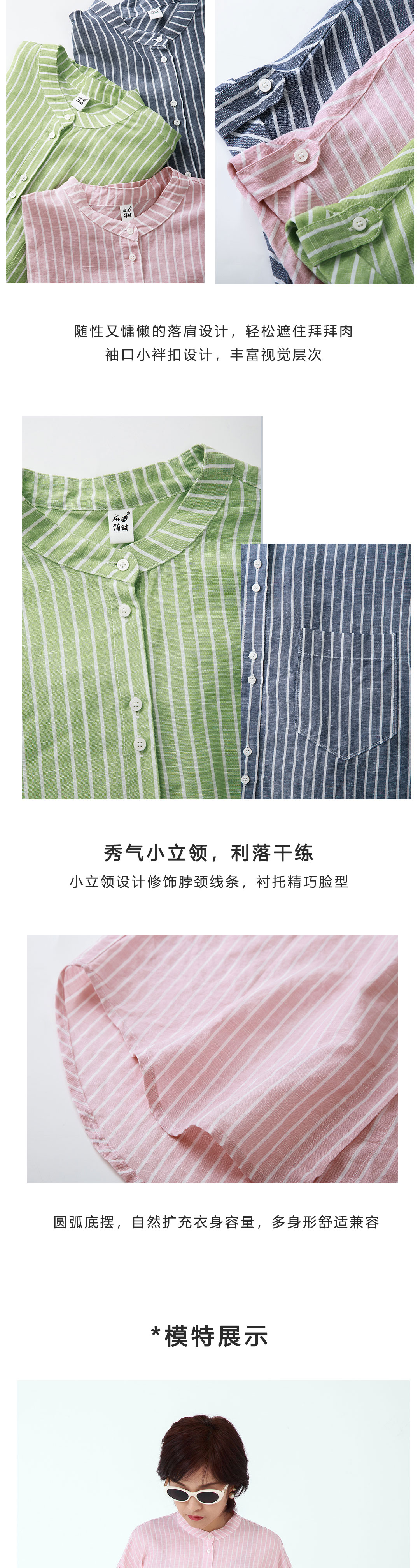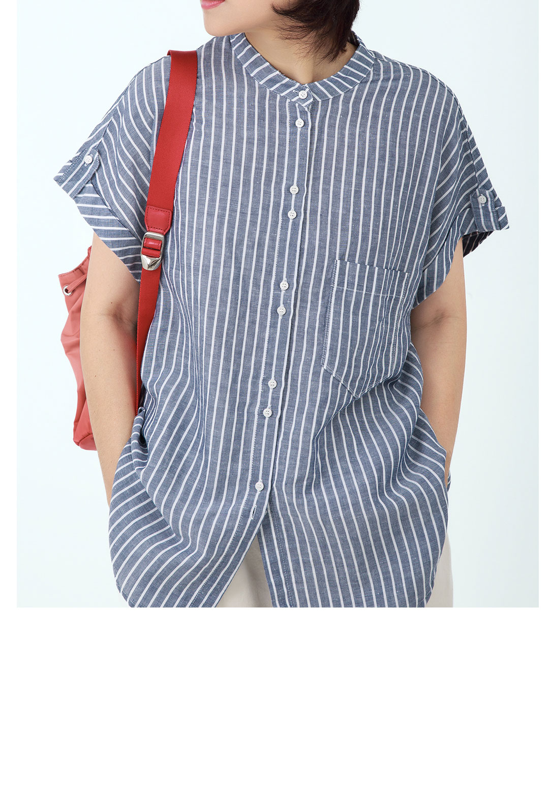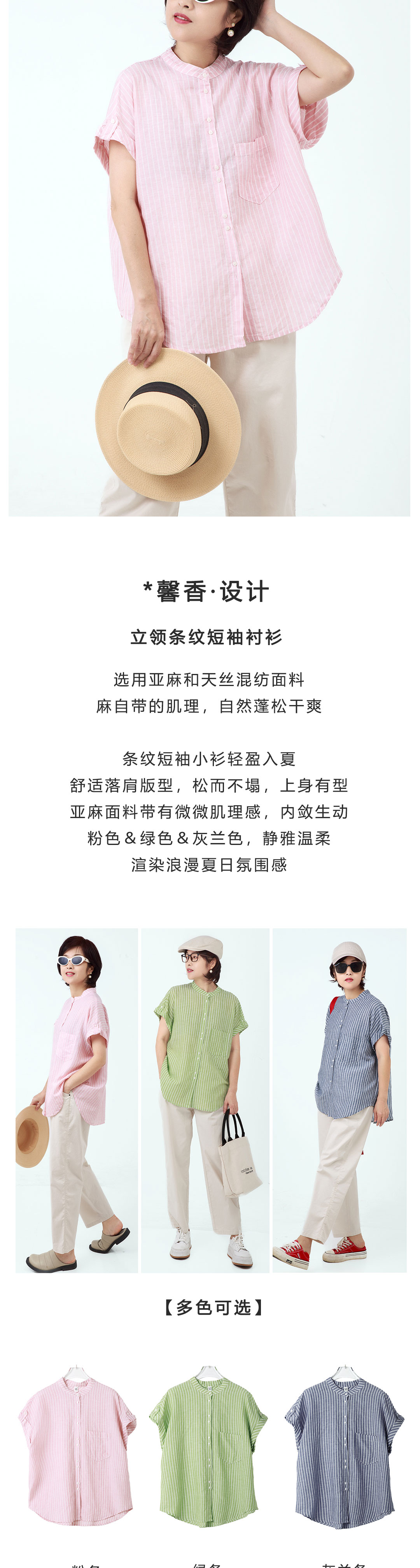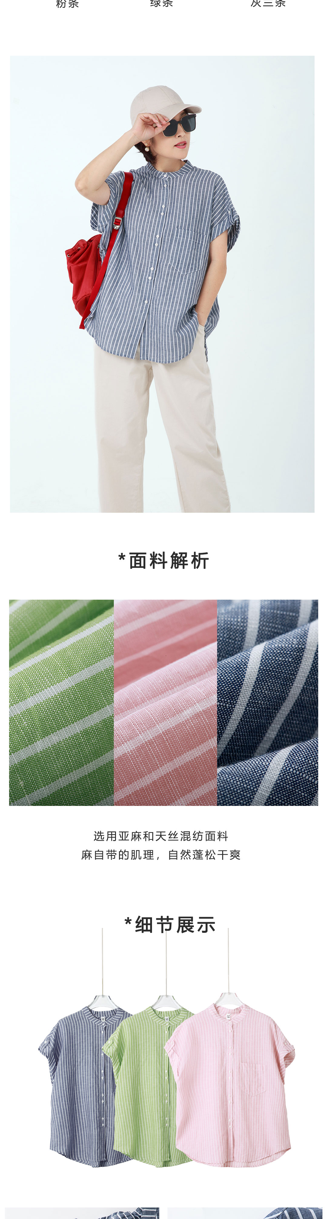 立领条纹短袖衬衫