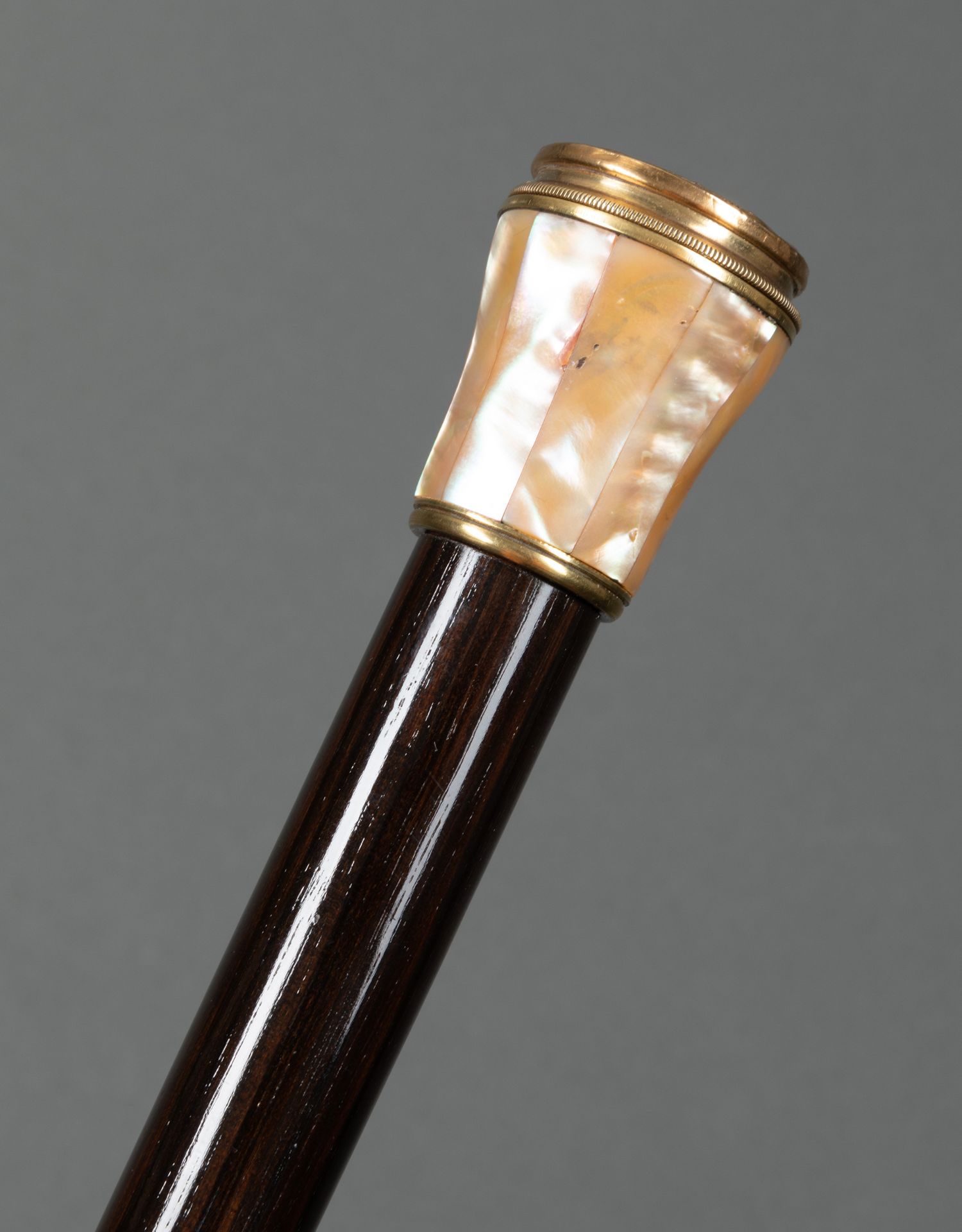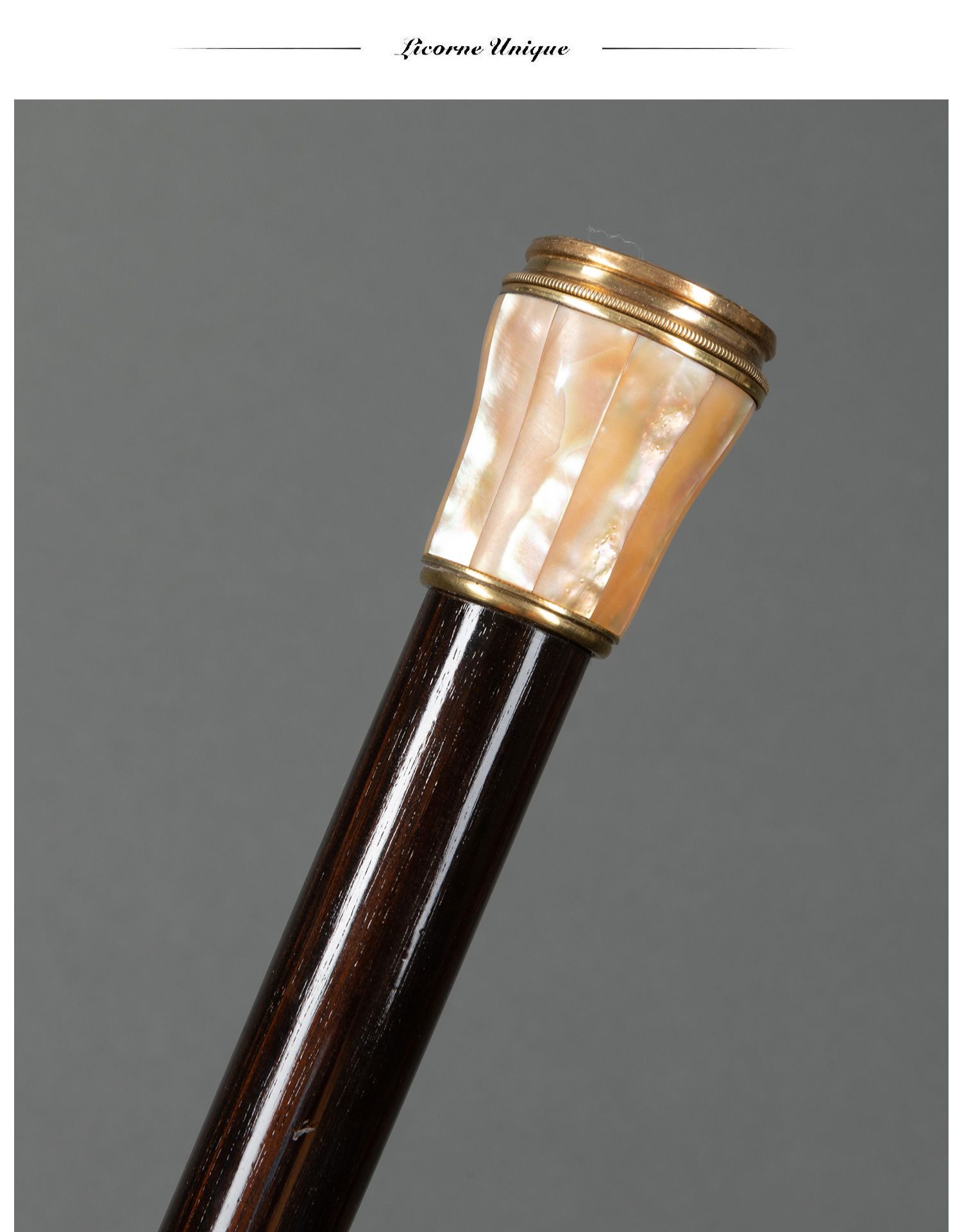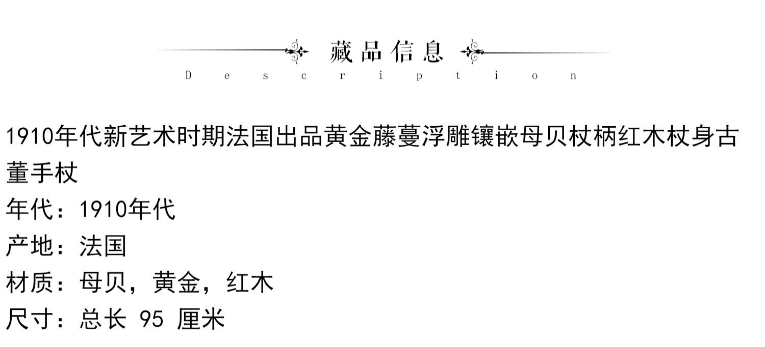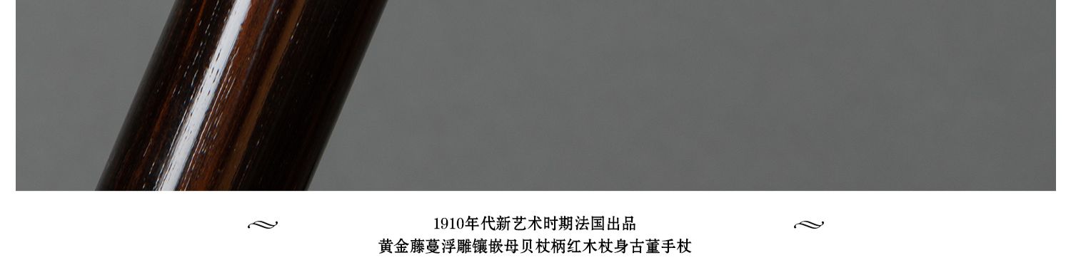 独角鹿西洋古董法国黄金藤蔓浮雕镶嵌母贝杖柄红木杖身古董手杖