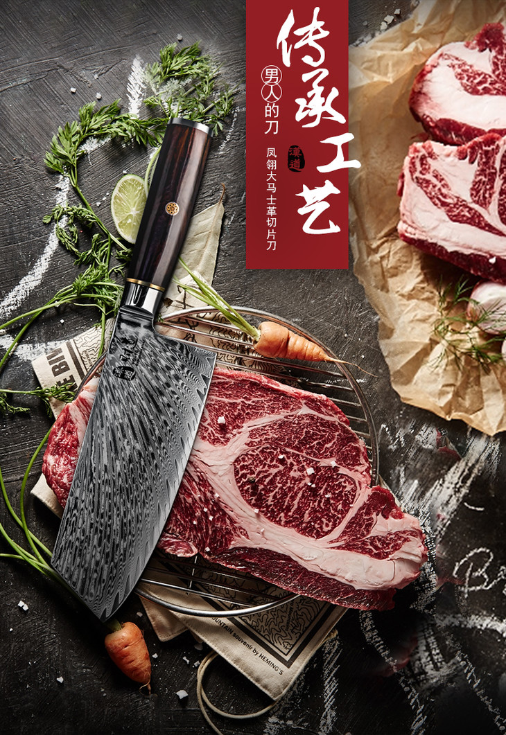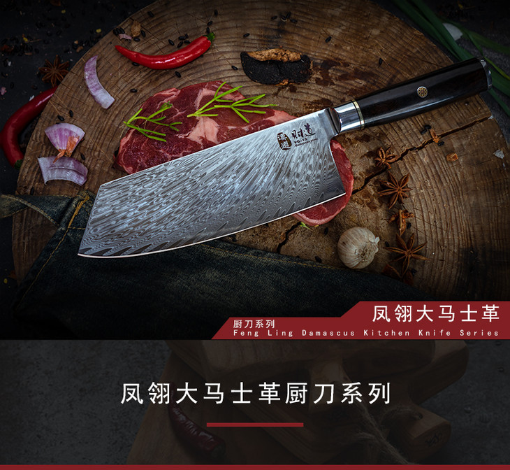 汉道-【凤翎切片刀】大马士革钢刀菜刀家用厨房刀具切菜刀