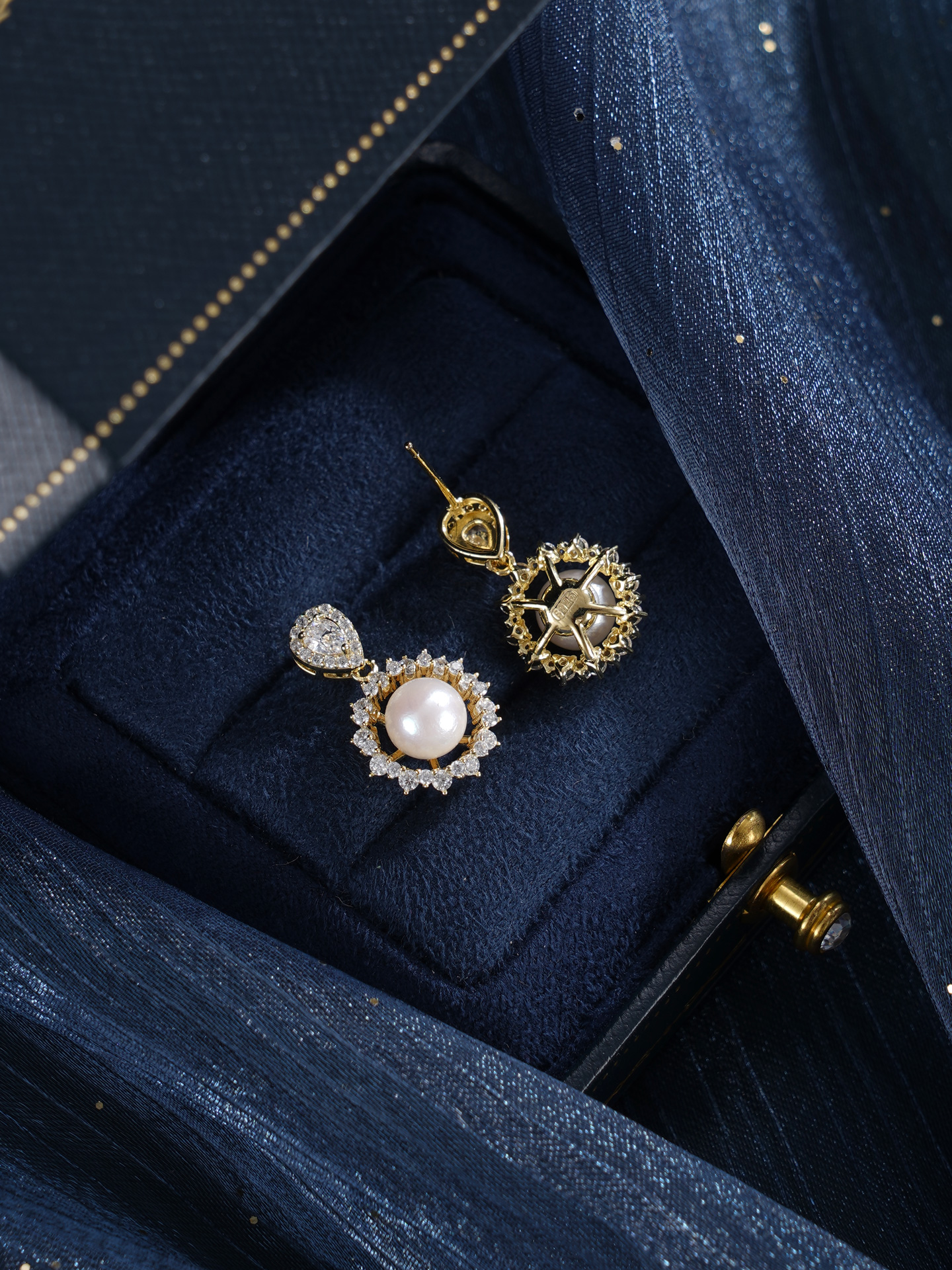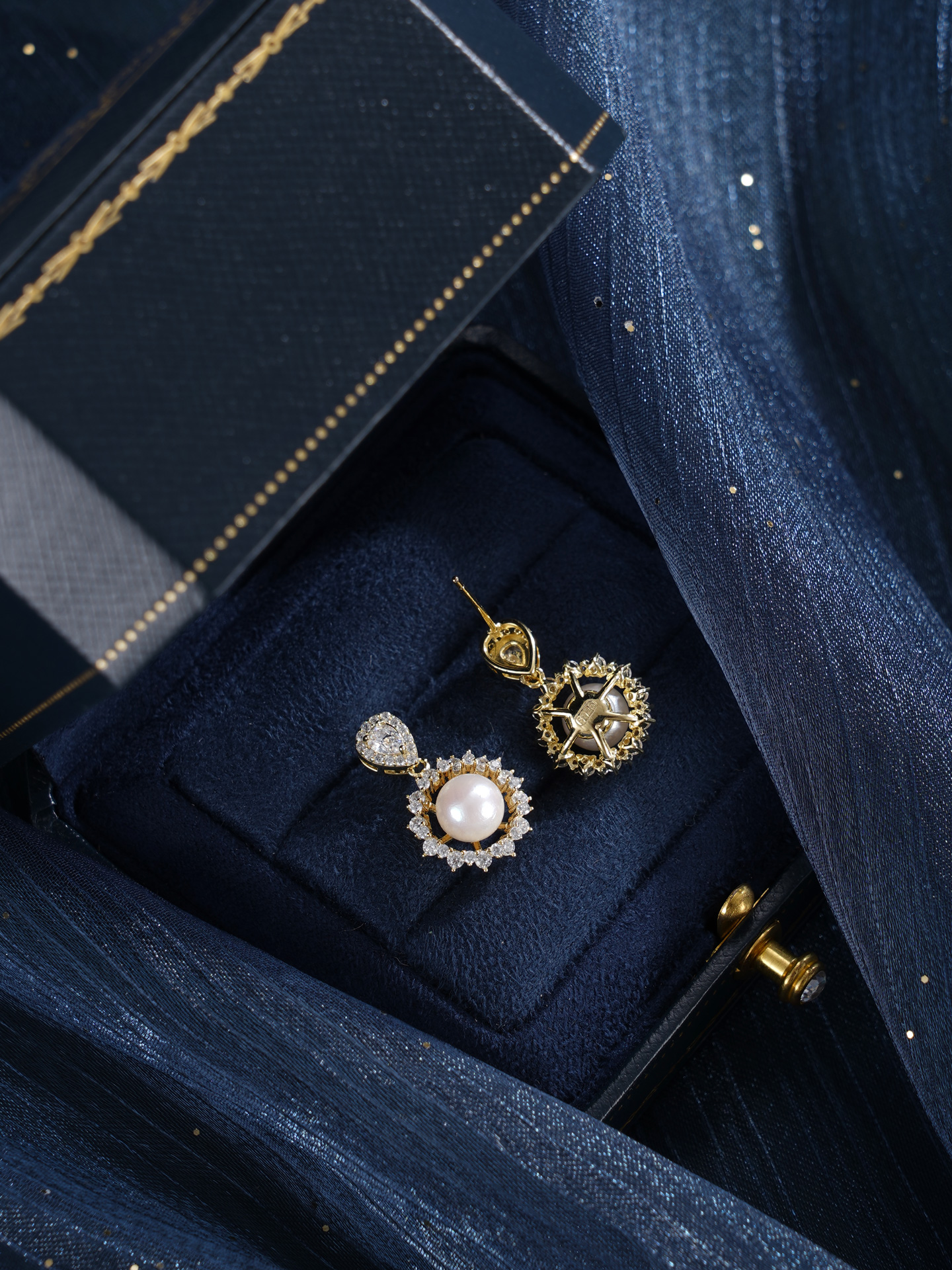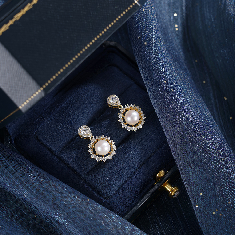 子佩集【星海花开】银S925珍珠惜王妃耳钉【XXED006】6.2mm珠镀金太阳花水滴2601