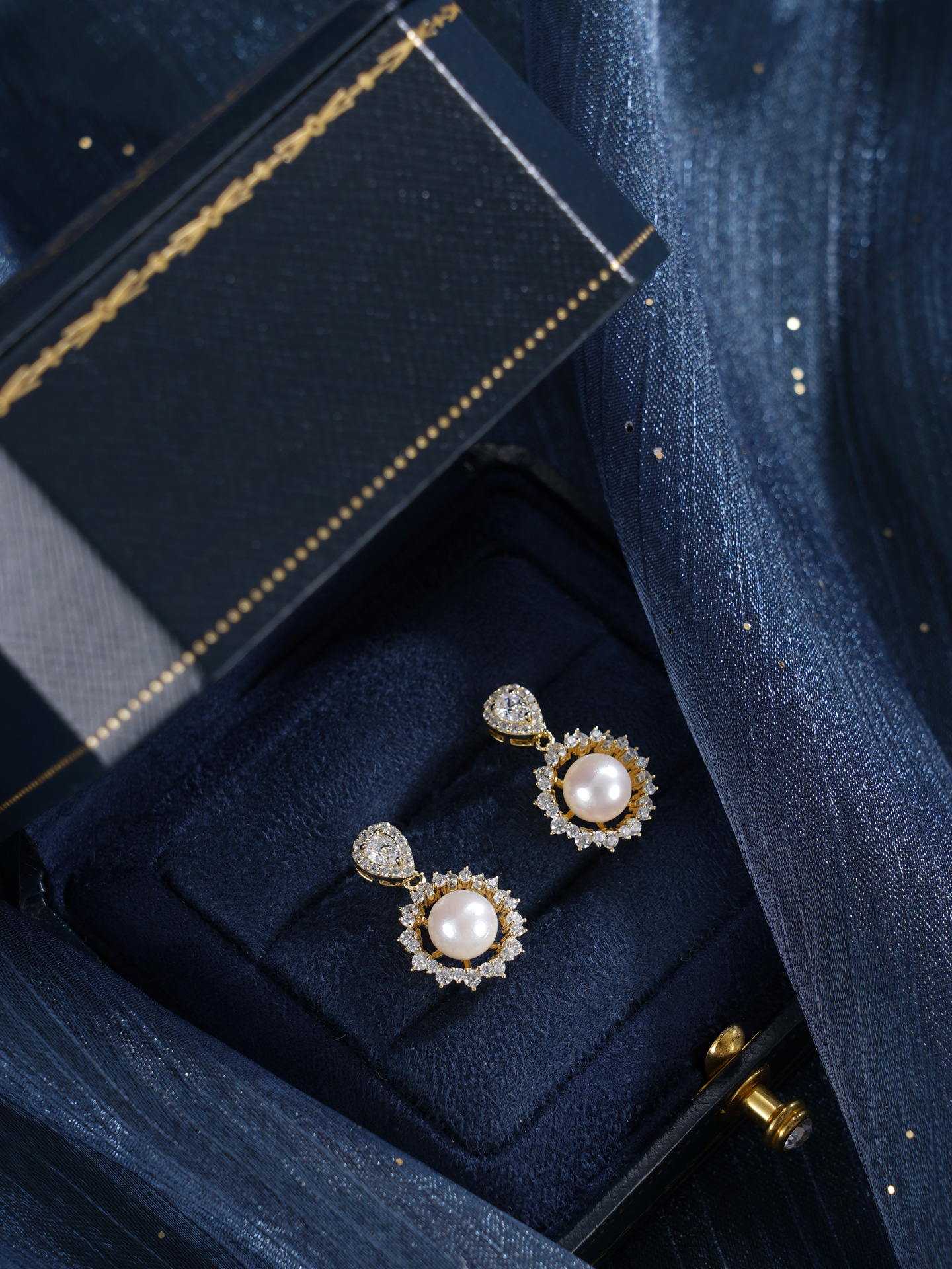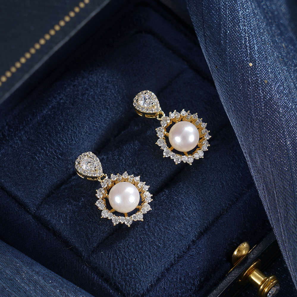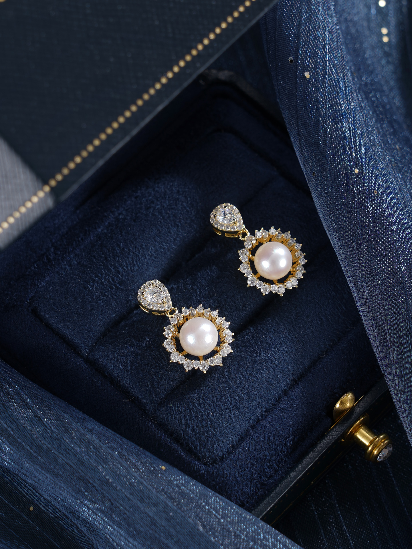 子佩集【星海花开】银S925珍珠惜王妃耳钉【XXED006】6.2mm珠镀金太阳花水滴2601