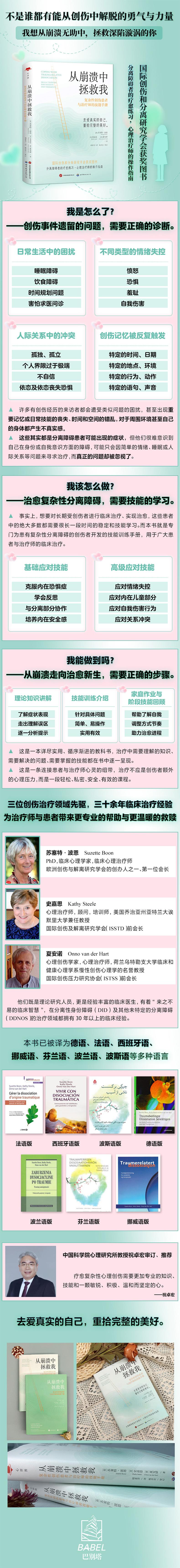 本书是一本专为患有创伤相关分离障碍的患者编写的心理创伤恢复指南和训练手册,内容包括治疗相关的理论指导、家庭作业以及各类练习,旨在逐步帮助每一位患者和治疗师完成临床治疗。本书首先向读者讲解了关于分离及其相关症状的理论研究,包括DID、DDNOS和PTSD等分离障碍的基本原理和症状,然后介绍了应对分离障碍的初级技巧,帮助患者克服基本的恐惧,培养安全感,并详细指导了患者如何改善自己个人的日常生活,如睡眠、保健和饮食等方面。随后作者对于分离相关的内容继续进行深入讲解,包括触发分离性障碍的因素,还有与其密切相关的人的情绪和认知的理论知识,接着介绍了更加高级的应对技巧,包括对愤怒、羞耻、内疚等情绪和自我伤害行为的应对,同时相应地指导患者改善在群体中与他人的关系,如对依恋恐惧症、孤独感、个人界限等的处理。