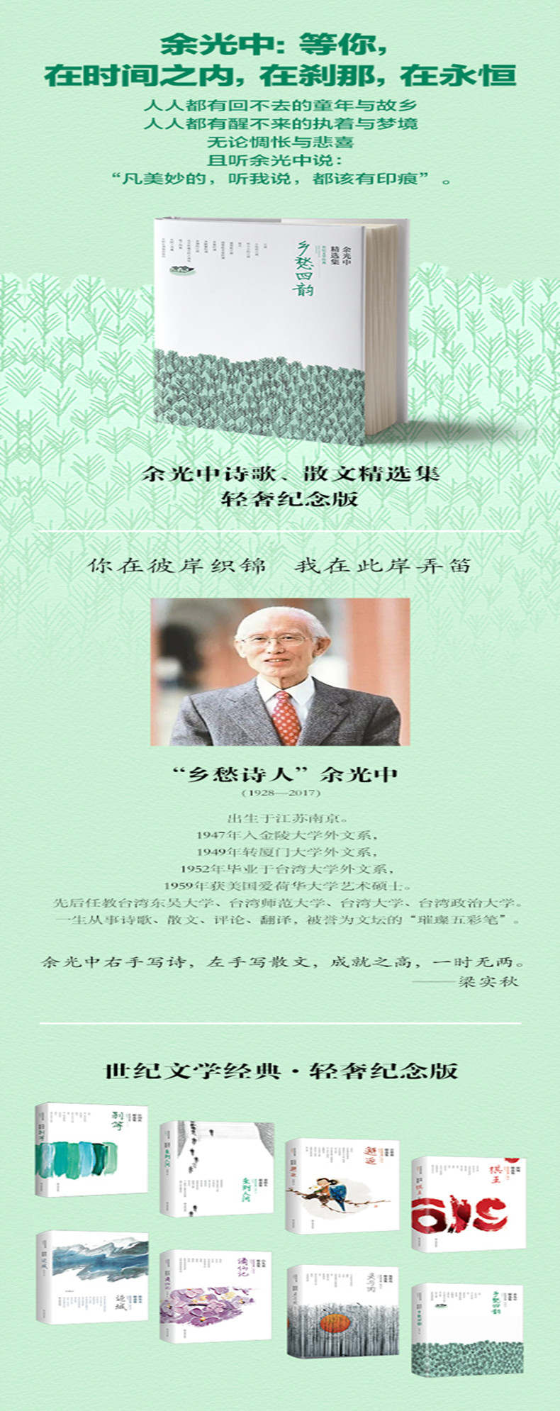 余光中先生是闻名华文文学界的诗人与散文大家。本书是他诗歌和散文代表作的精选集。余光中的诗融会了西方现代文化的灵性和中国传统文化的神韵,在传统与现代、历史与现实之间走出了一条属于自己的现代主义诗歌的创作道路,具有鲜明特征。他的诗构思巧妙、想象丰富、追求诗的整齐,讲究诗的和谐,强调诗的节奏韵律,创造了与中国语言文字特点相结合的民族化的诗歌艺术美,赋予了现代新诗活力。作为“诗质散文”的代表作家,余光中的散文跳出传统散文语言的窠臼,把现代艺术表现手法引入散文创作中,使散文具有现代诗的密度和张力。在建构异彩纷呈的语言形象过程中,他的散文语言运用密集型聚合的叠音、新颖的词汇和意象、多姿多变的语言节奏、综合运用多重修辞格方面,闪烁着余光中散文独具特色、富有魅力的语言风格。