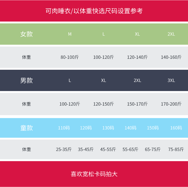 【规格】女装:M/L/XL/2XL;男装:L/XL/2XL/3XL;儿童110-160码男款:烟灰配色/天蓝配色