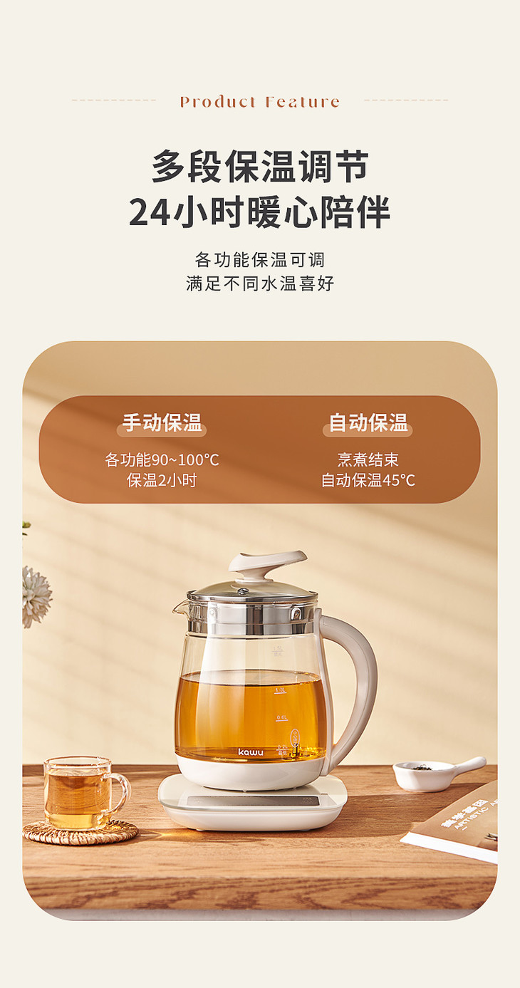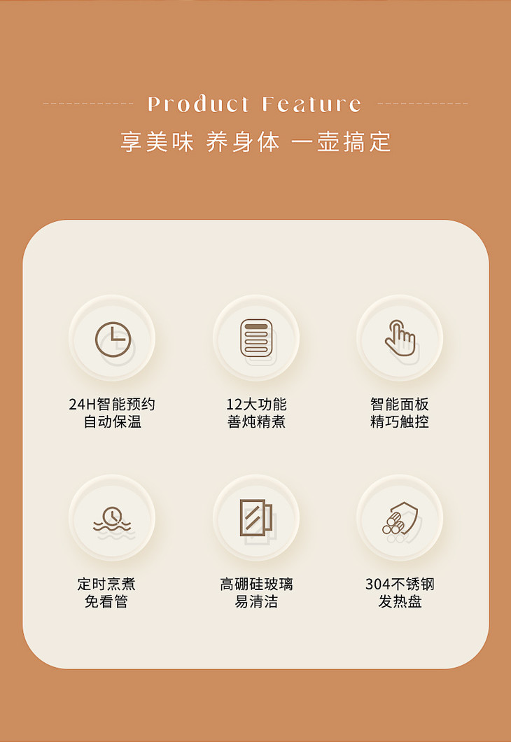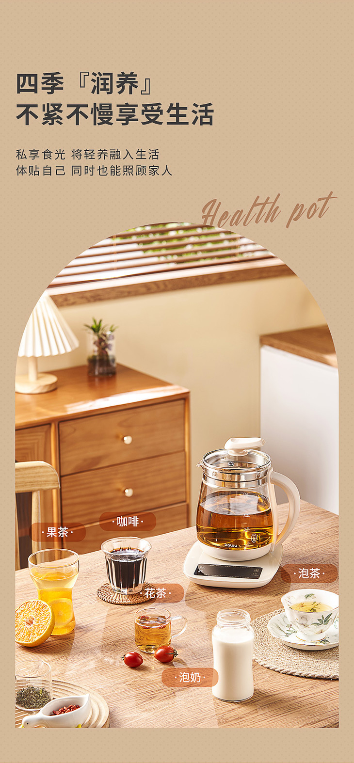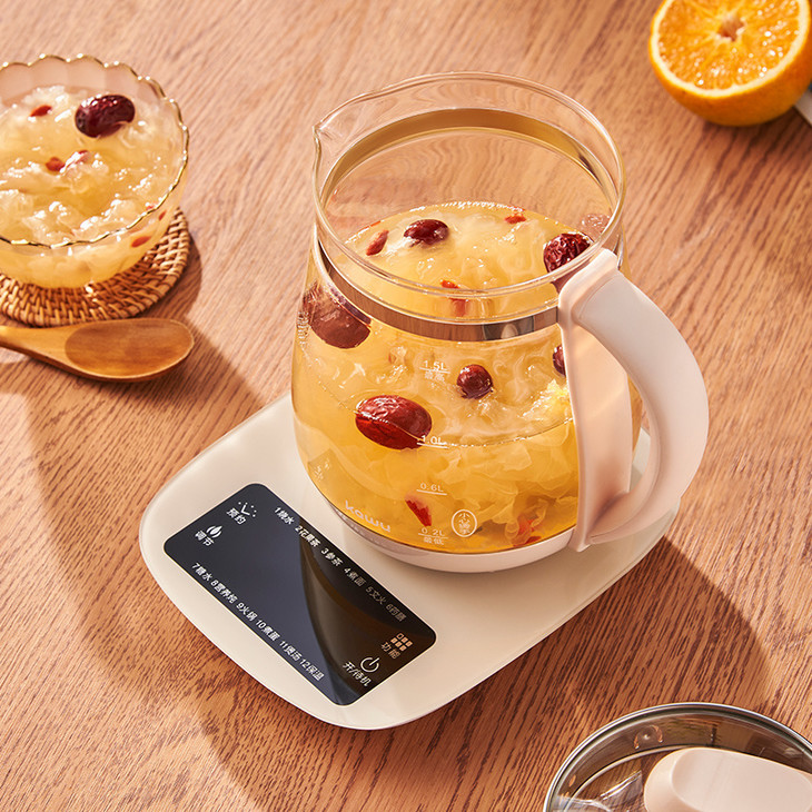 在办公室忙碌完,每个打工人都会想要喝一口温热茶水 当代年轻人的带薪润养新宠! 🔺1.5L精巧容量,办公居家都好用 🔺12大精设菜单,微电脑大面板灵敏触控 🔺±1°c精准控温,12H自动保温 🔺一壶多用,满足不同食材烹煮 🔺双重防溢,炖粥煲汤不用操心 用香甜的滋味,唤醒午后的困乏 滋补甜品轻松做,焕颜又补气血。