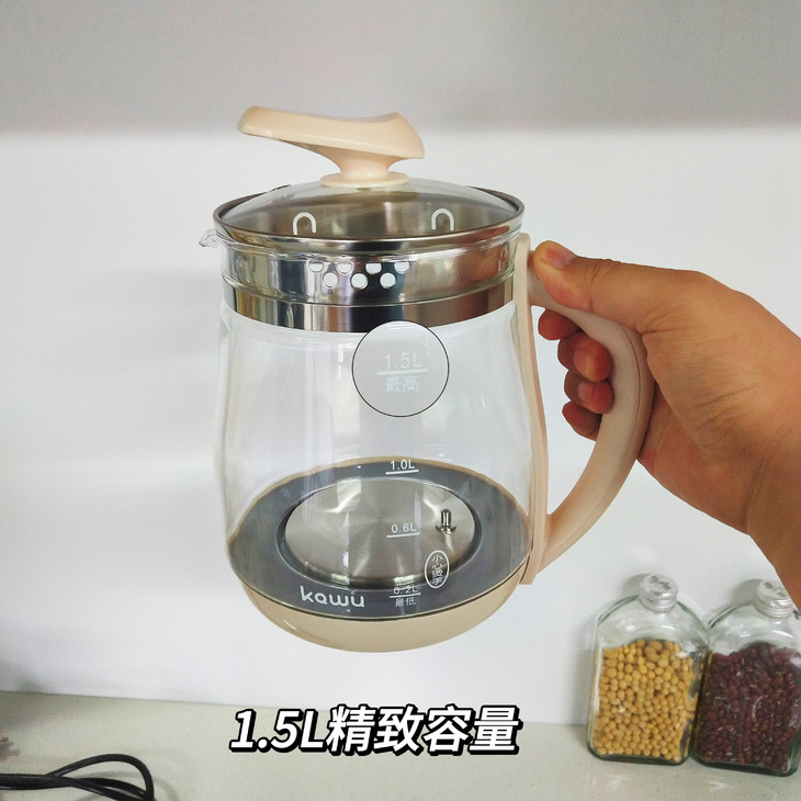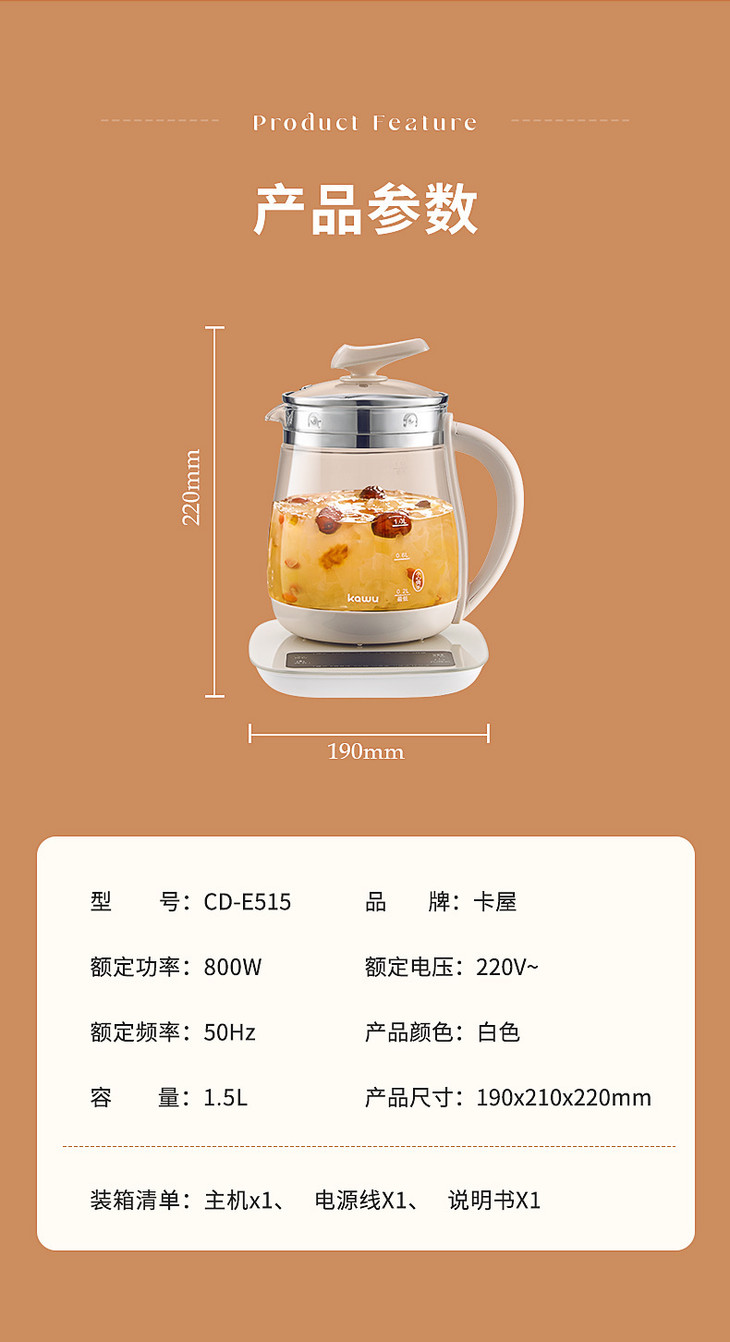 ✅容 量 :1.5L ✅材质:高硼硅玻璃,食品级304不锈钢材质 ✅主要功能 :烧水、花茶、煲汤、煲粥、糖水、药膳、果茶等等 ✅适用人群:厨房小白、学生党、老人、上班族等 ✅功率:800W ✅额定电源:220V~50Hz ✅产品名称:卡屋养生壶 (白色) ✅产品型号:CD-E515 ✅产品尺寸:190x210x220mm
