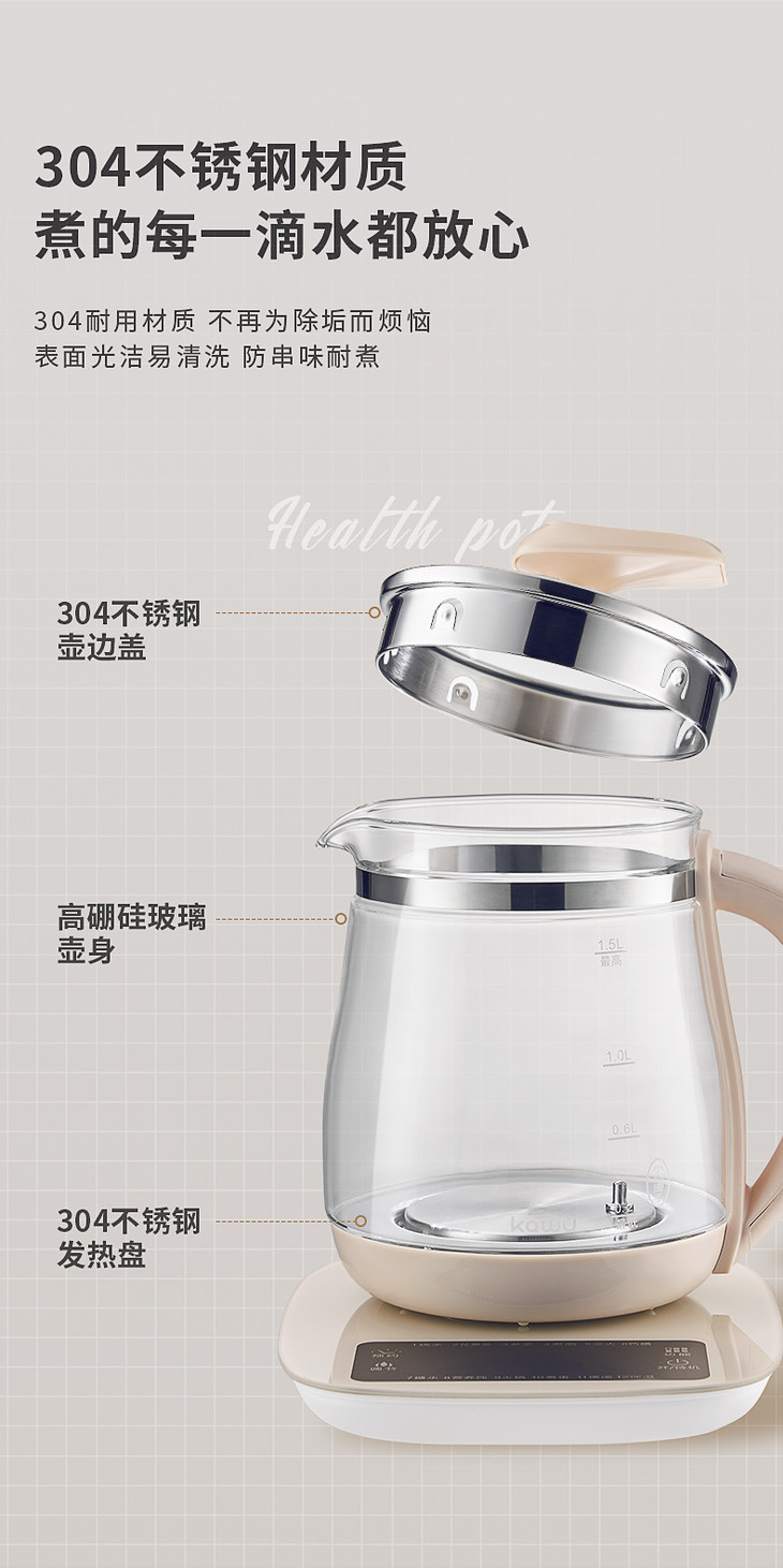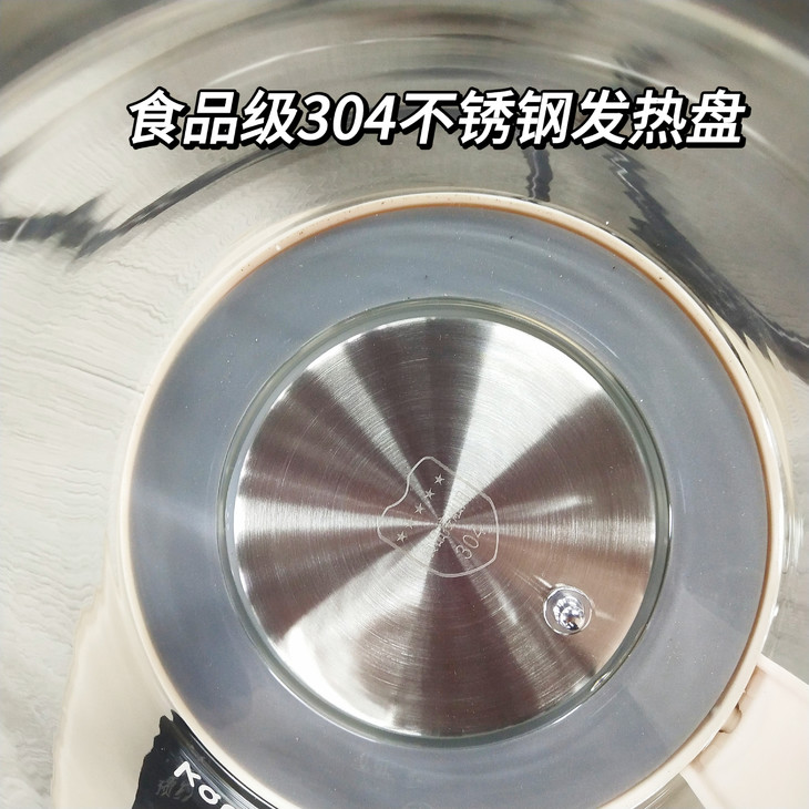 304不锈钢材质煮的每一滴水都放心 304不锈钢壶边盖 高硼硅玻璃壶身 304不锈钢发热盘 304耐用材质 不再为除垢而烦恼 表面光洁易清洗防串味耐煮
