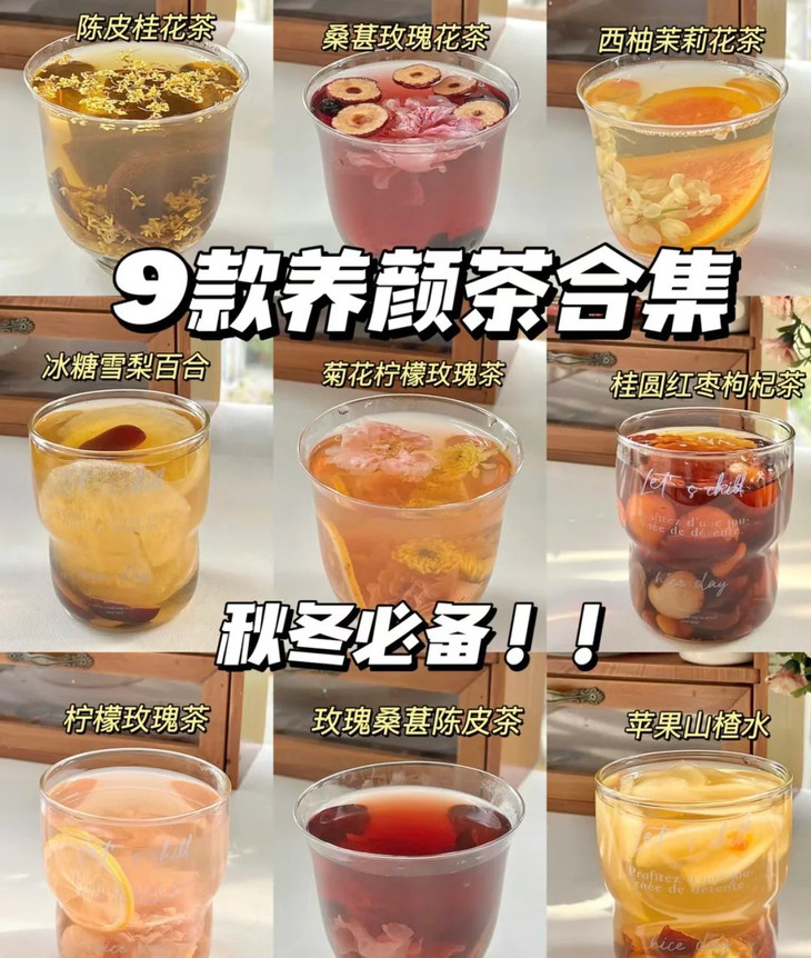 具体搭配看这里👇🏻 🔺清新口气:茉莉花、陈皮、冰糖、玫瑰花、绿茶 🔺润肤淡印:柠檬片、茉莉、玫瑰、菊花、冰糖 🔺提亮肤色:西柚、玫瑰、茉莉、冰糖 🔺疏肝顺气:洛神花、陈皮、玫瑰、红枣片、冰糖 🔺舒肝散结:无花果、玫瑰、冰糖、绿茶 🔺润肤养颜:百合、玫瑰、红枣干、冰糖 🔺生津止渴:百香果、无花果、柠檬、金桔、冰糖 🔺美容养颜:西柚、青桔、百香果、冰糖 🔺补气血:红糖块、玫瑰花、枸杞、红枣片