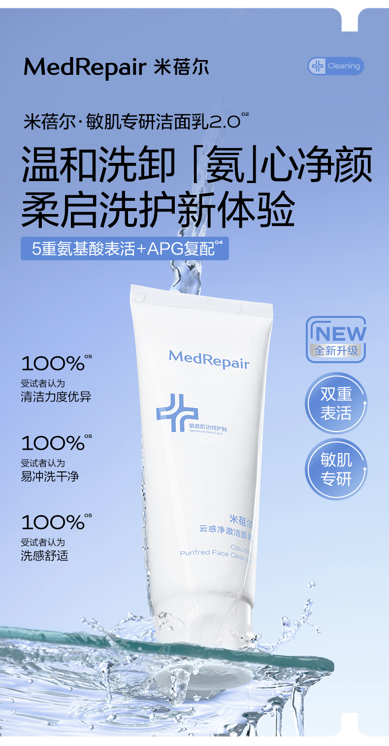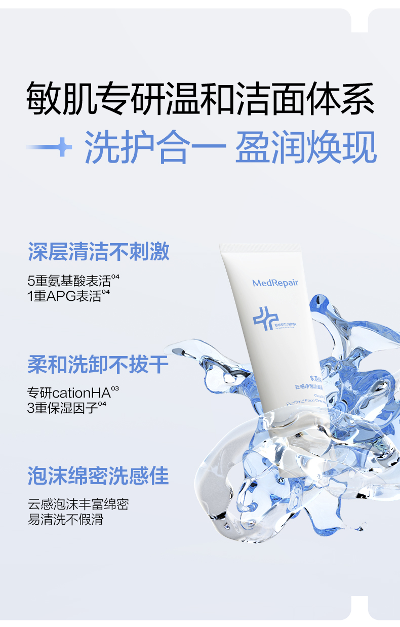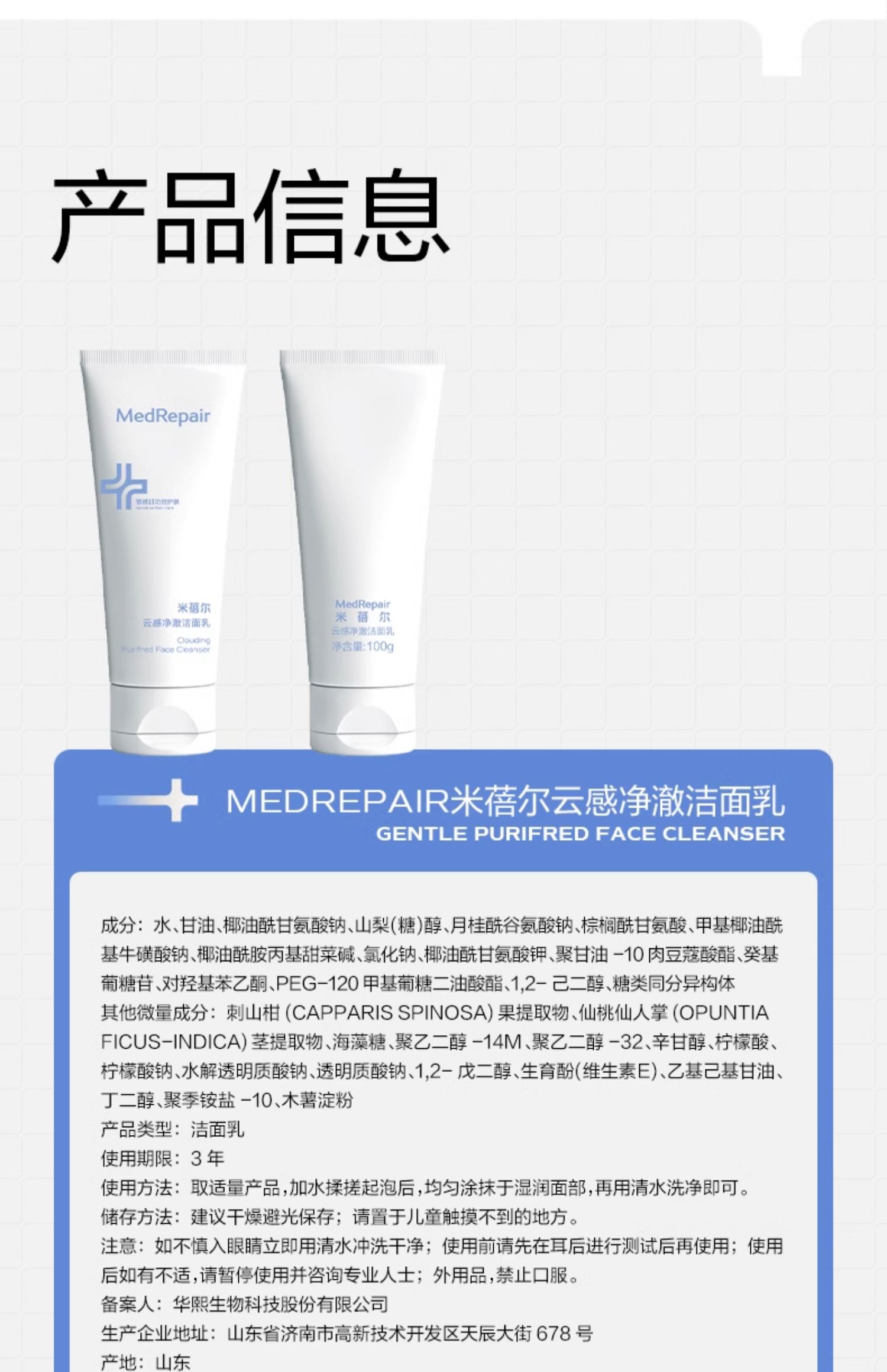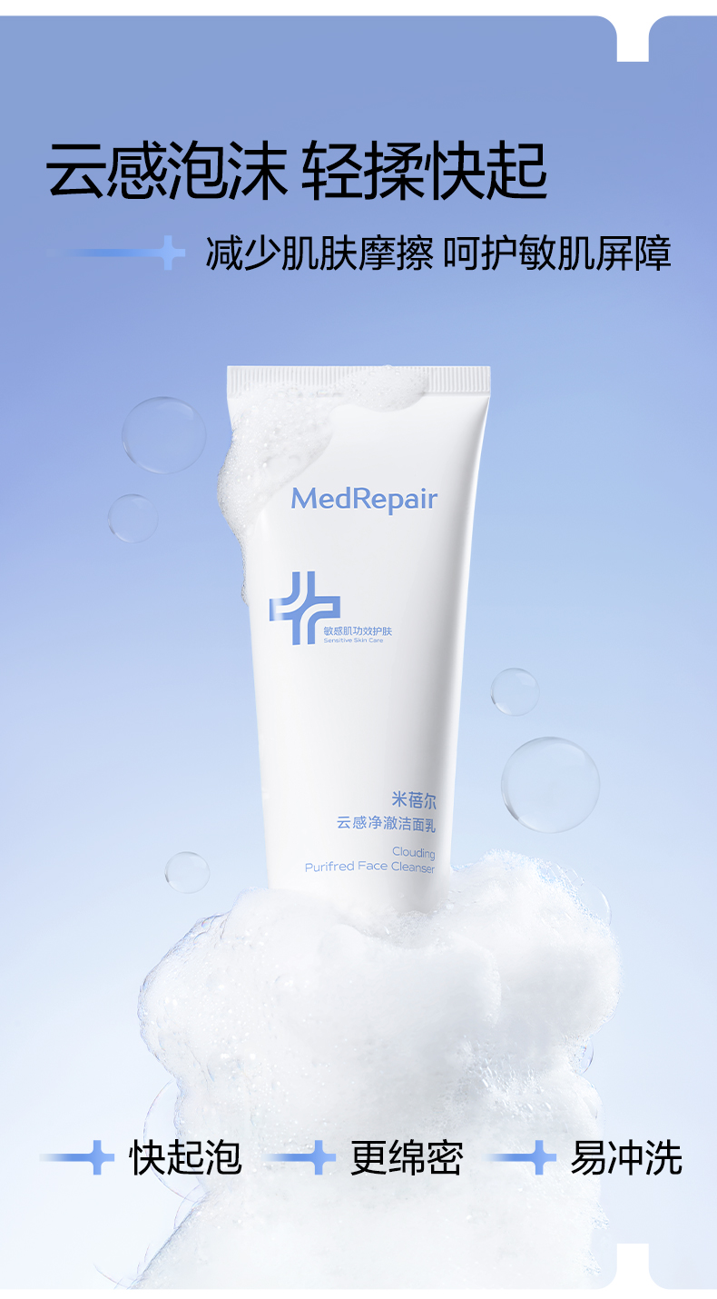 - 华熙生物集团旗下——米蓓尔MEDREPAIR,源自华熙生物多年潜心研发,“精于修复,专注美丽”为消费者解开敏肌密码,4D-HA四重活水创专利配方取代市场主成分,提供解决敏肌问题的方案。