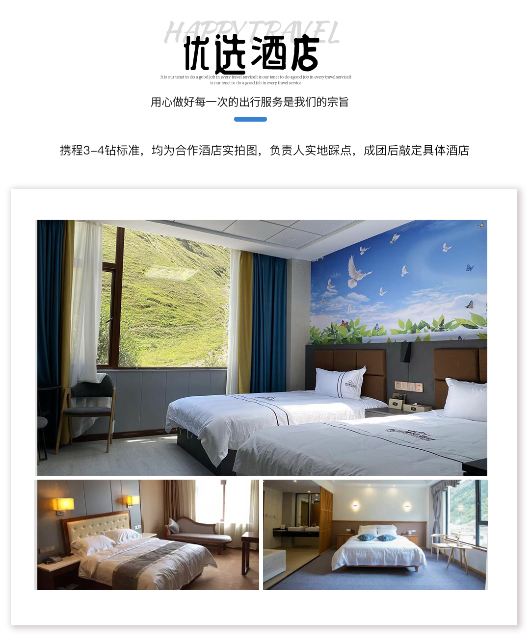 1、住宿:藏区条件非常有限,酒店住宿不能以城市酒店标准相衡量。住宿酒店为2人一间,房型为标间(2个1.2m的床)或大床房(1个1.5m的床)。入住前请检查房间的设备设施,如有问题请及时联系旅行社和酒店前台更换。