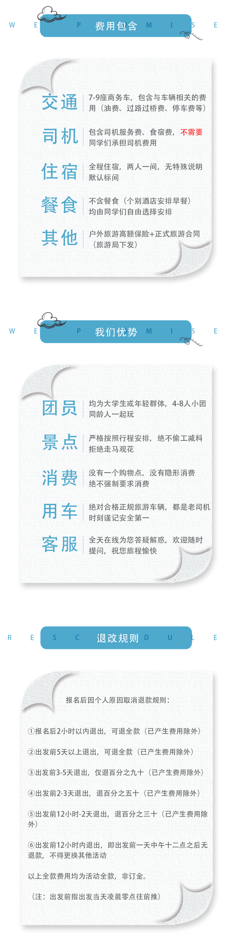 4、保险:我们会为队友们赠送国内游保险,不含高原险、财产险等其他的商业保险,队友们也可根据自己的需要自行购买。