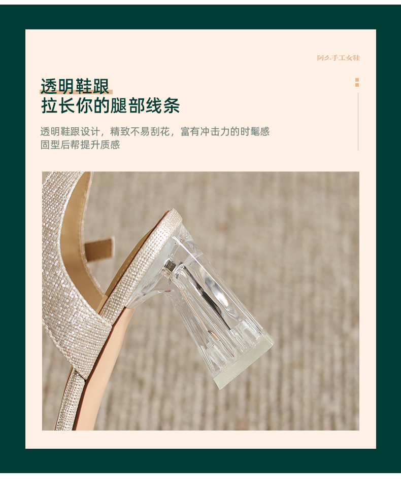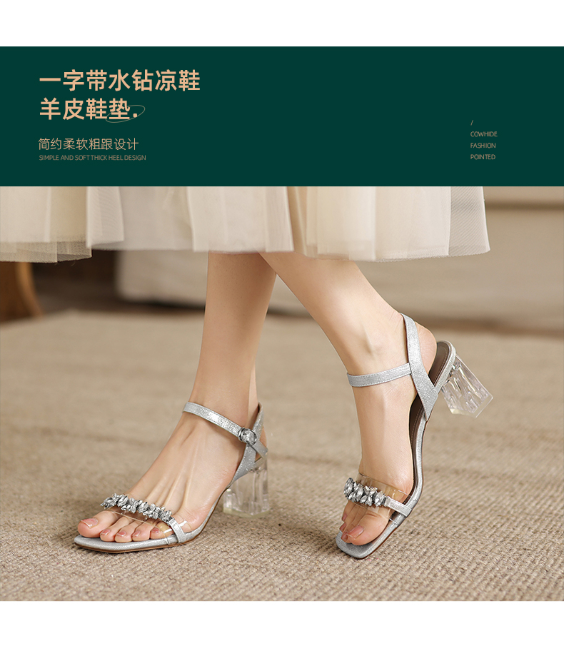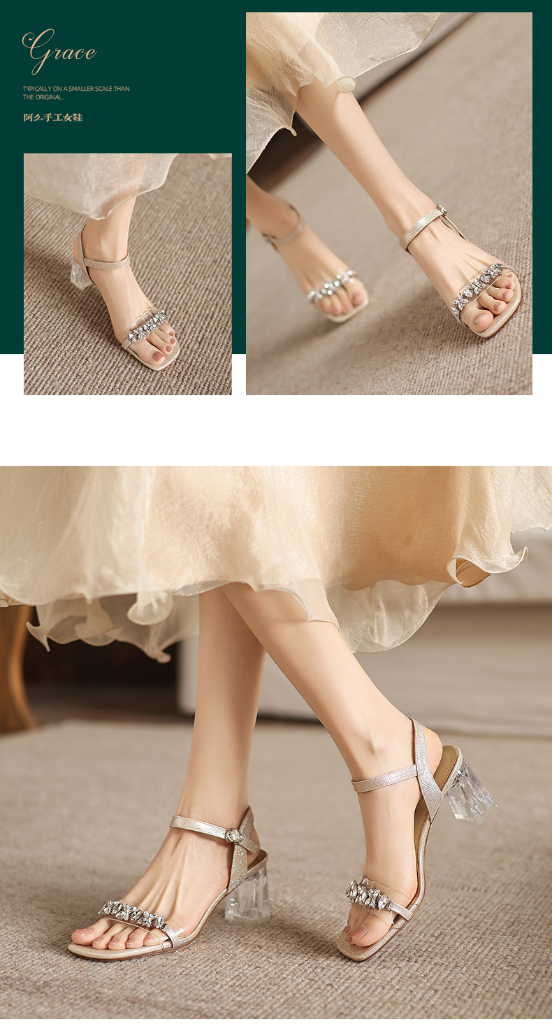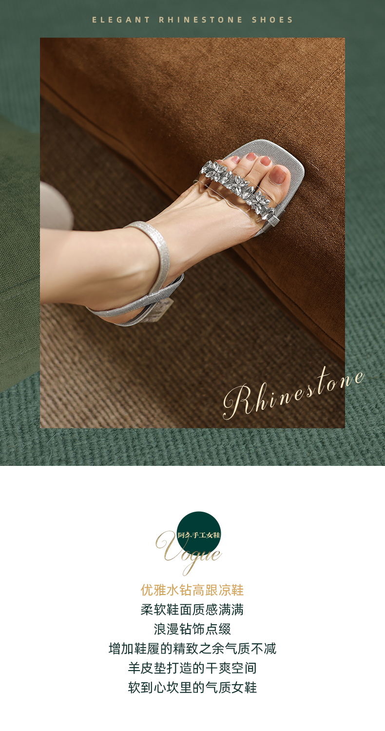 阿么手工女鞋法式透明一字带粗跟凉鞋女2026新款水钻高跟鞋6.5CM
