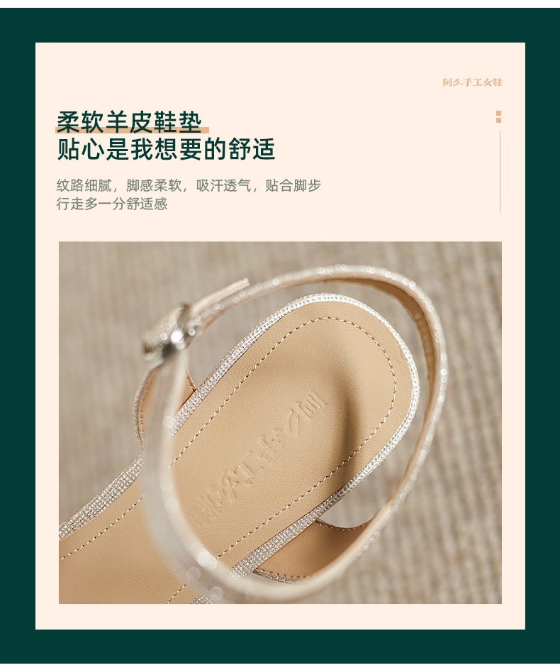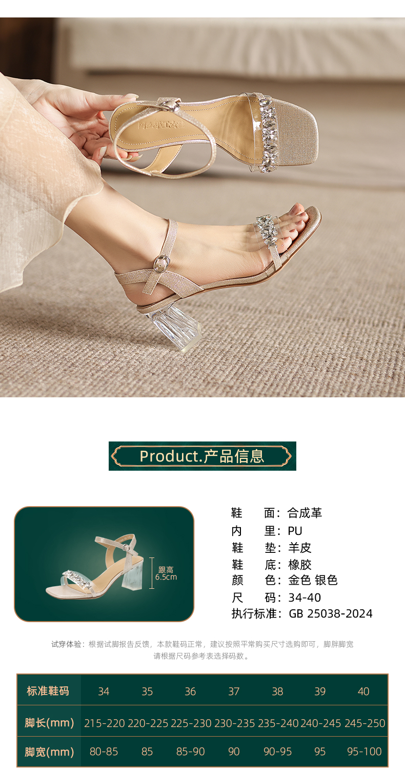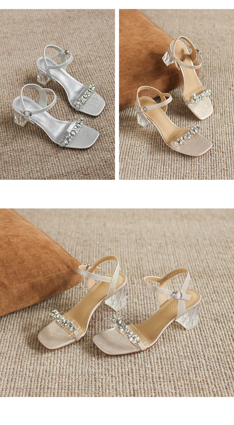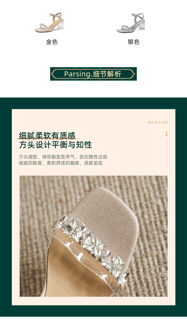 阿么手工女鞋法式透明一字带粗跟凉鞋女2026新款水钻高跟鞋6.5CM