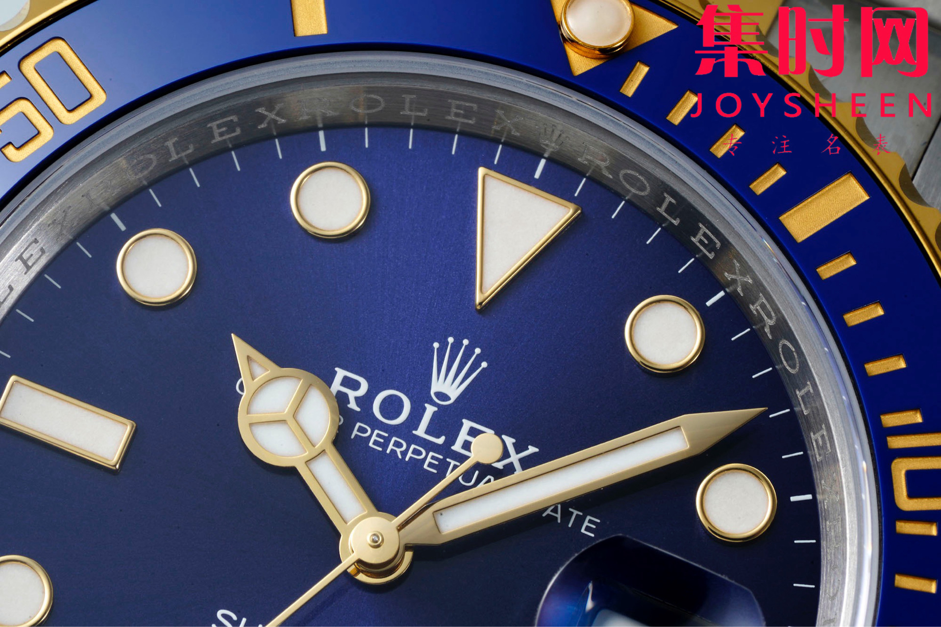 ·间金蓝水鬼:深海般的蓝色陶瓷圈口与表盘,色泽深邃、通透,随光线变化呈现迷人幻彩。与之搭配的金色,是劳力士特有的奢华暖金色调,绝非艳俗的亮黄,高贵而内敛。
