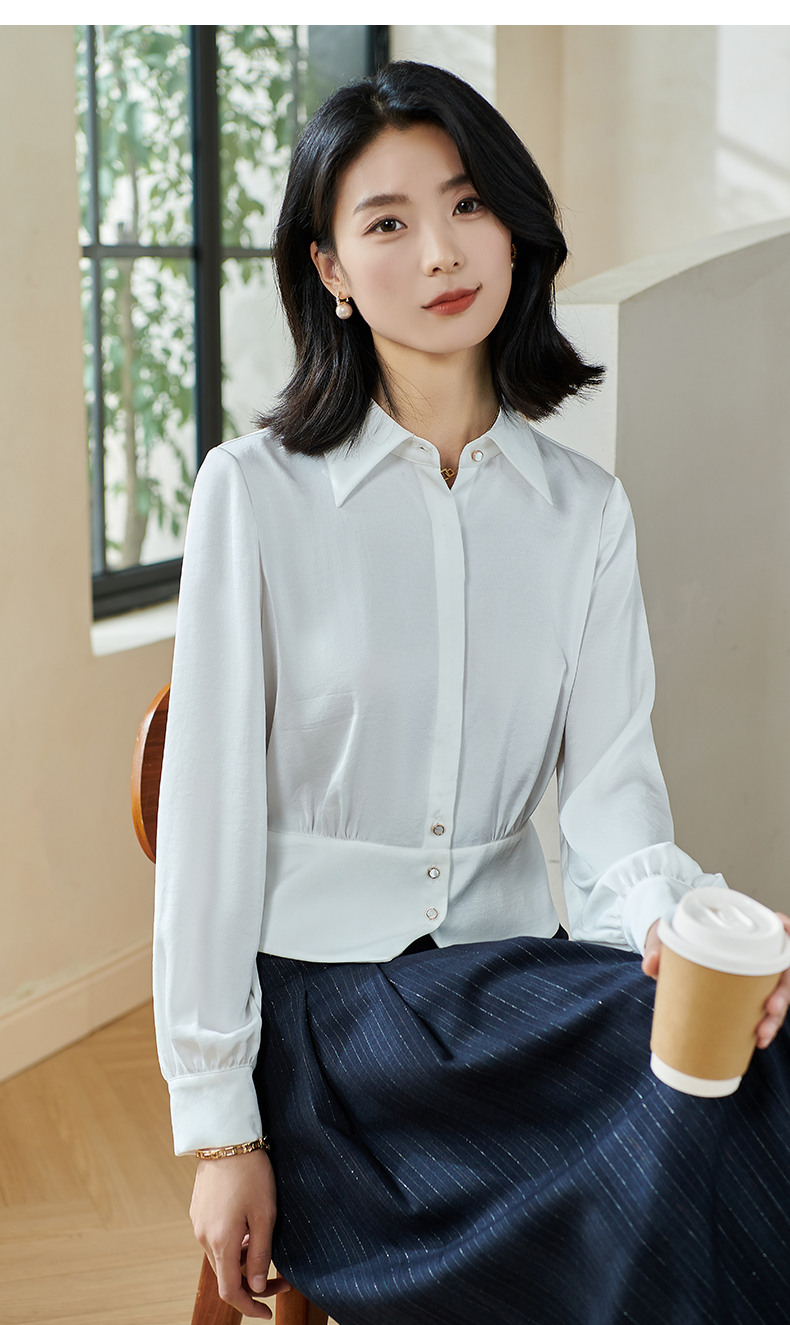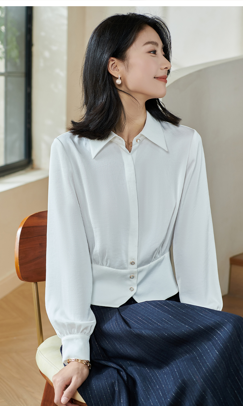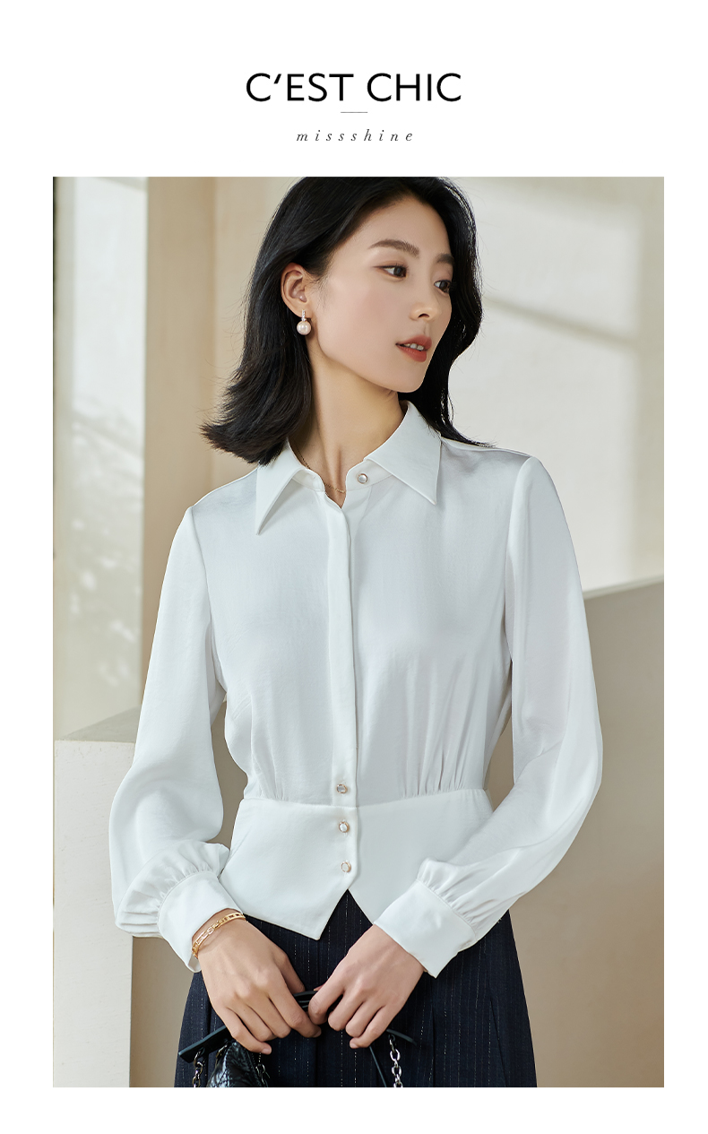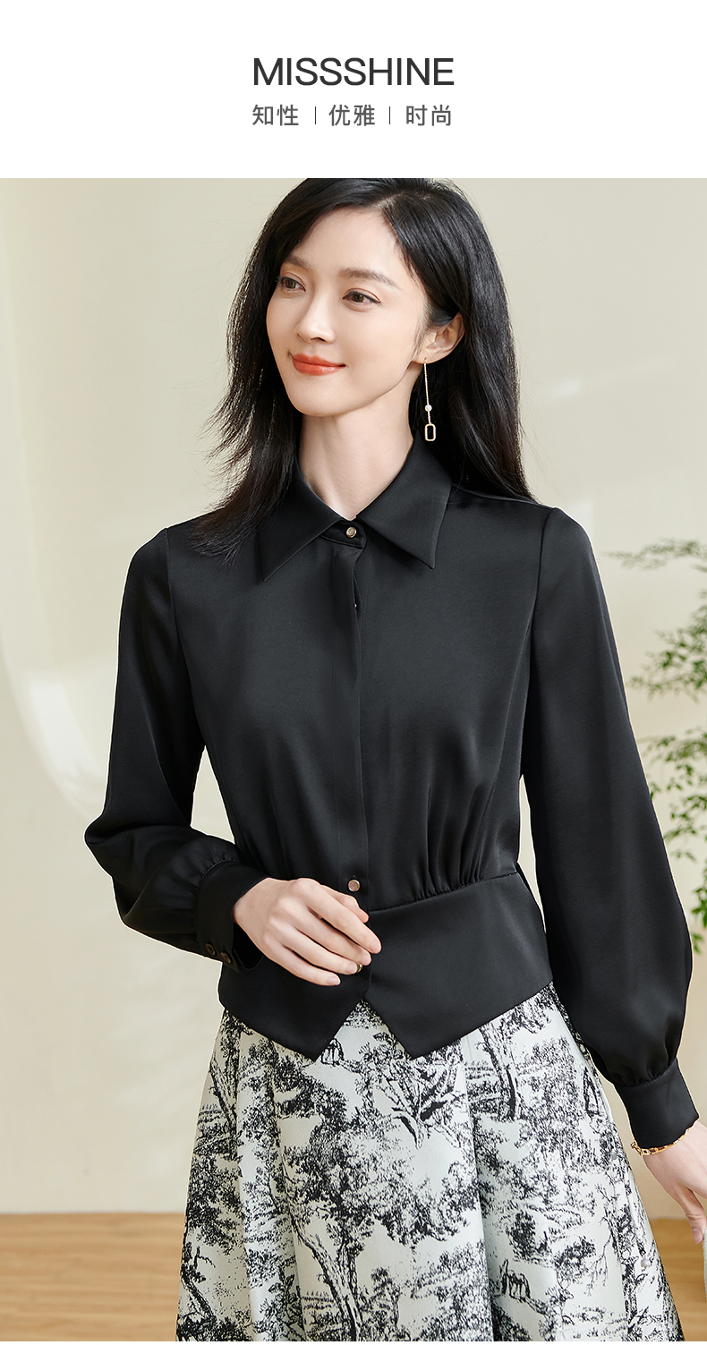 缎面垂坠质感 + 腰腹抽褶设计的「通勤显瘦神器」米思阳2026春季新款法式气质收腰纯色衬衫修身翻领设计感上衣0089