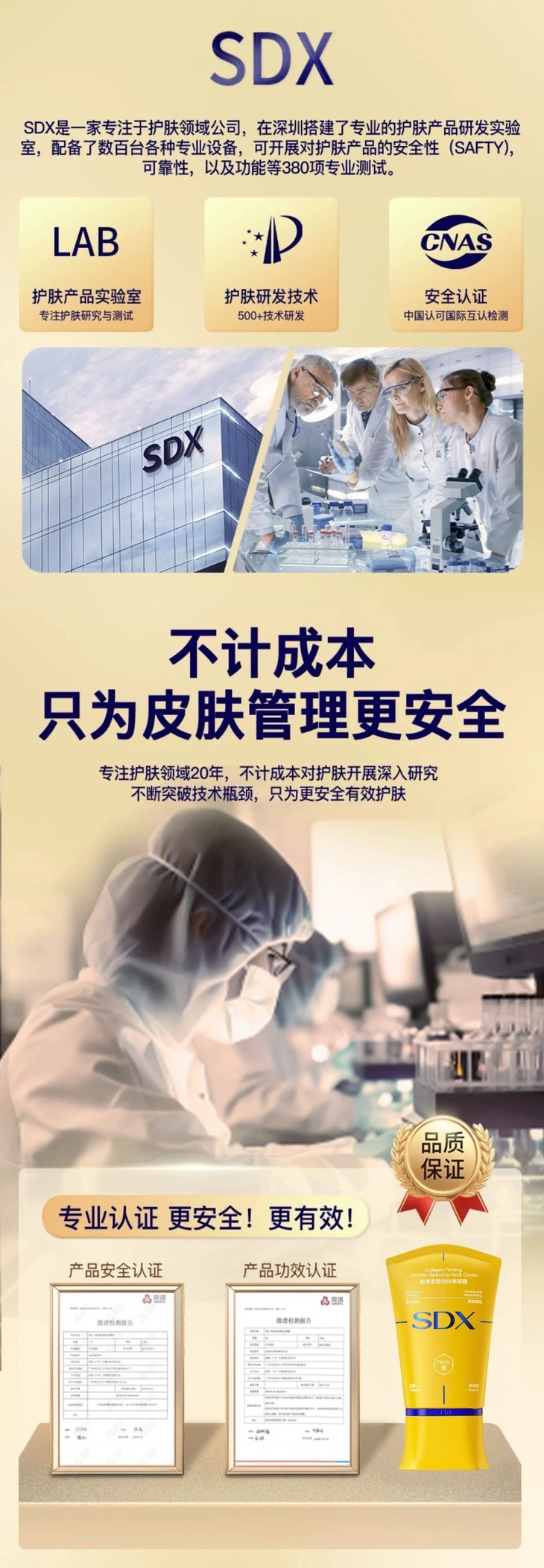 SDX实验室研发实力也是超级雄厚 以硬件设施、技术储备和权威认证为核心优势 专注于护肤领域的高效研发与品质保障 是其在行业内的核心竞争力 ✅100+专家研发,核心专利抗皱 ✅进口高活性配方,温和无刺激 ✅精准淡纹紧致,科学验证安全有效 非常适合颈纹明显或肌肤松弛的家人们 一定要试试SDX胶原小金管!