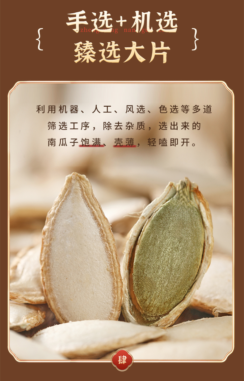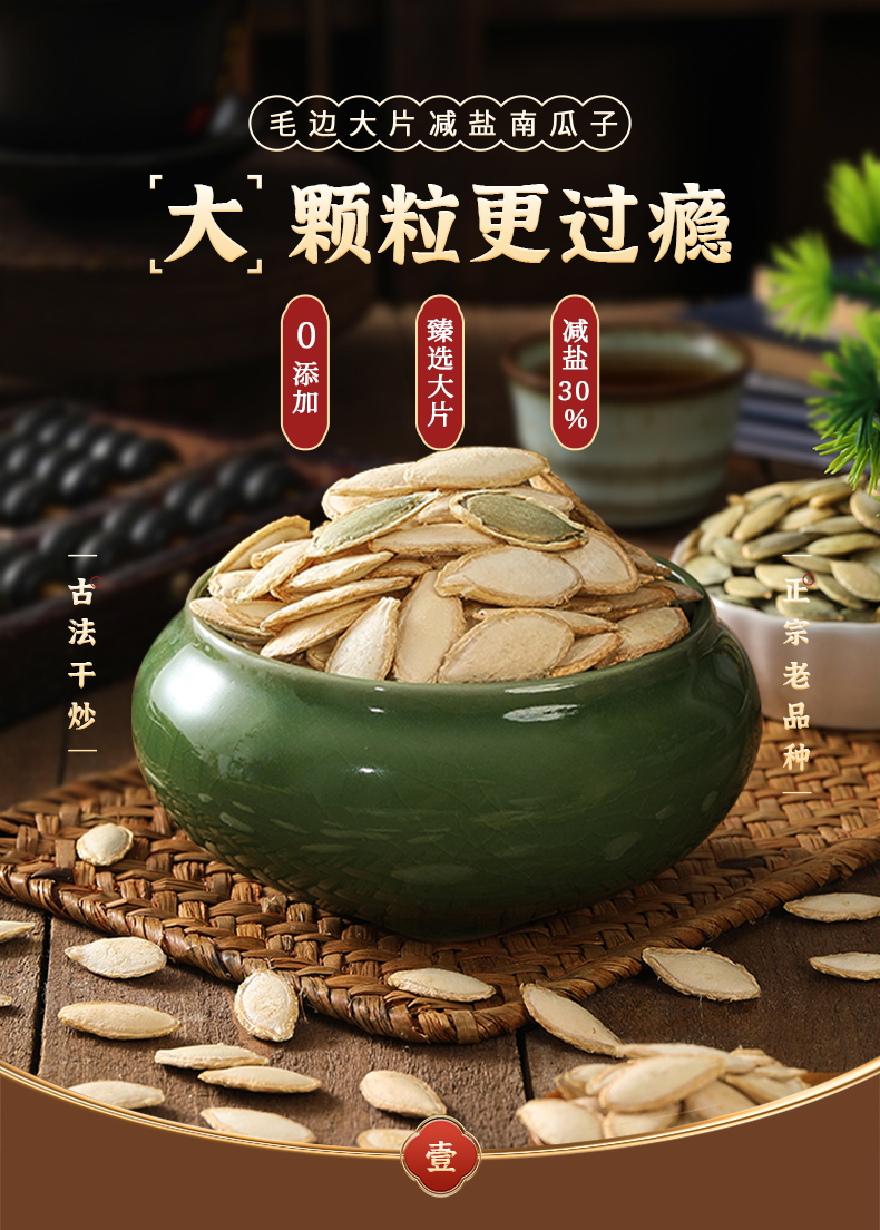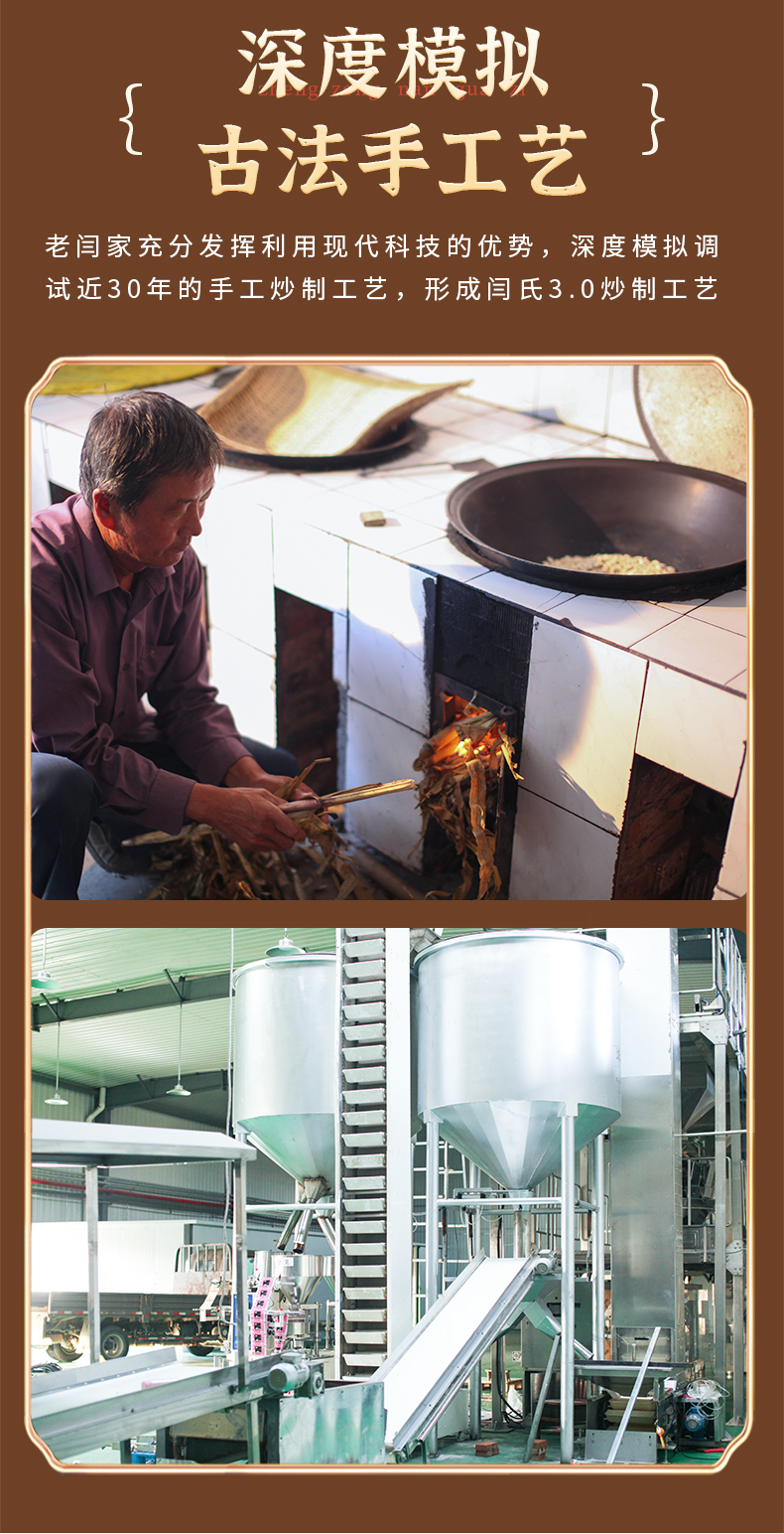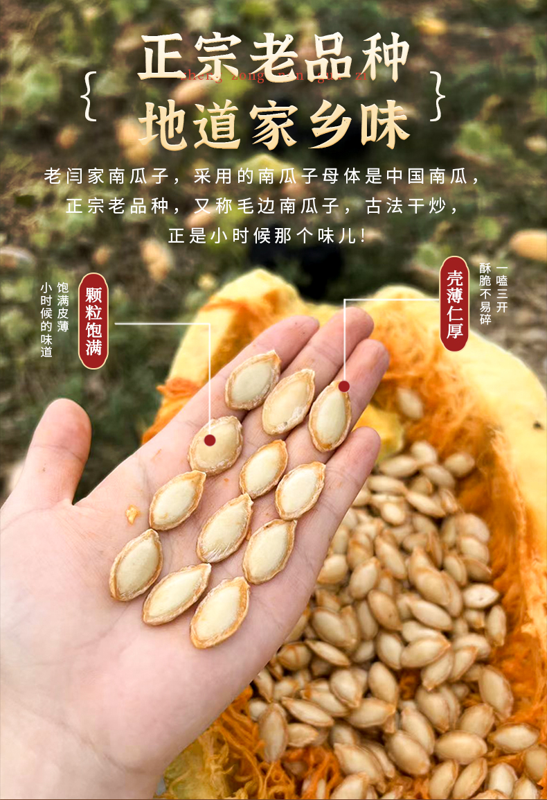 老闫家南瓜子三代人用心坚守每一颗南瓜子执行同一个标准,严选产区,15道工序,坚持古法炒制10次,层层质检严控,只为每一颗好南瓜子。