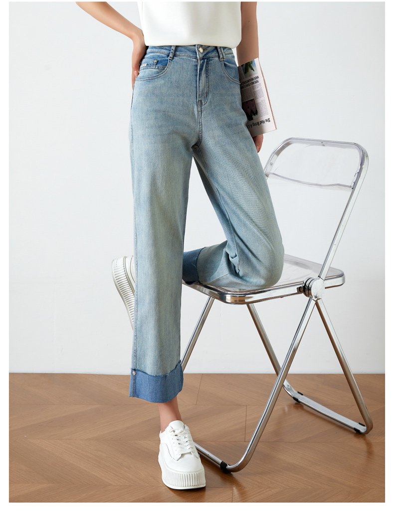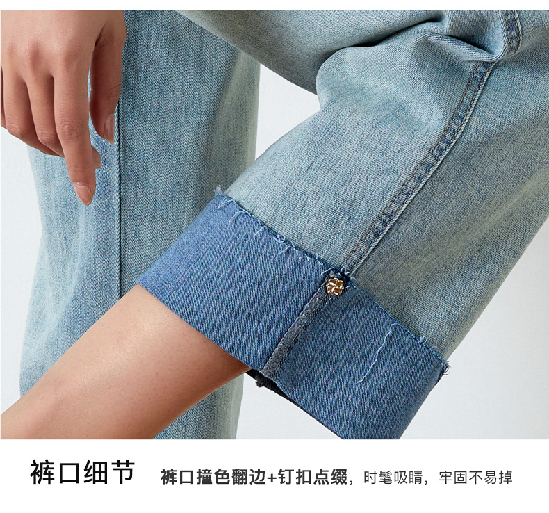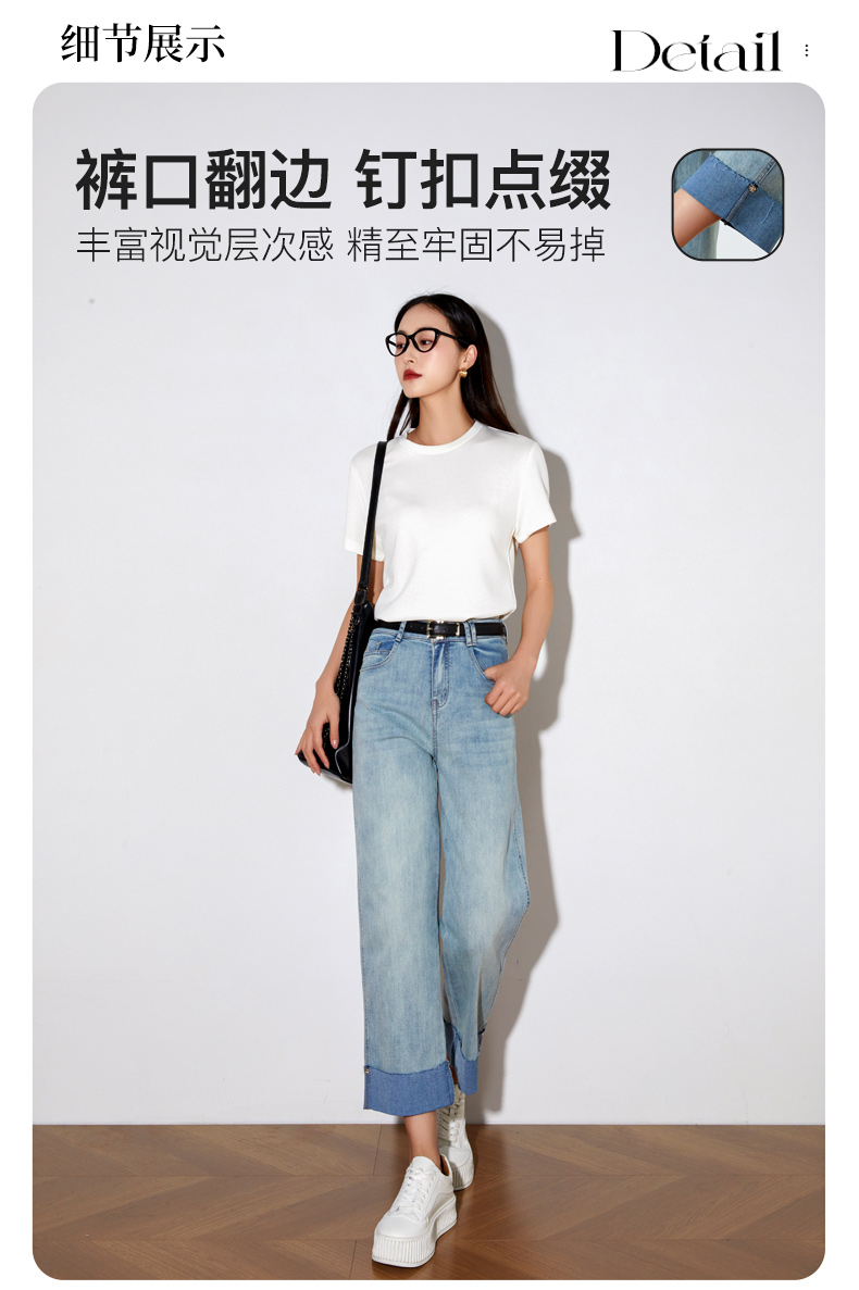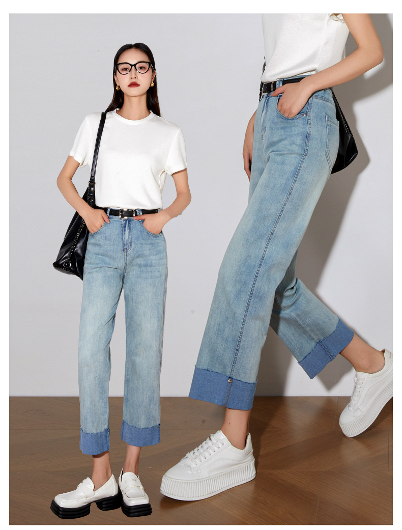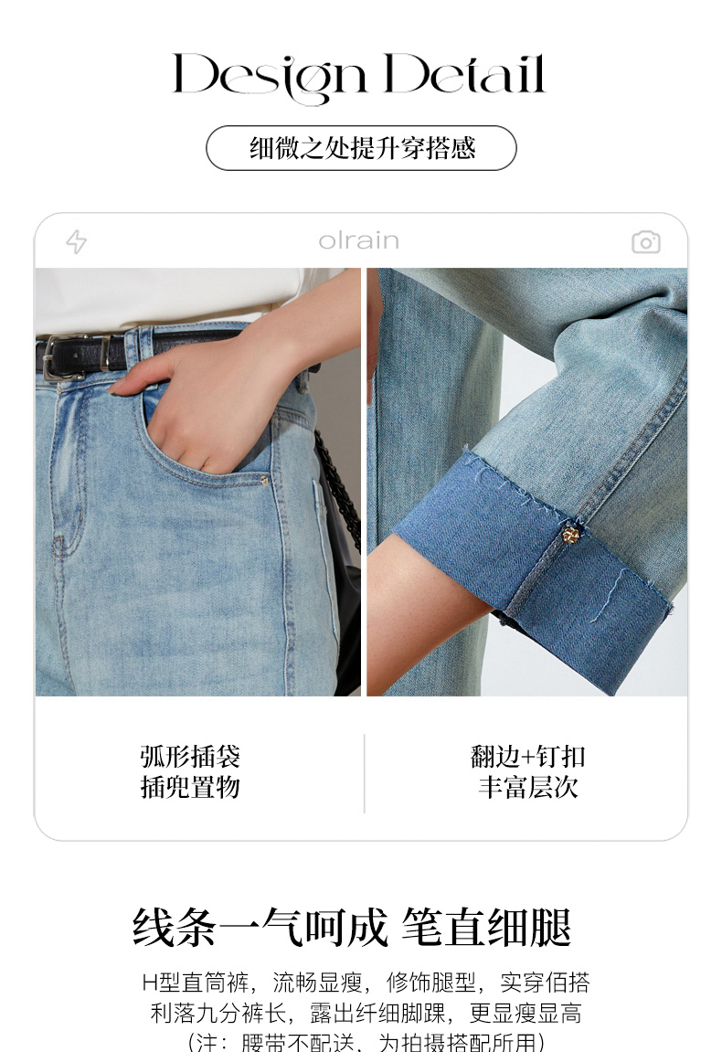 OLrain欧芮儿浅蓝色牛仔裤女夏季2025年新款翻遍直筒九分长裤