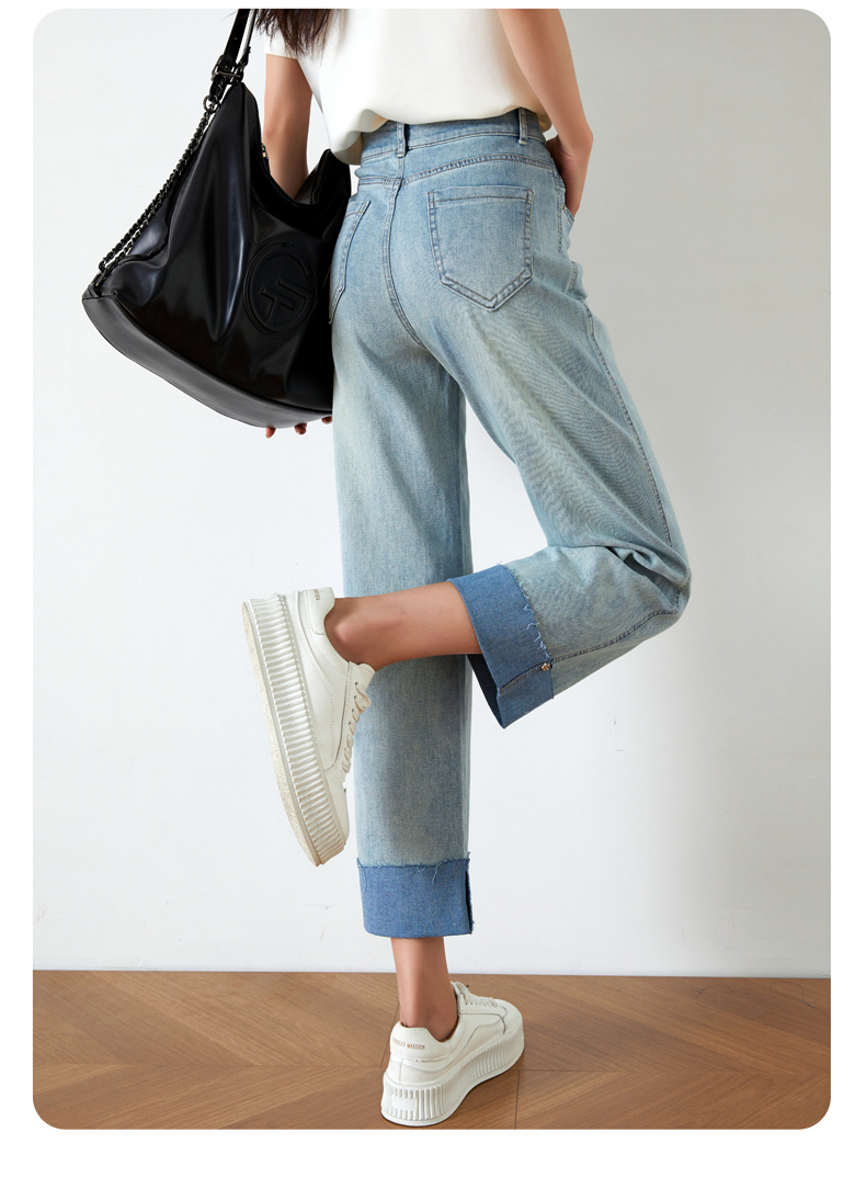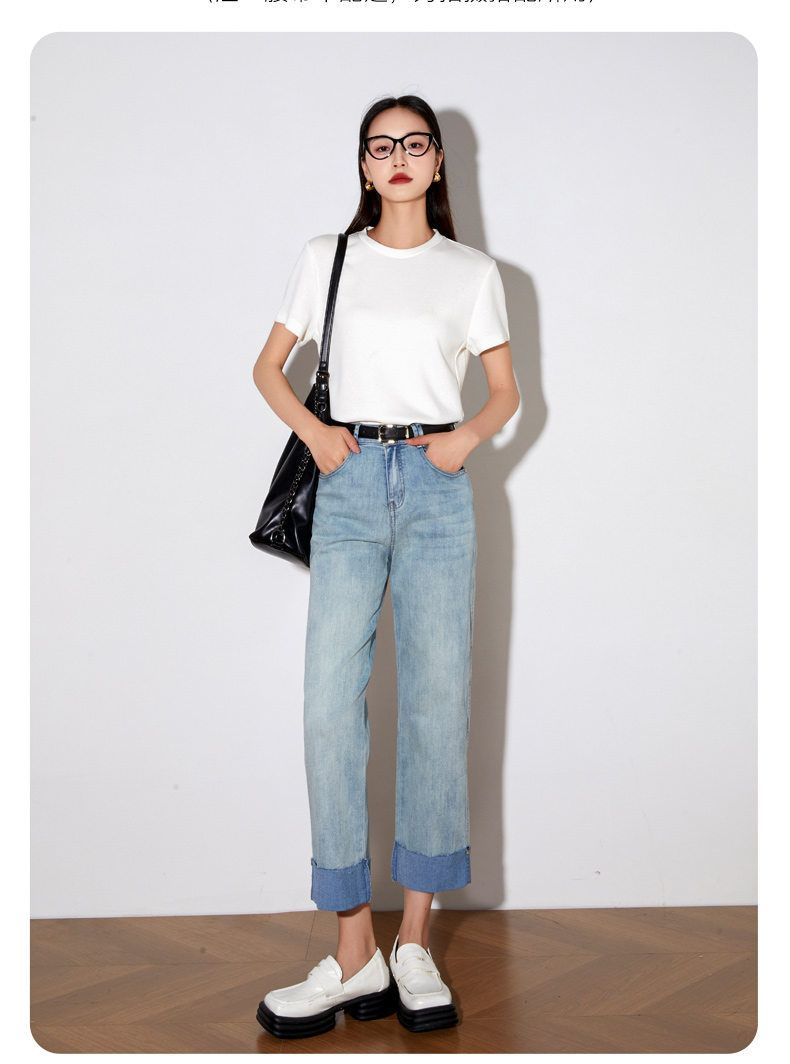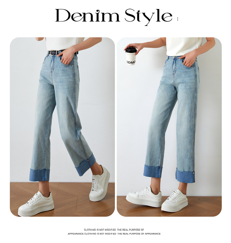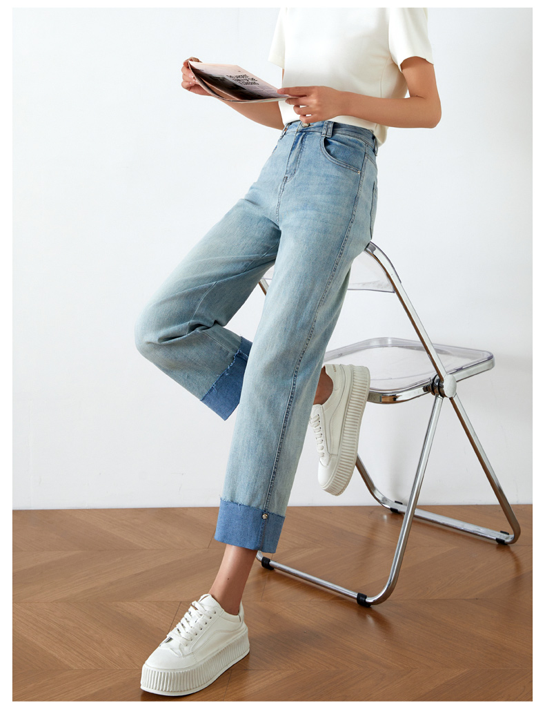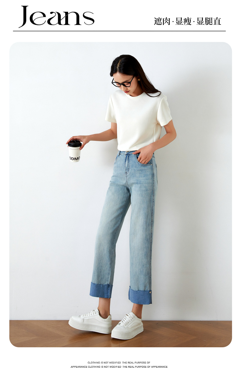 OLrain欧芮儿浅蓝色牛仔裤女夏季2025年新款翻遍直筒九分长裤